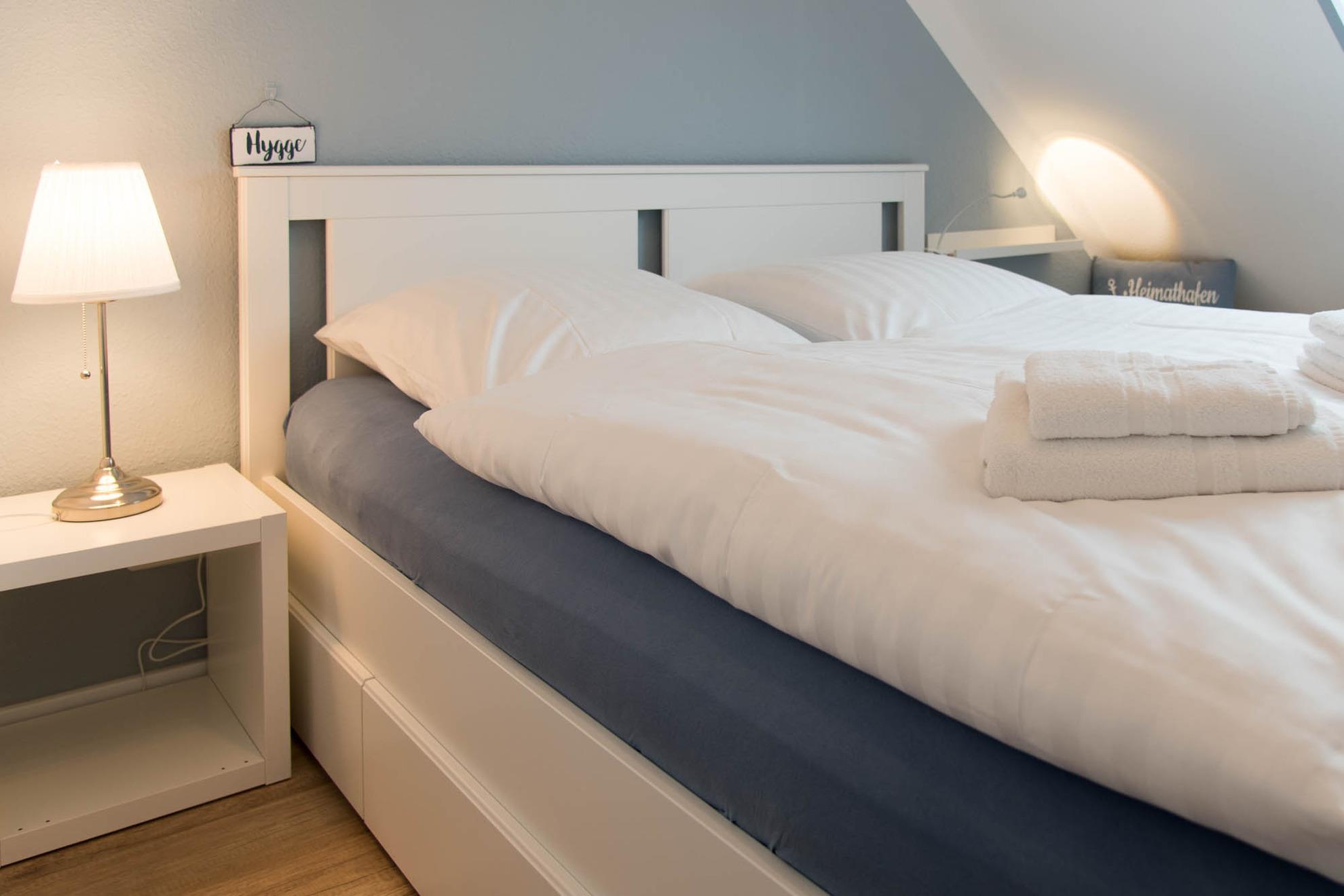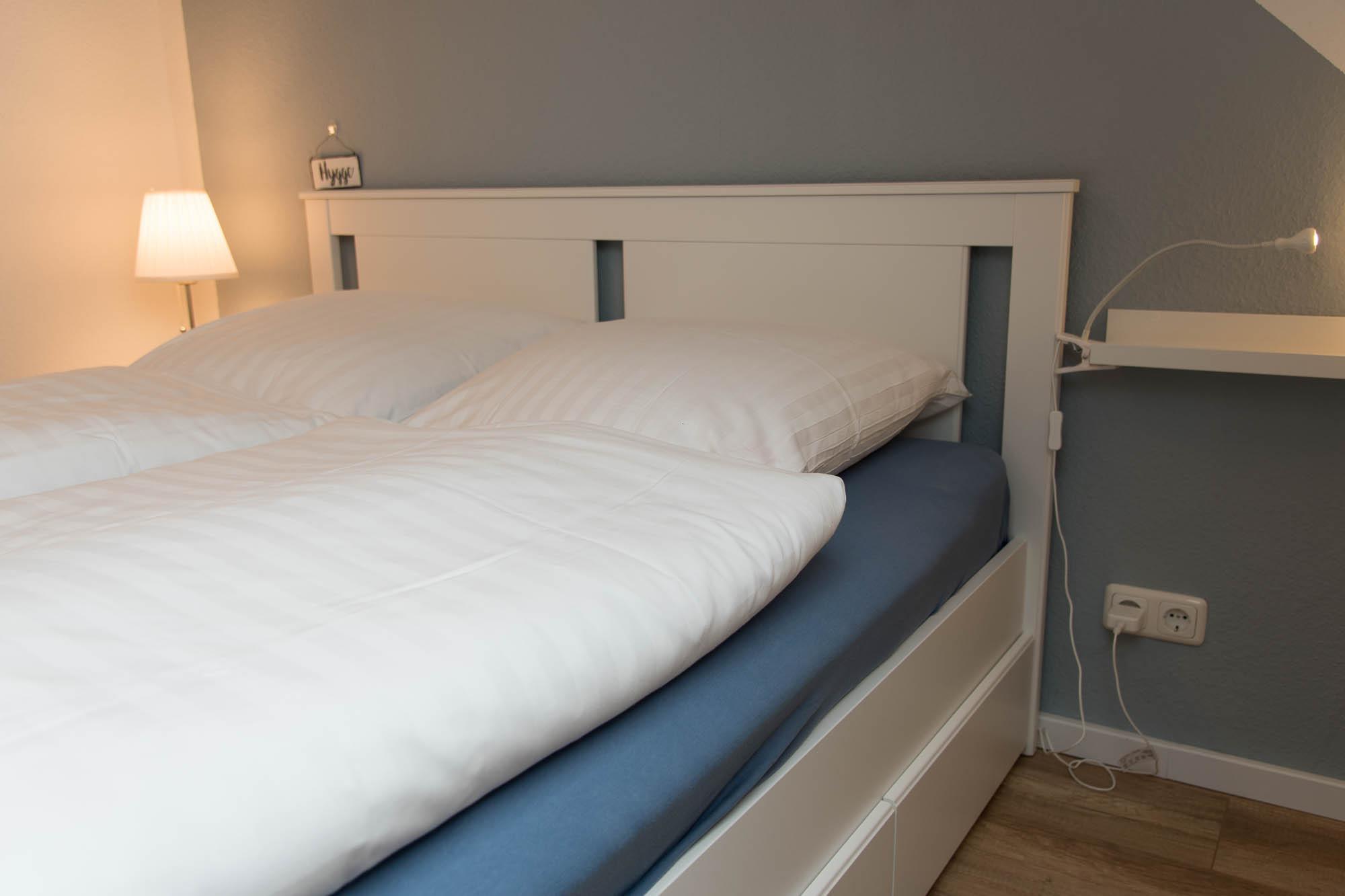 Schlafzimmer - Koje I beherbergt ein Doppelbett von 160 cm x 200 cm mit zwei neuen Matratzen (H2). Besonders die Dachschräge mit dem großen Lichtband gibt dem Raum seine Gemütlichkeit und seinen Namen. Beim Betteinstieg an der Fensterseite ist etwas Aufmerksamkeit ratsam, um sich nicht den Kopf zu stoßen. Wenn man im Bett liegt, kann man mit Blick in Richtung Förde wunderbar träumen.