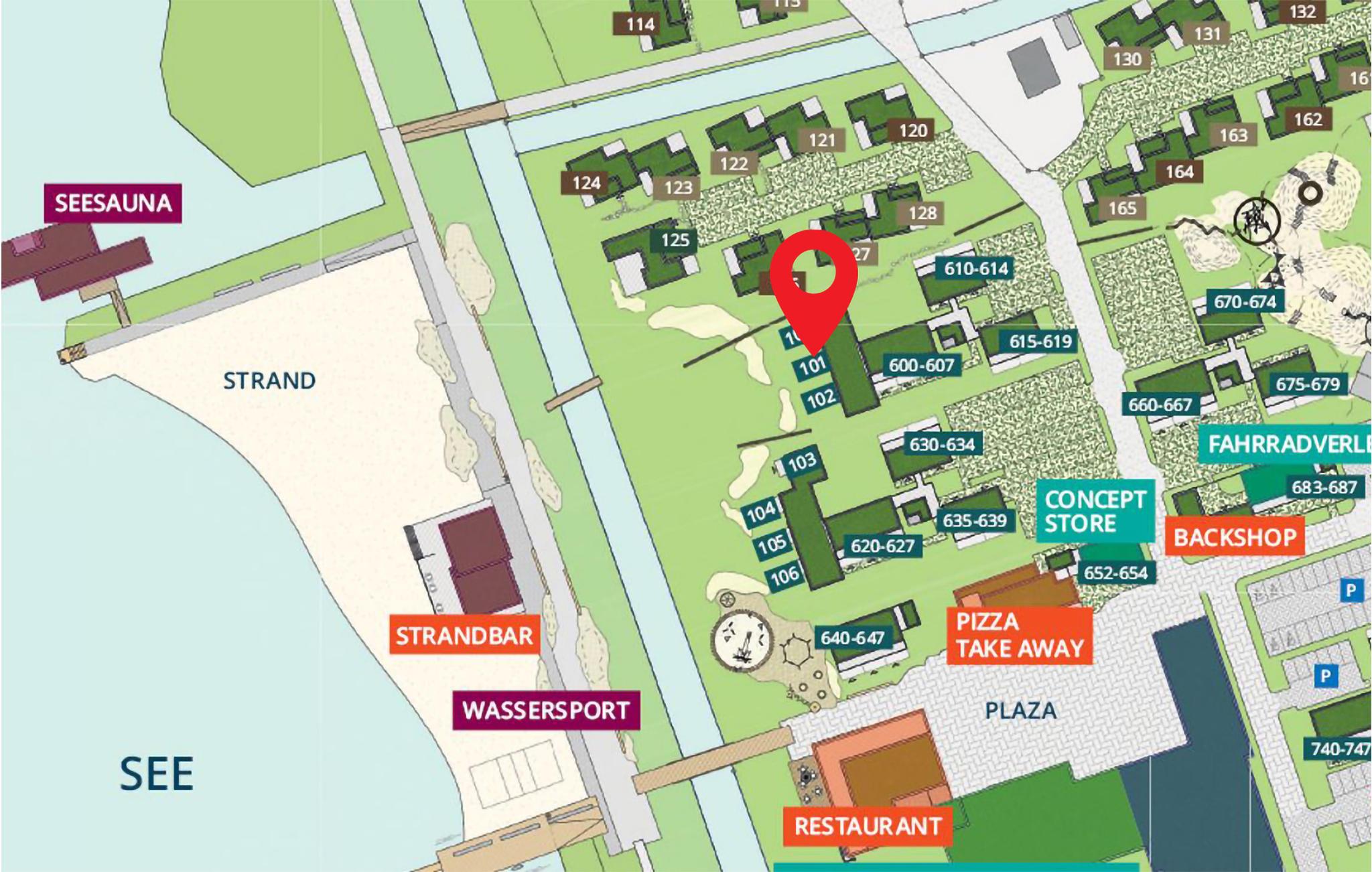 Takket være de gastronomiske tilbudene som strandkafeen BEACHMAR eller bufférestauranten MEZZOMAR, som begge ligger rett ved vannkanten, kan du nyte delikatesser i ro og mak hjemme hos deg selv. Det finnes også et minimarked (smørbrød, regionale produkter) og en SEEKONTOR-butikk (konseptbutikk for mote, boligtilbehør, livsstil og nytelse). På det store torget rett ved innsjøen ligger konferanse- og arrangementssenteret samt det romslige bade- og badstueområdet.
