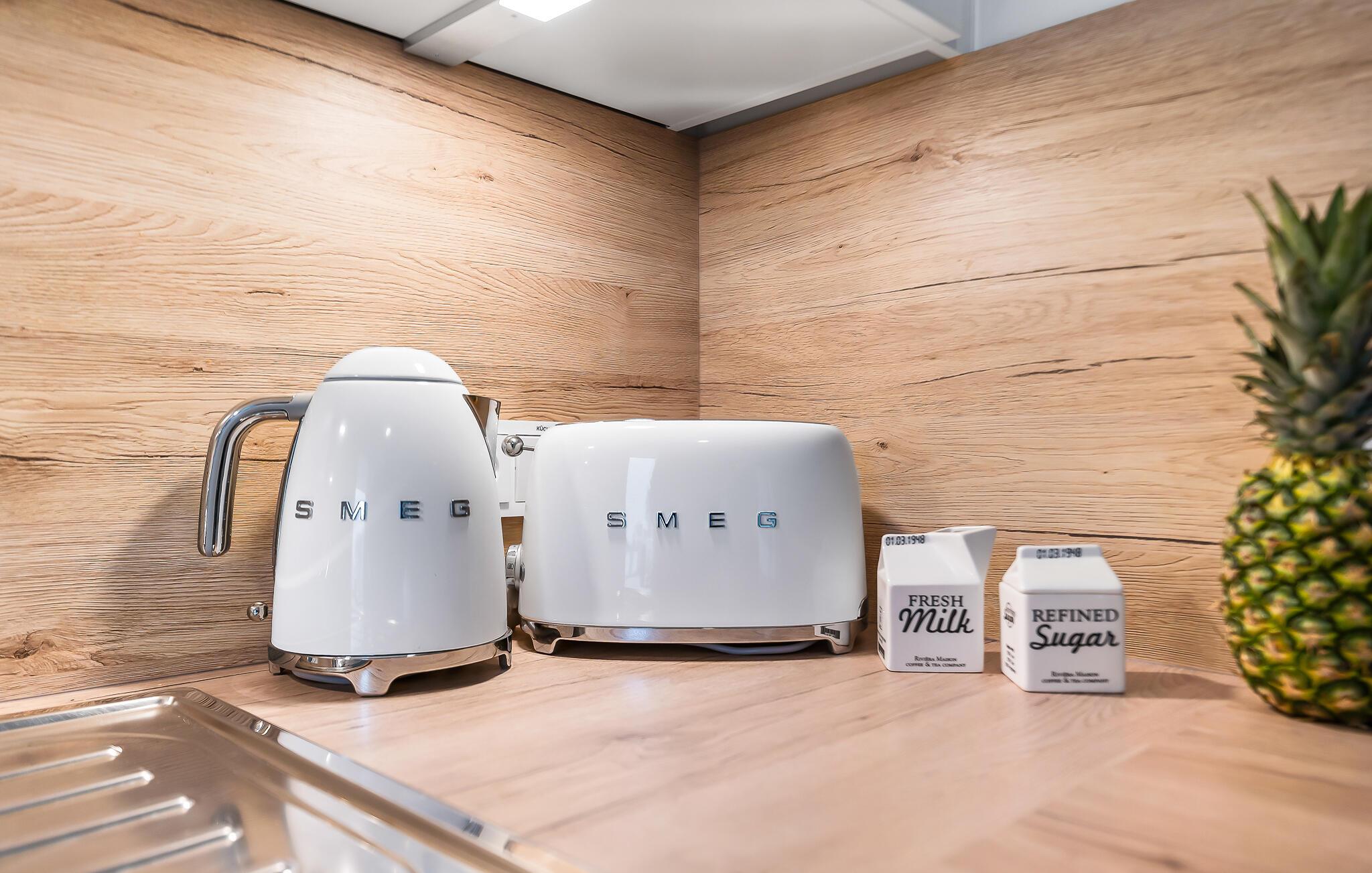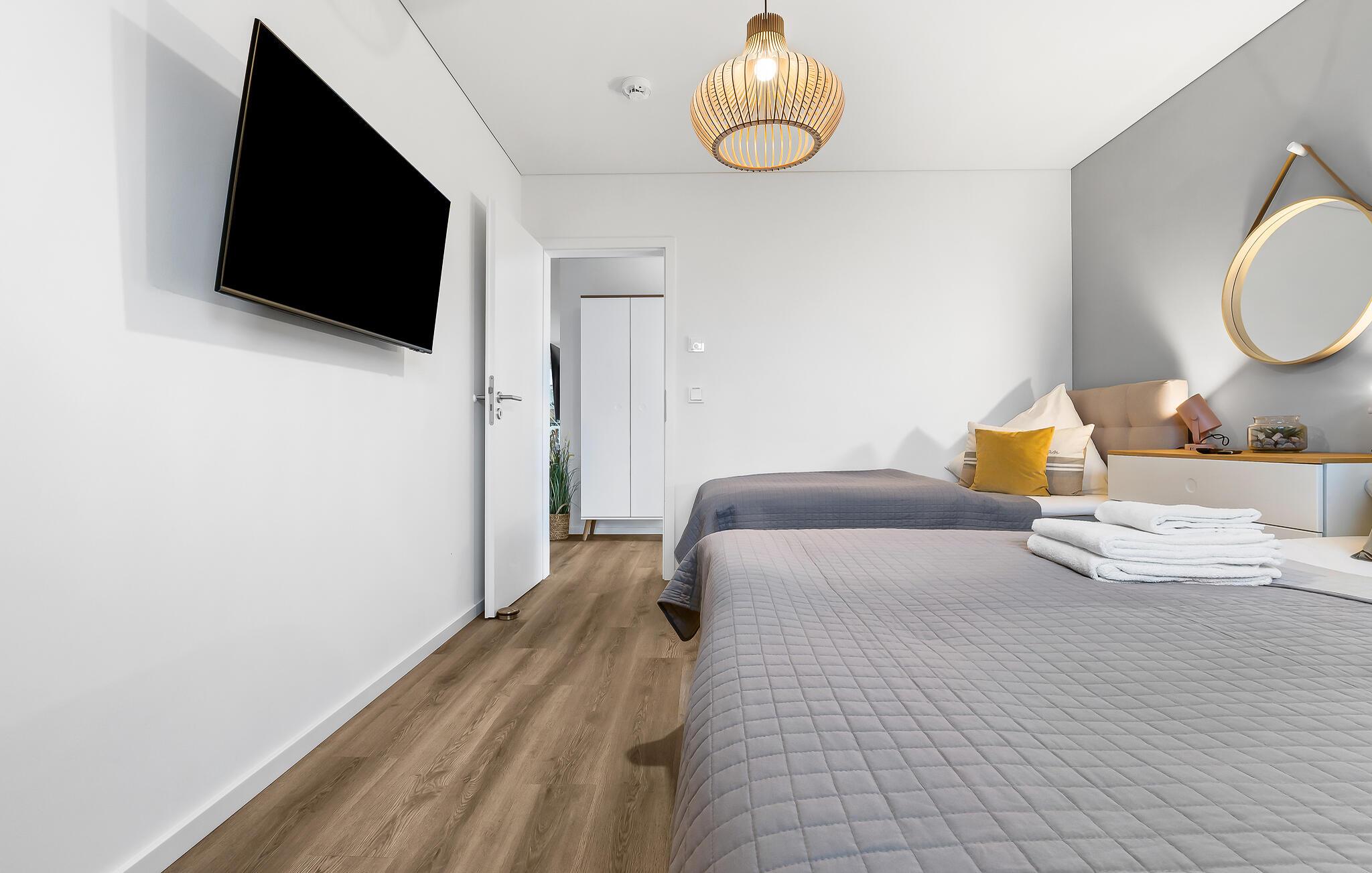 De to soverommene er stilfullt innredet og lover maksimal komfort og sørger for en avslappende hvile etter en begivenhetsrik dag på stranden. Det første soverommet er utstyrt med en komfortabel, meget stor dobbel fjærseng (200x220 cm) og en smart-TV, mens det andre soverommet har to høykvalitetsfjærsenger (160x200 og 90x190) for en avslappende nattesøvn. Her kan du trekke deg tilbake og lade batteriene for videre eventyr.