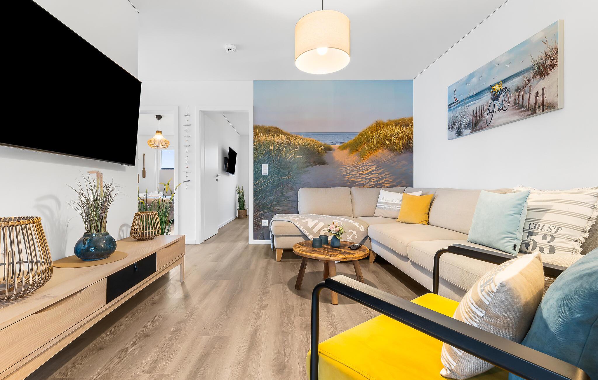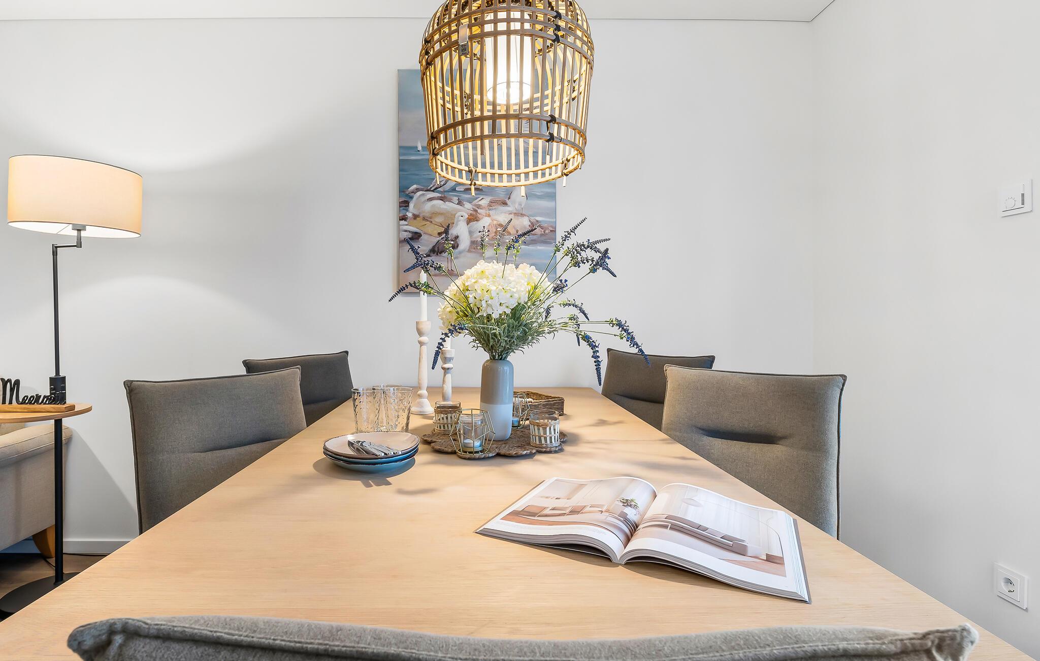 Strandhuus er et sted for avslapping og moderne nytelse. Gå inn i denne unike leiligheten og la deg fortrylle av det kjærlig møblerte interiøret. Stue- og spisestuen ønsker deg velkommen med en koselig atmosfære og møbler i ekte tre av høy kvalitet. Midt i rommet er det en romslig sofagruppe som inviterer deg til å slappe av mens du nyter favorittprogrammene dine på Smart-TV-en. På mer nordiske dager sørger peisen for koselige timer.