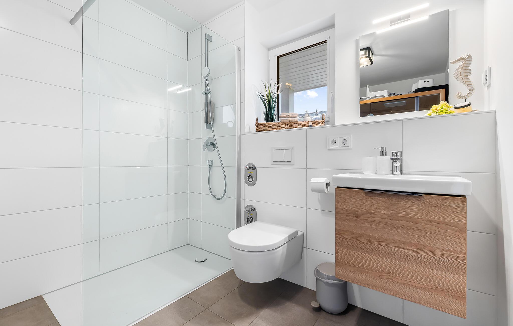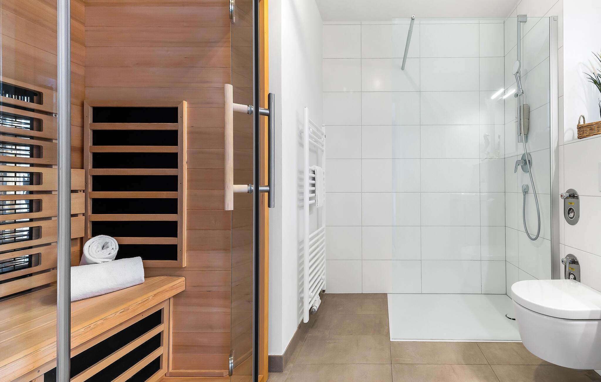 Badet i Strandhuus er forvandlet til en ekte velværeoase. En infrarød badstue og en dusj på gulvnivå lar deg glemme hverdagens stress og gir deg øyeblikk av ren avslapning.
