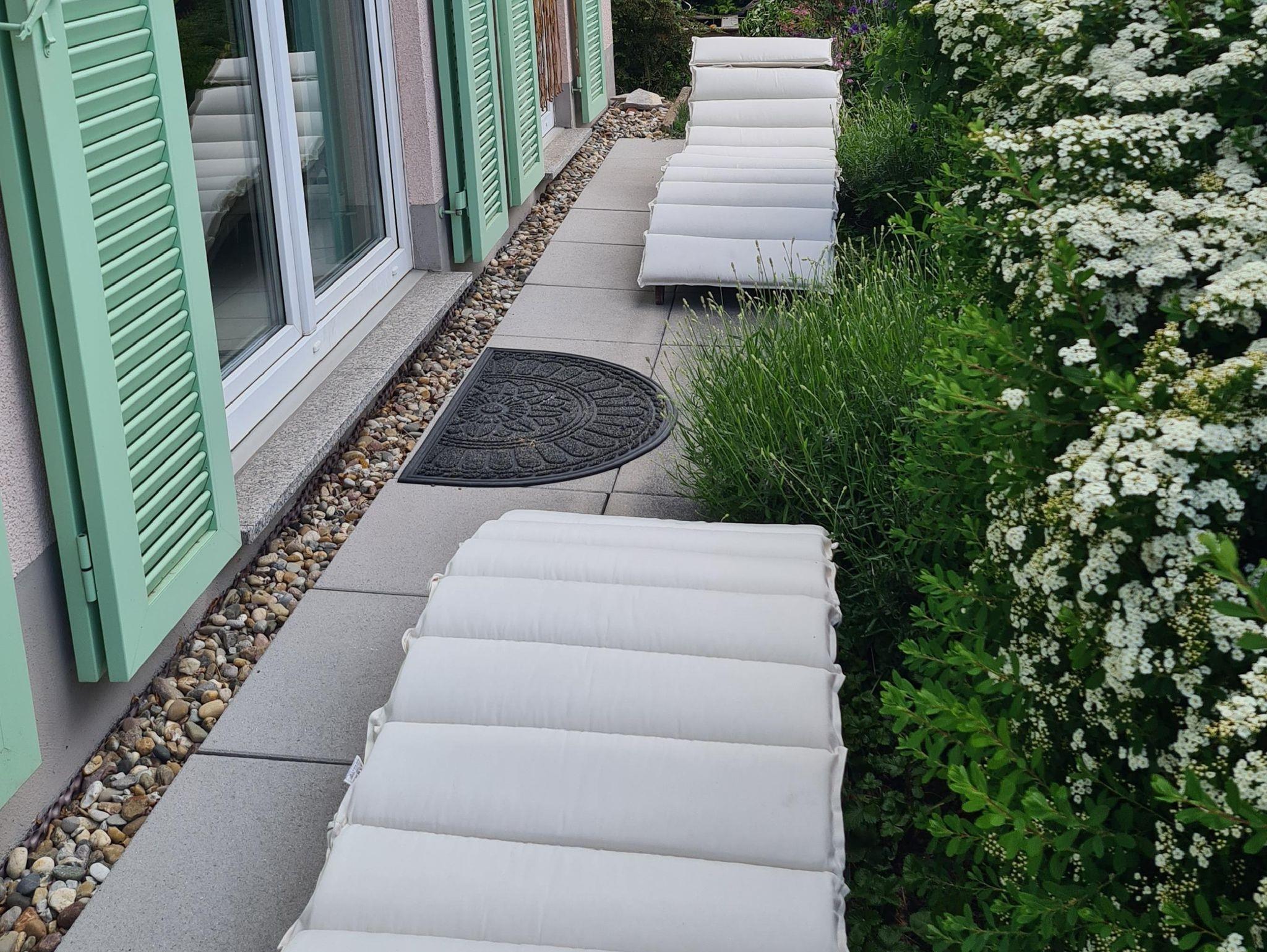 Im Erdgeschoss lassen sich an den Terrassentüren Lamellen-Klappläden schließen, beide Schlafzimmerfenster können mit Plissees komplett abgedunkelt werden.