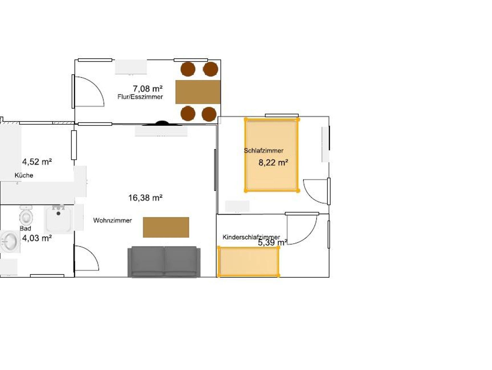 Das Ferienhaus ist mit einer kleinen Küche, einem geräumigen Wohnzimmer, einem kleinen Bad, einem Schlafzimmer, einem Kinderschlafzimmer sowie einem kleinen Esszimmer im Eingangsbereich ausgestattet. Das Haus bietet nicht nur eine traumhafte Umgebung, sondern auch durchdachte Räumlichkeiten, die für Familien ideal sind. Es gibt ein eigenes Kinderzimmer, das mit einem 200 x 90 cm großen Doppelstockbett ausgestattet ist. Das Schlafzimmer ist mit einem großzügigen 160 x 200 cm großen Bett ausgestattet.