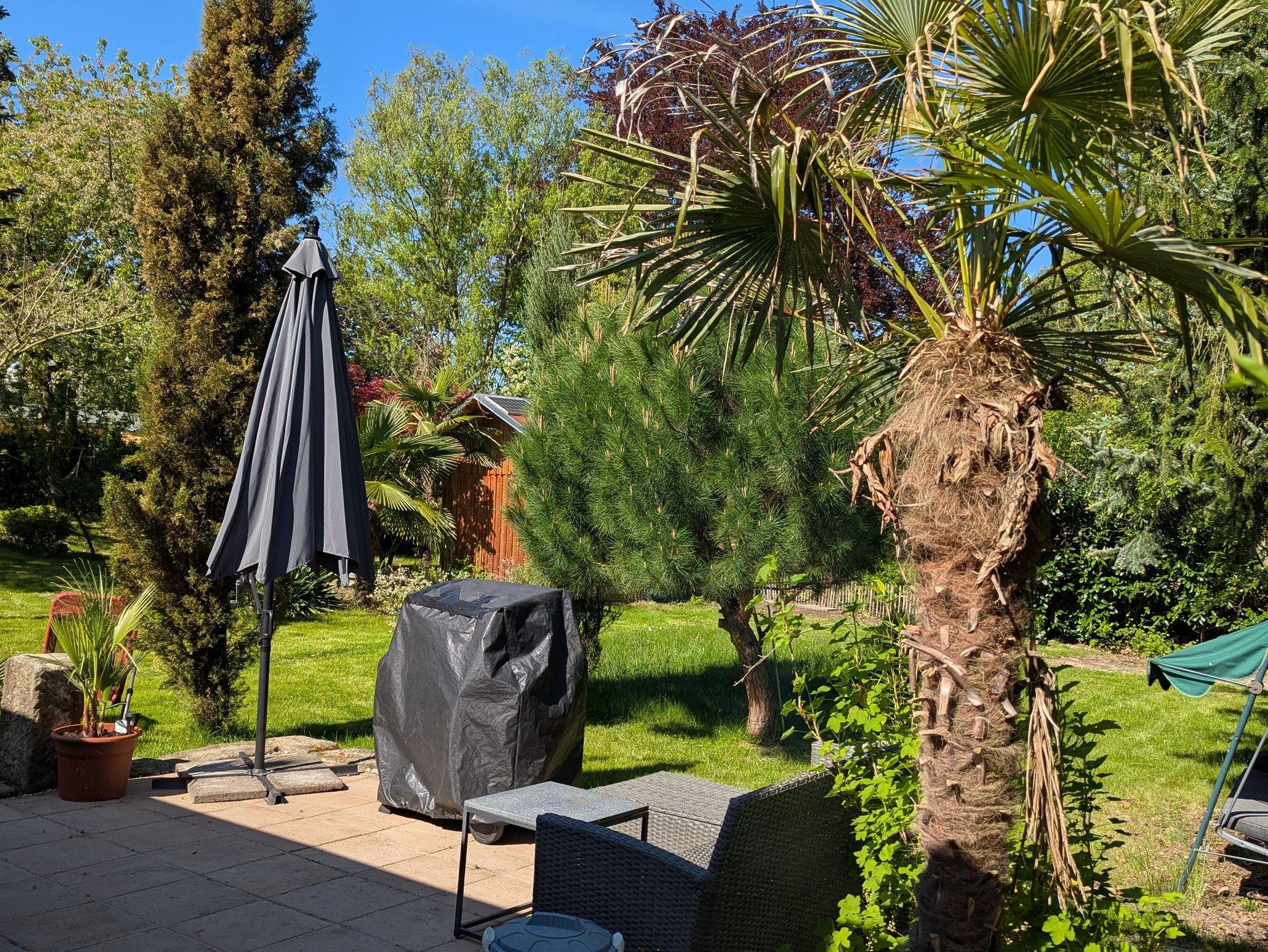 Die großzügige 20 m² große Terrasse verfügt über eine bequeme Sitzlounge, Holzkohlegrill, Essplatz und einen Sonnenschirm.