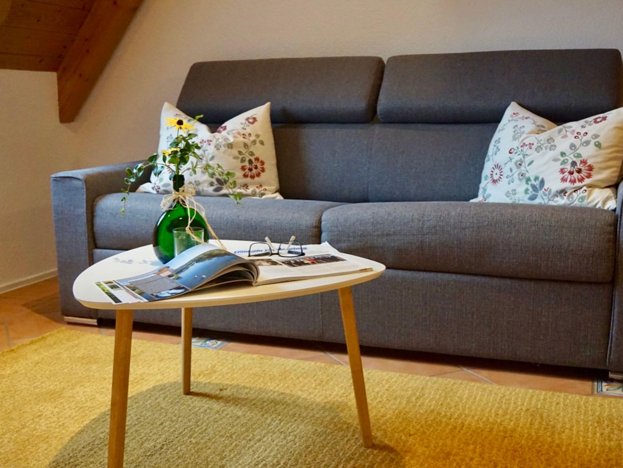 Der gemütliche Wohn-/Essraum mit Fliesenboden besteht aus einem Schlafsofa mit ausziehbaren Matratzen (1,60m x 2,00m), einem Essplatz, Garderobe, Flachbild-TV, W-Lan.
