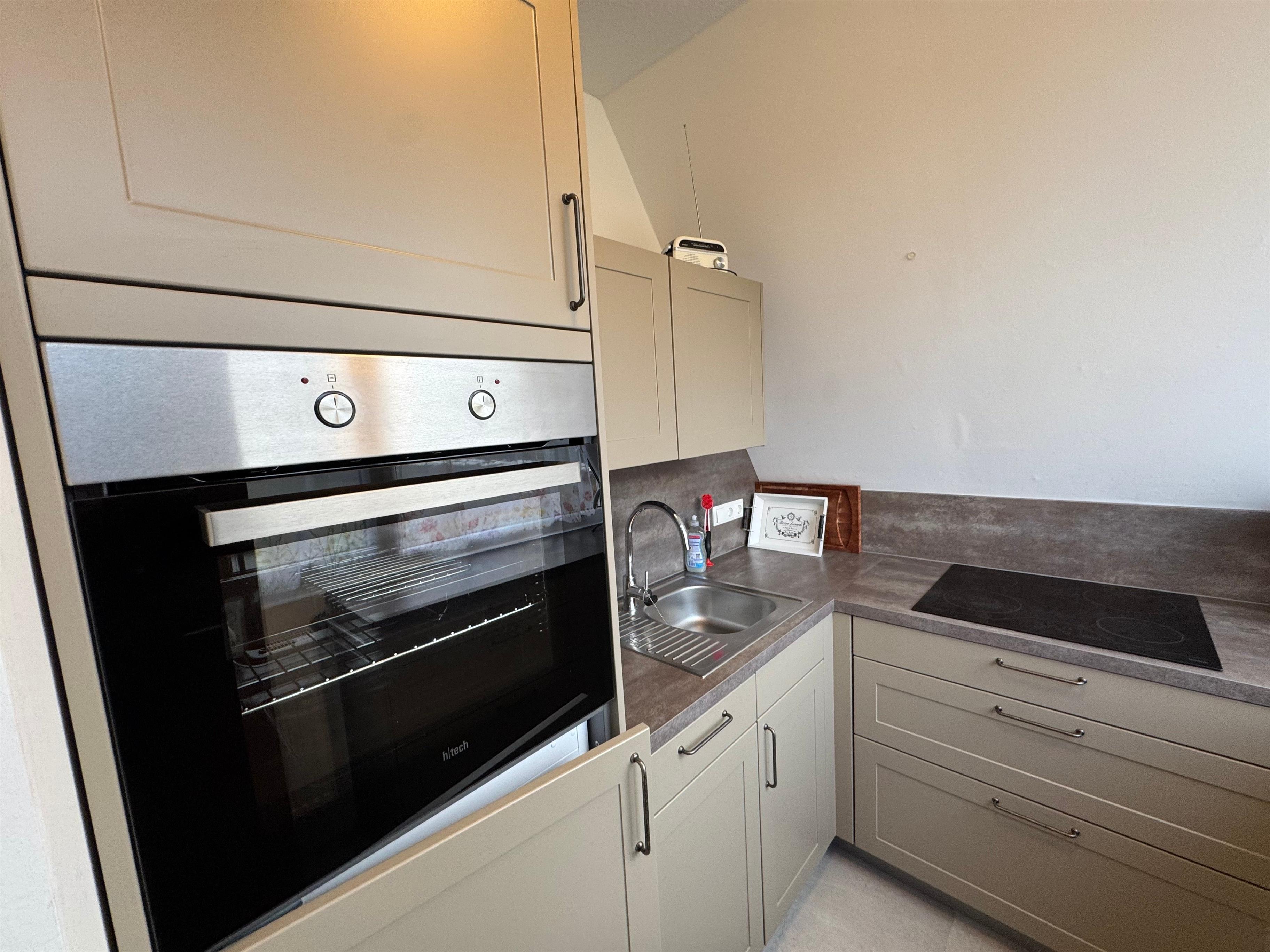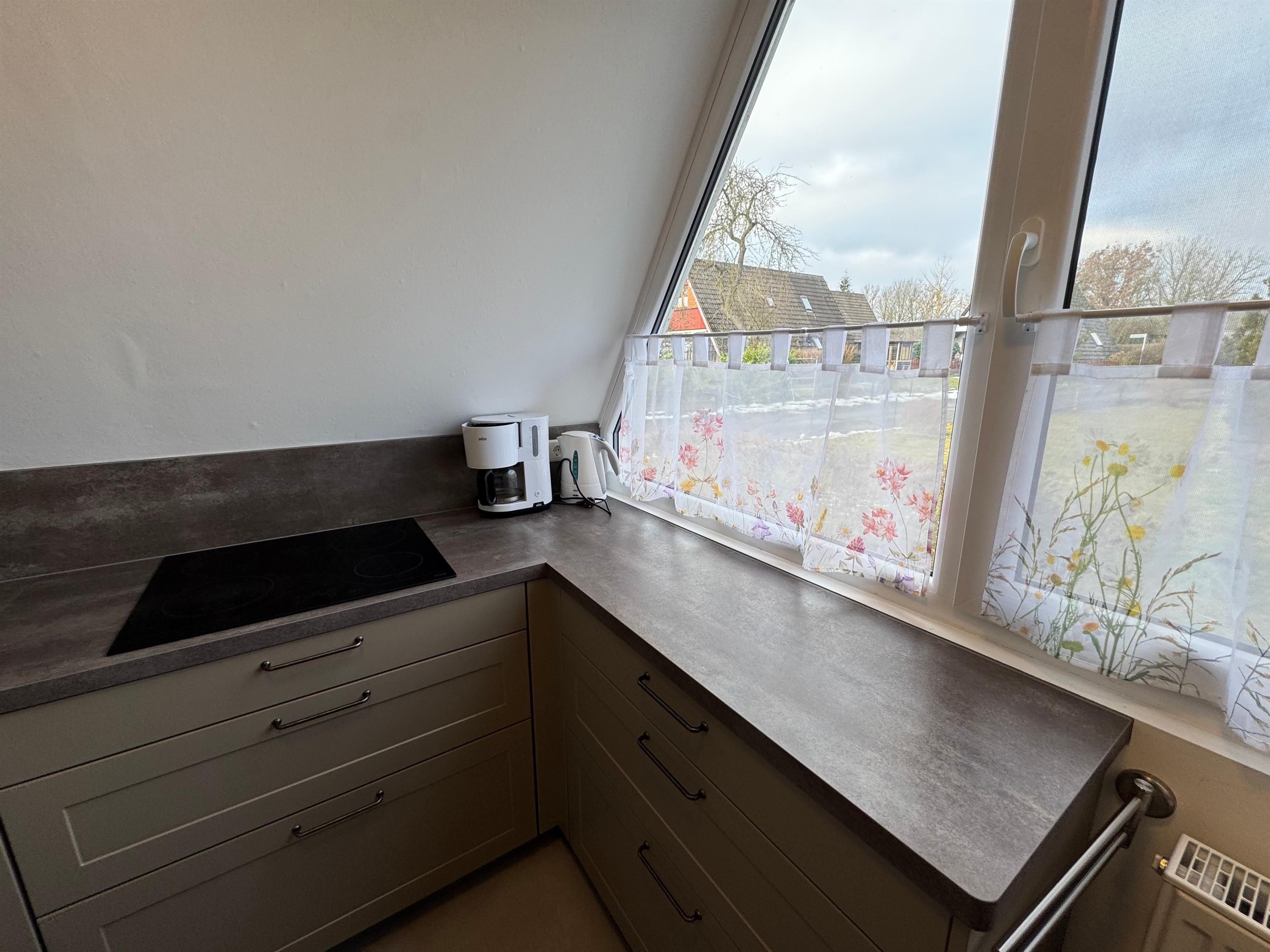 Küche: großer Kühlschrank mit Gefrierfach, Ofen/Kochfeld, Kaffeemaschine