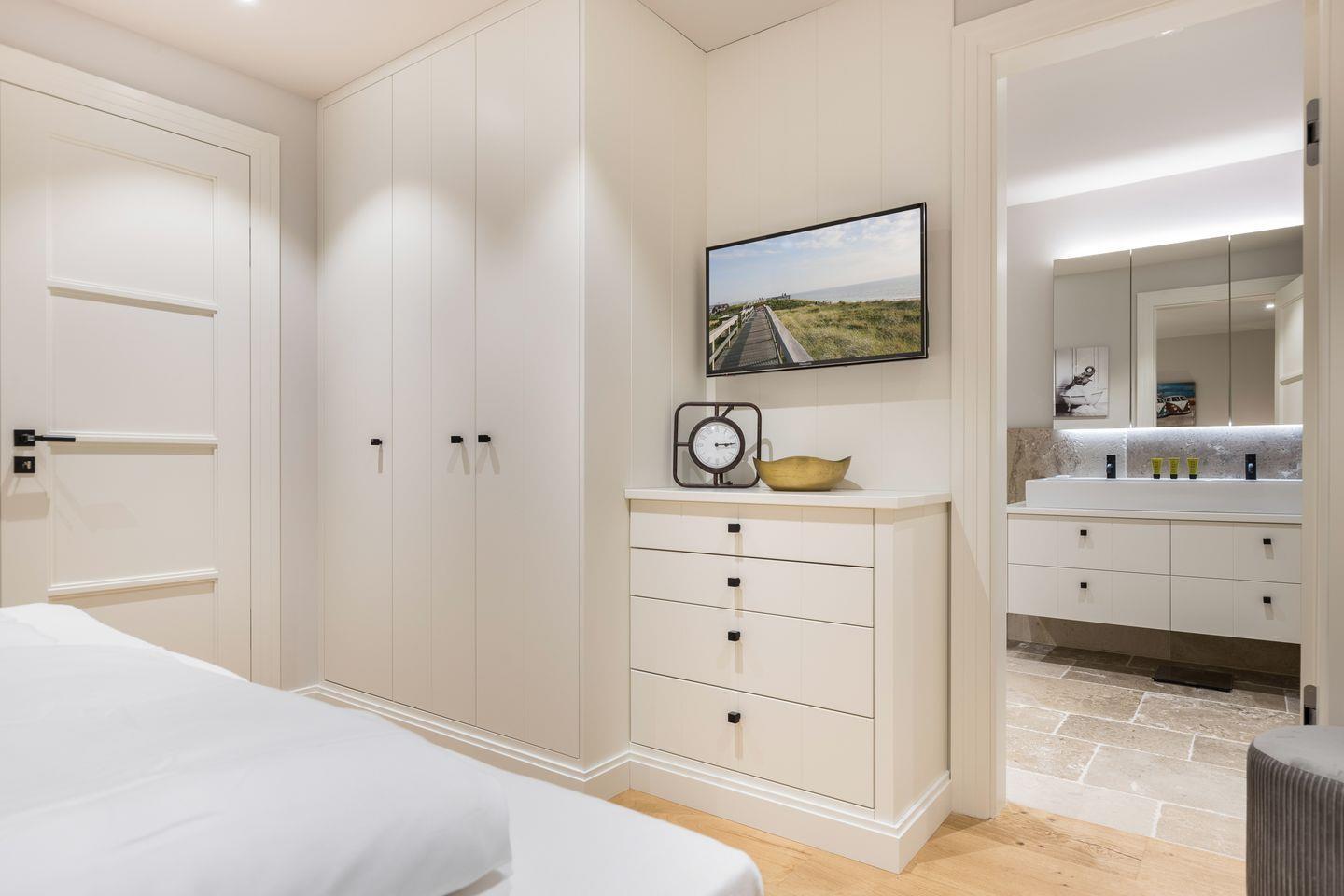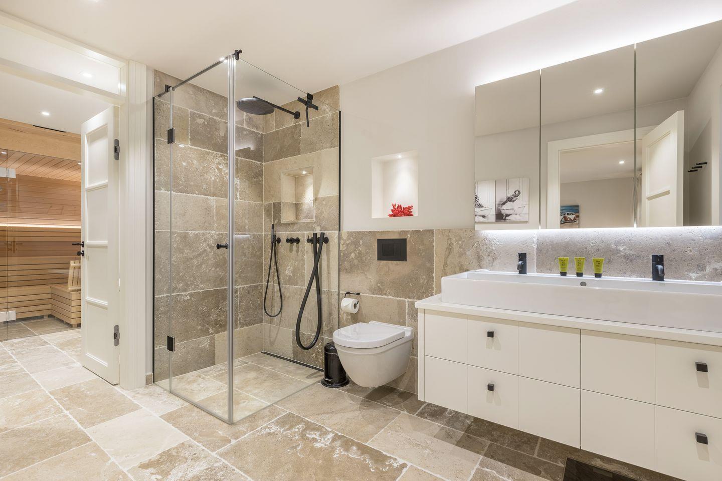 Das Untergeschoss des Hauses verfügt über ein weiteres, großzügiges Schlafzimmer mit Boxspring-Doppelbett und Flatscreen-TV. Auch hier ist hochwertiges Parkett verlegt wurden. Außerdem finden Sie hier ein Wellness-Badezimmer mit großem Saunabereich, Designer-Badewanne, Regendusche und Sauna Kaltwasserschlauch.