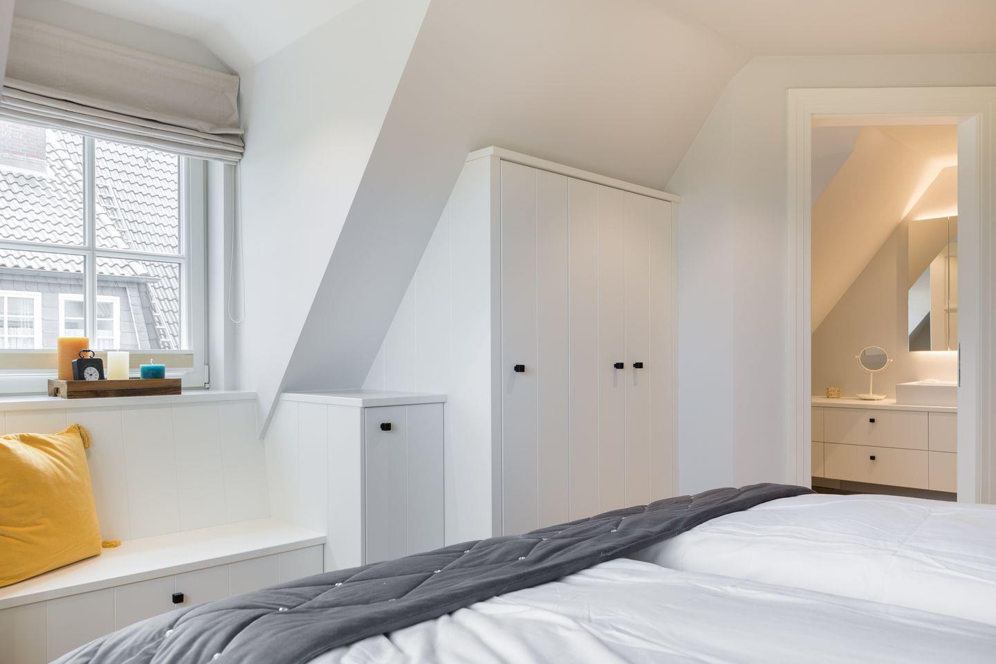 Im Obergeschoss des Hauses erwarten Sie zwei gemütliche und stilvolle Schlafräume die mit Parkettboden ausgelegt sind und mit jeweils einem Boxspring-Doppelbett und Flatscreen-TV eingerichtet wurden. Eines der Schlafzimmer verfügt über ein helles Badezimmer en-suite, ein weiteres Badezimmer ist vom Flur aus zu erreichen. Alles sind selbstverständlich hochwertige Tischlerarbeiten! Das Dachgeschoss des Hauses passt sich individuell an Ihre Bedürfnisse an. Egal, ob Sie sich beim Yoga oder auf den Wellness-Liegen entspannen möchten oder mit einem atemberaubenden Wattblick doch noch ein paar Stunden am Schreibtisch arbeiten möchten, hier ist all das möglich. Für die kleinsten Urlauber wartet hier außerdem ein interaktiver Sylt-Spieleteppich, der Ihren Kindern sicherlich viel Freude bereiten wird.
