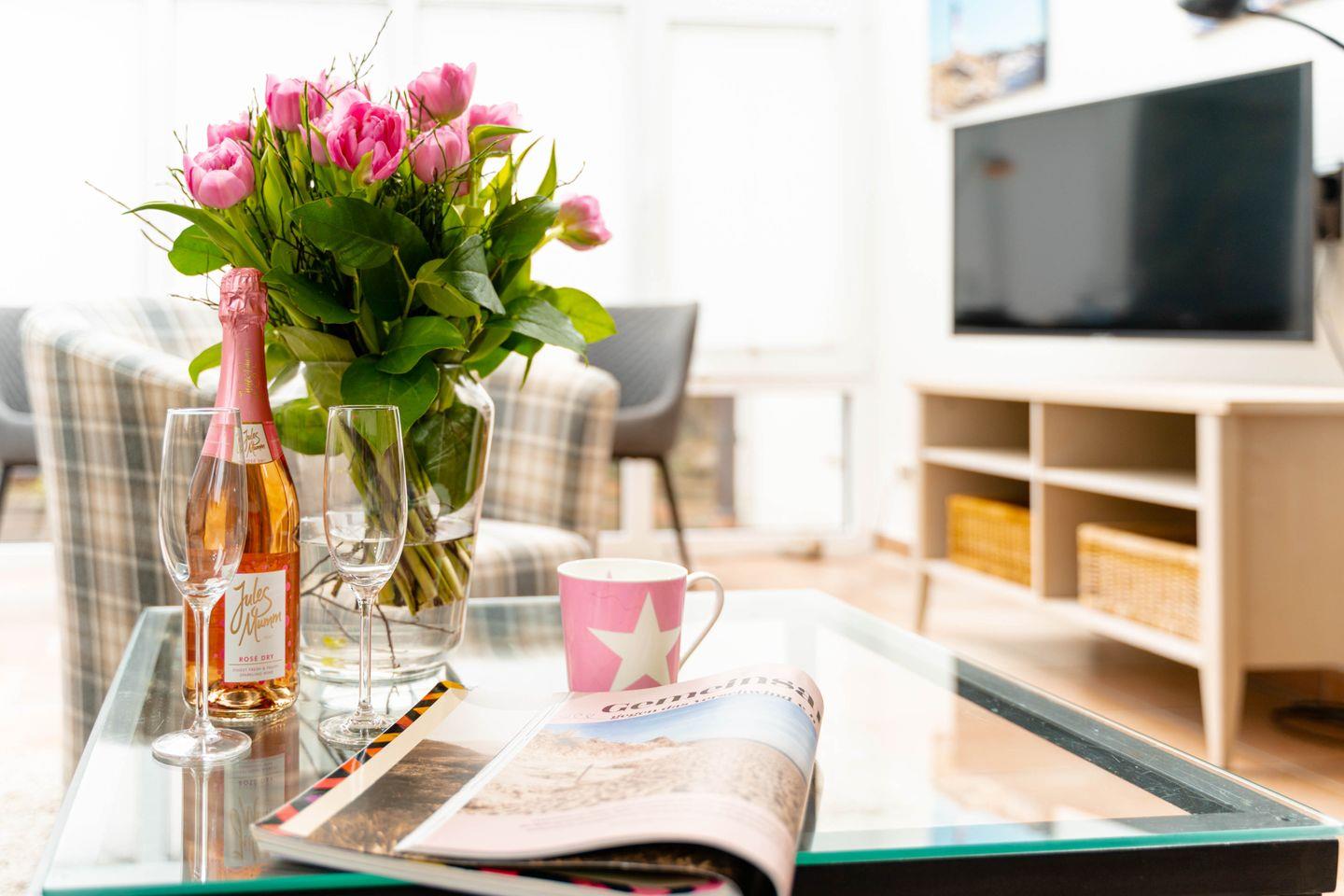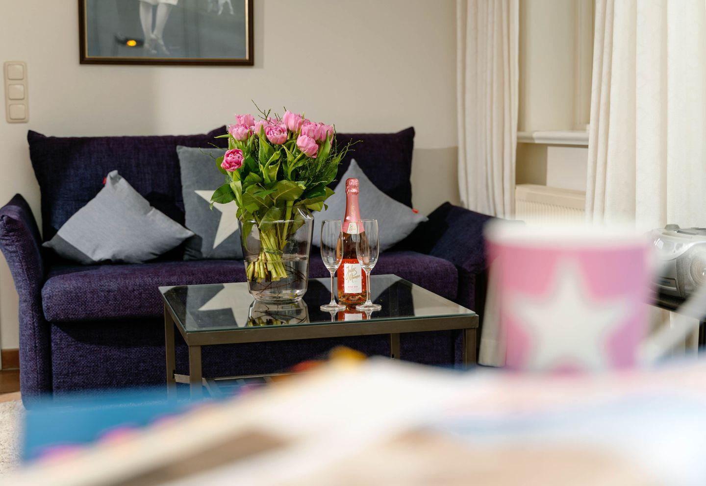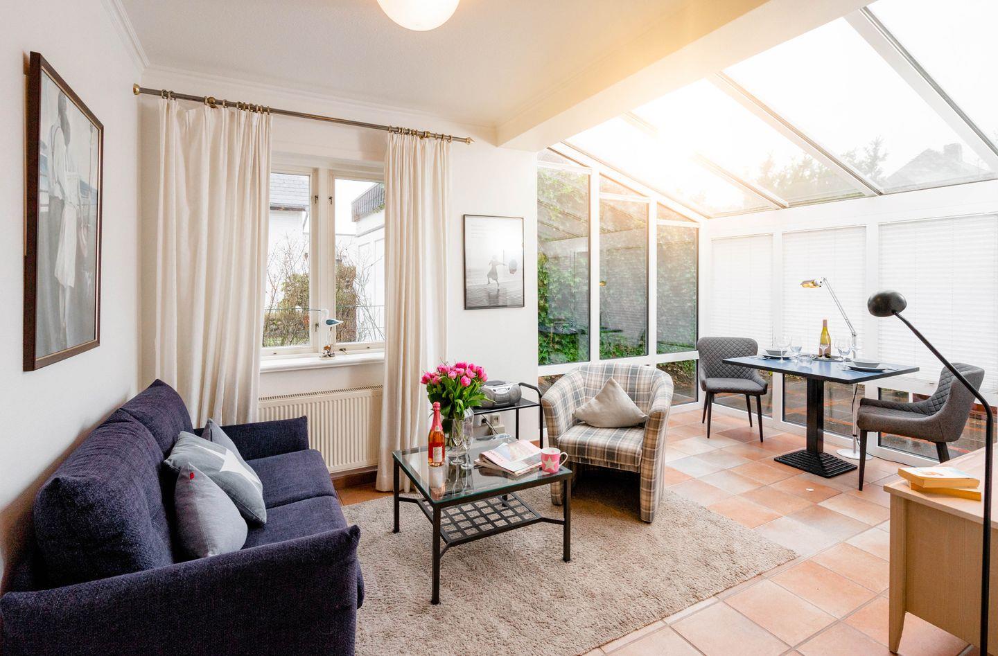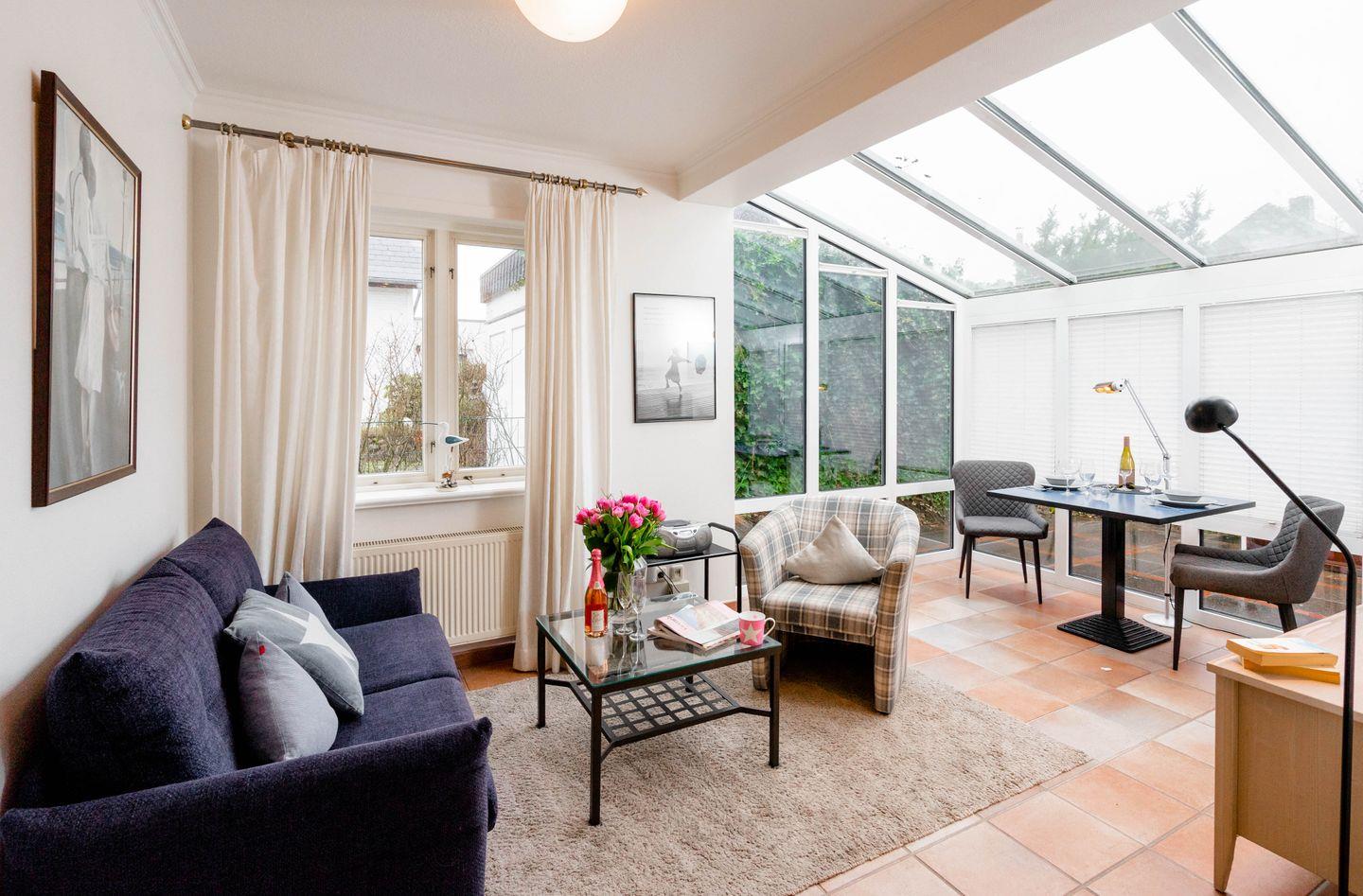 Die ebenerdige Westerländer 2-Zimmer-Ferienwohnung „Bootsmann“ besticht mit viel Licht durch ihren attraktiven Wintergarten und durch ihre Lage in einer ruhigen Seitenstraße. Von hier aus sind es nur fünf Minuten zum Strandübergang „Friesische“, wie ihn die Einheimischen verknappt nennen. Dieses Ferienappartement ist ungefähr 40 Quadratmeter groß und perfekt für zwei Personen, hat sogar eine Terrasse, sehr schönen Plavoizen-Boden und ein Schlafzimmer mit Doppelbett.