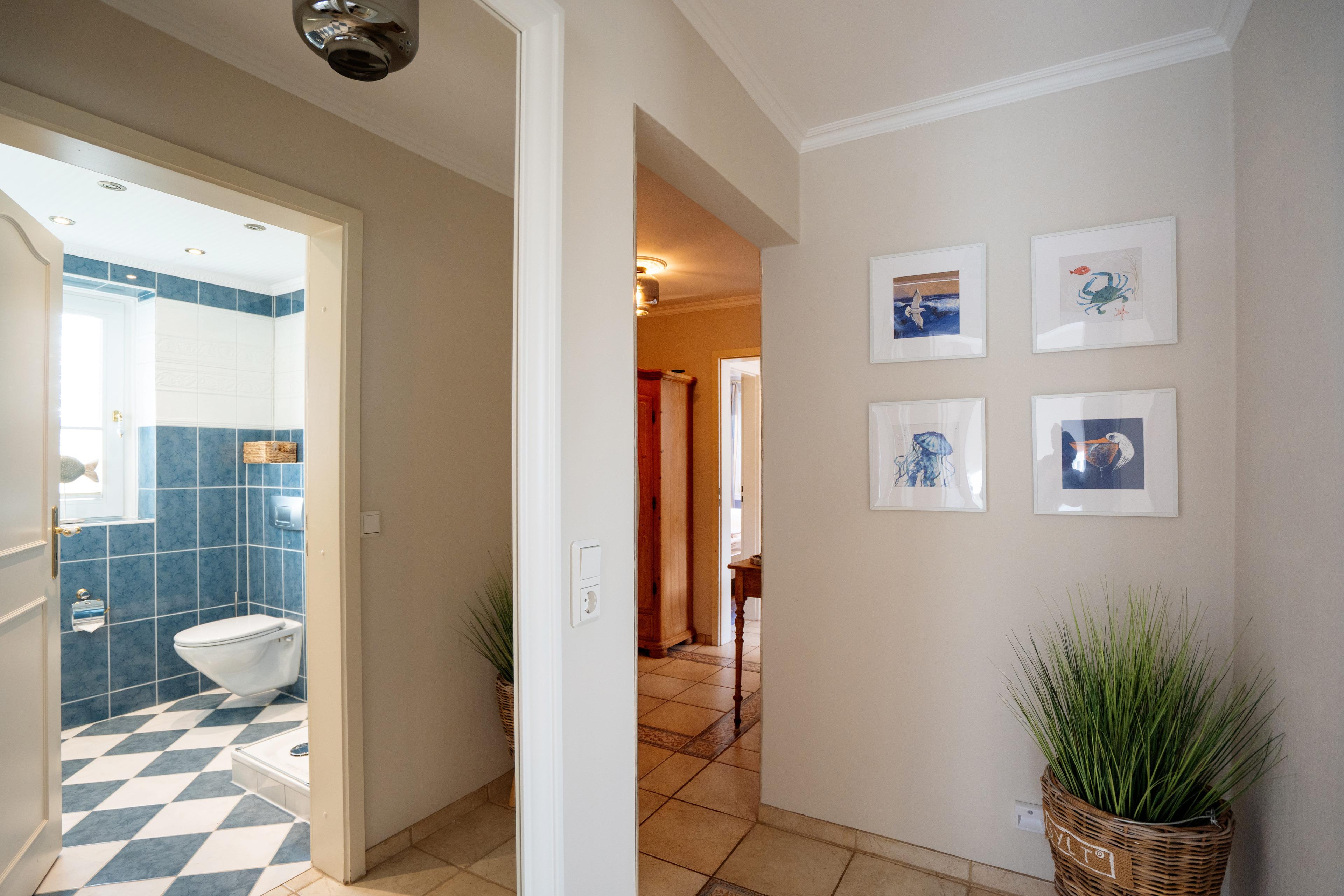 Das gepflegte Badezimmer verfügt über Dusche, WC und Waschbecken – alles, was Sie für einen angenehmen Aufenthalt benötigen.