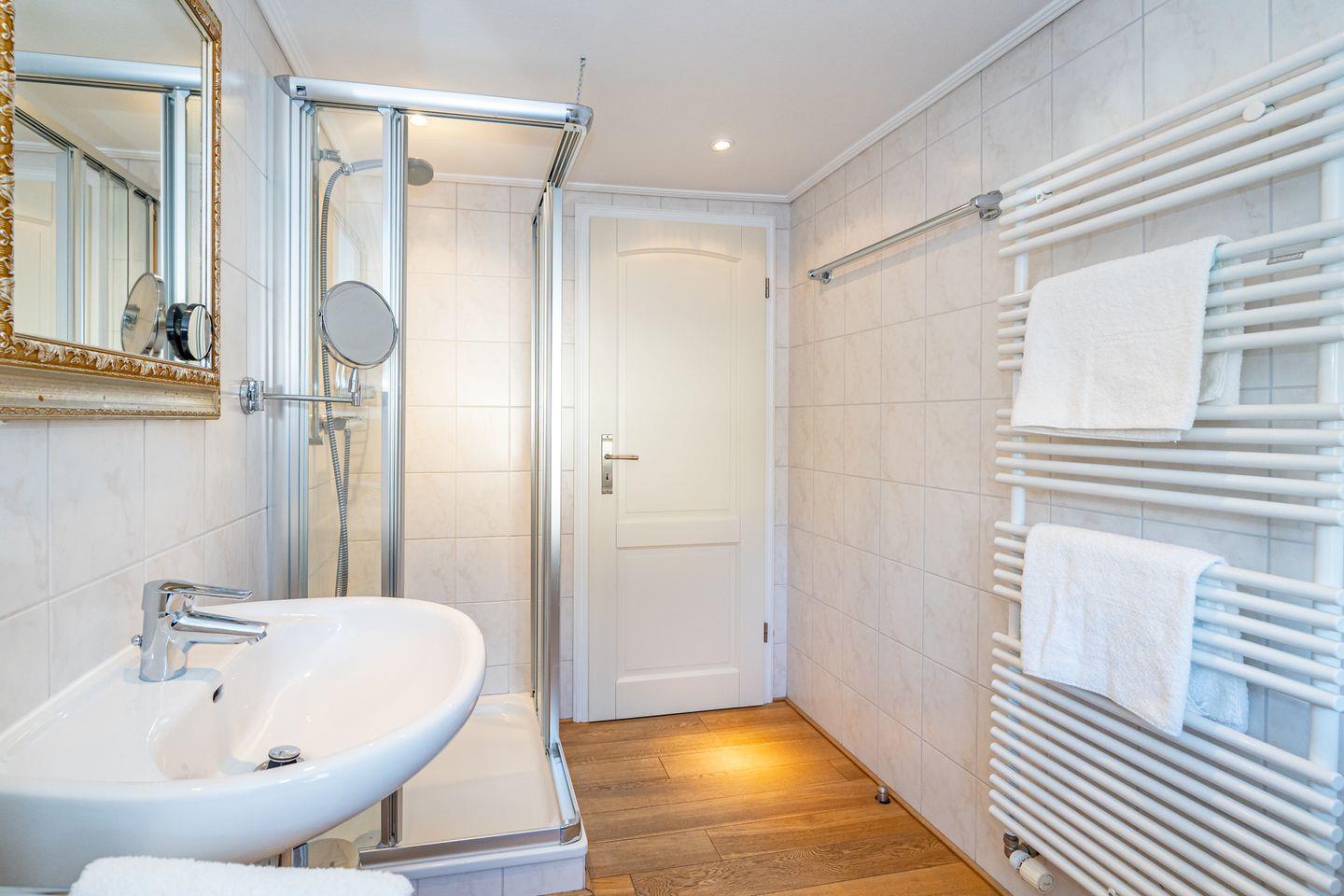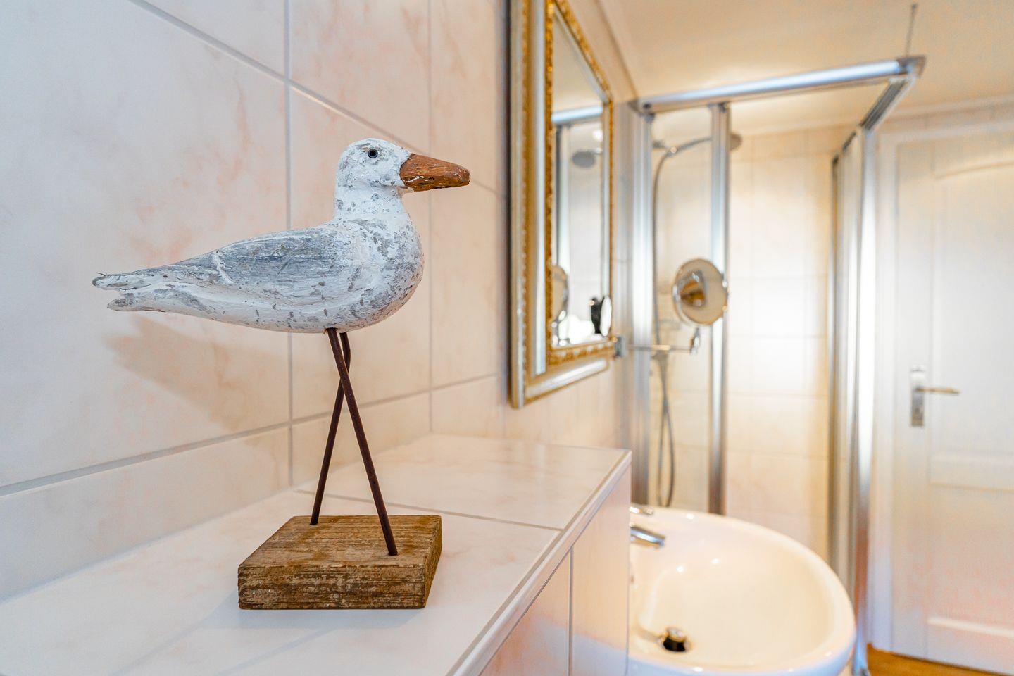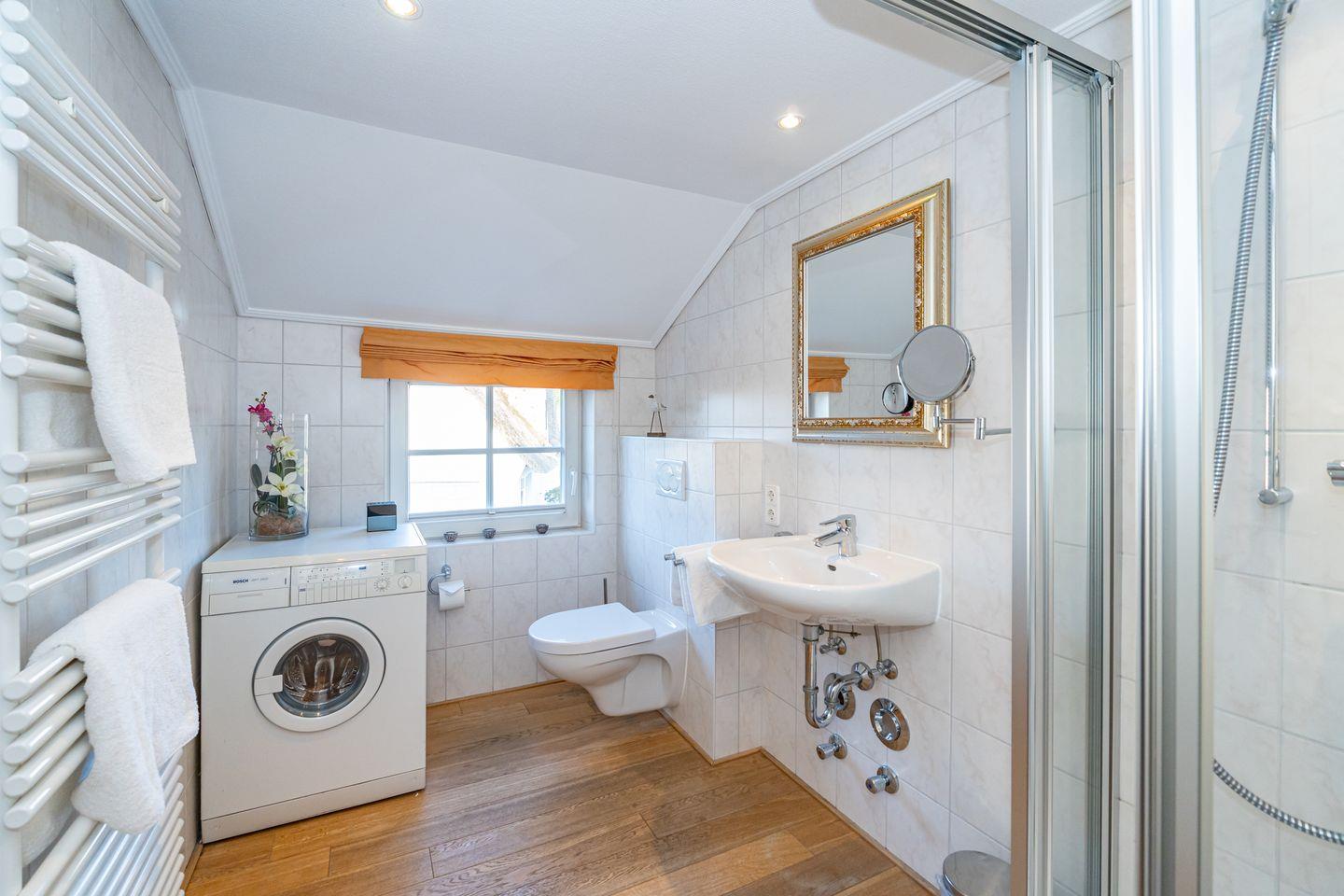 Die Ferienwohnung befindet sich im 1. Obergeschoss und verfügt komplett über Holzfußböden. In der gemütlichen Küche mit Esstisch, TV, Kaffeevollautomat, Eierkocher, Saftpresse kann man das Frühstück bis in den späten Nachmittag hinein verlängern. Das geräumige Wohnzimmer verfügt über eine Schlafcouch (für 2 Personen), Sofaecke und TV. Alle TV-Geräte sind mit einem Magentamodul ausgestattet und verfügen nun über HD TV. Netflix, Apple TV, DAZN und WOW können mit Ihren persönlichen Zugangsdaten benutzt werden. In der Ferienwohnung gibt es ein Schlafzimmer mit Doppelbett, TV und Einbauschrank. Das Badezimmer verfügt über eine Dusche, WC, Waschtisch und einen Waschtrockner.