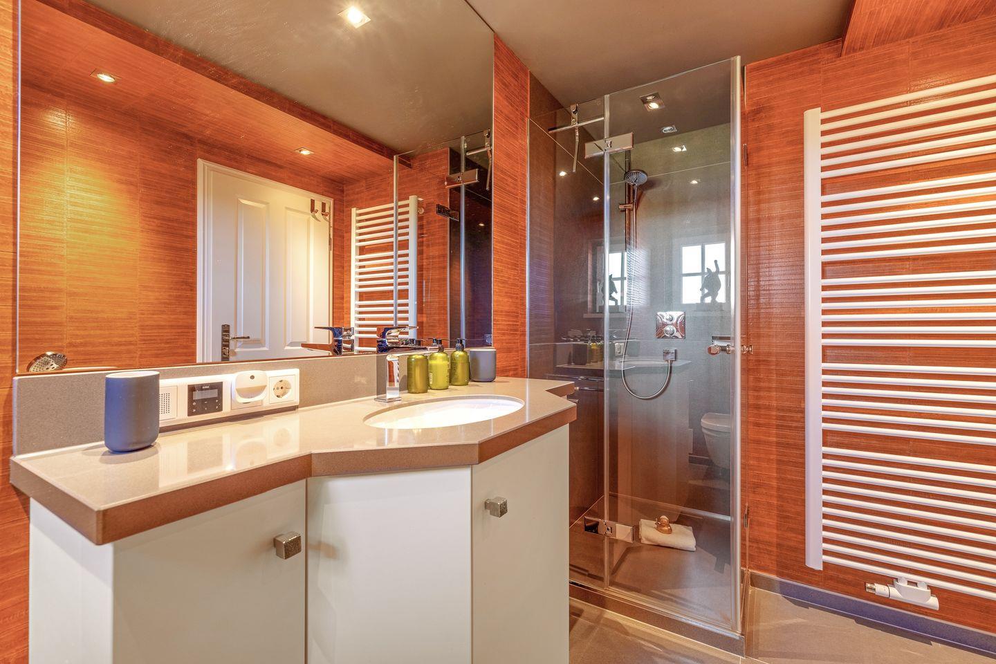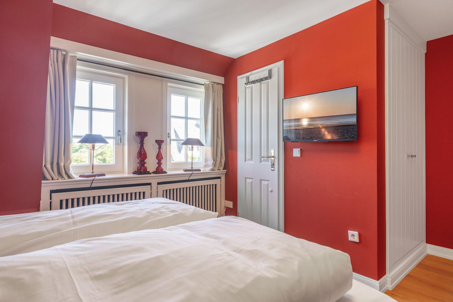 Seabiscuit ? ein echter Juwel unter den Feriendomizilen! Das charmante Endhausteil befindet sich inmitten der malerischen Tinnumer Wiesen und bietet auf ca. 120 m² Platz für insgesamt 5 Personen. Nach einer umfassenden Sanierung glänzt das Ferienhaus mit einem außergewöhnlichen Interieur und hochwertiger Ausstattung. Im Erdgeschoss erwartet Sie ein stilvoll gestalteter Wohn- und Essbereich mit einem samtig-grünen Sofaensemble, harmonisch abgestimmter Kunst und einem großzügigen Esstisch. Der angrenzende Wintergarten öffnet sich zum liebevoll angelegten Garten mit eigenem Sonnenplatz ? perfekt für entspannte Stunden im Freien. Die offene Küche in edlem Anthrazit fügt sich dezent in den Raum ein, überzeugt jedoch durch ihre erstklassige Ausstattung. Ein besonderes Highlight ist das Duschbad im Erdgeschoss, das mit seinem kräftigen Fliederton Akzente setzt. Im ersten Obergeschoss setzt sich das farbenfrohe Design fort: Eines der drei Schlafzimmer ist in warmem Kaminrot gehalten, geschmückt mit asiatischer Kunst und ausgestattet mit einem gemütlichen Boxspringbett (160 x 200 cm)m Das en suite Gäste-WC erinnert mit zartem Kirschblütendesign an fernöstliche Ästhetik. Direkt nebenan befindet sich der Masterbedroom mit einem großzügigen Boxspringbett (180 x 200 cm), begehbarem Kleiderschrank in Aubergine und einem Balkon mit herrlichem Blick ins Grüne. Das angrenzende Badezimmer en suite besticht durch seinen individuellen Look in leuchtend Rot und bietet alles für eine erfrischende Auszeit. Im ausgebauten Dachgeschoss empfängt Sie ein weiteres Schlafzimmer (160 x 200 cm) in beruhigendem Pistaziengrün. Der sonnengelbe begehbare Kleiderschrank bringt Wärme und Frische in den Raum. Hier herrscht beim Sonnenuntergang eine außergewöhnliche Atmosphäre. Abgerundet wird das Dachgeschoss durch ein kleines, fröhlich türkisfarbenes Duschbad ? ein echter Gute-Laune-Ort. Es stehen Ihnen WLAN, zwei eigene PKW-Stellplätze sowie eine Waschmaschine und ein Trockner zur Verfügung. Haustiere sind leider nicht erlaubt.