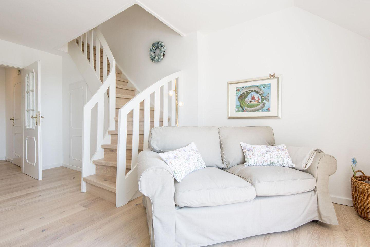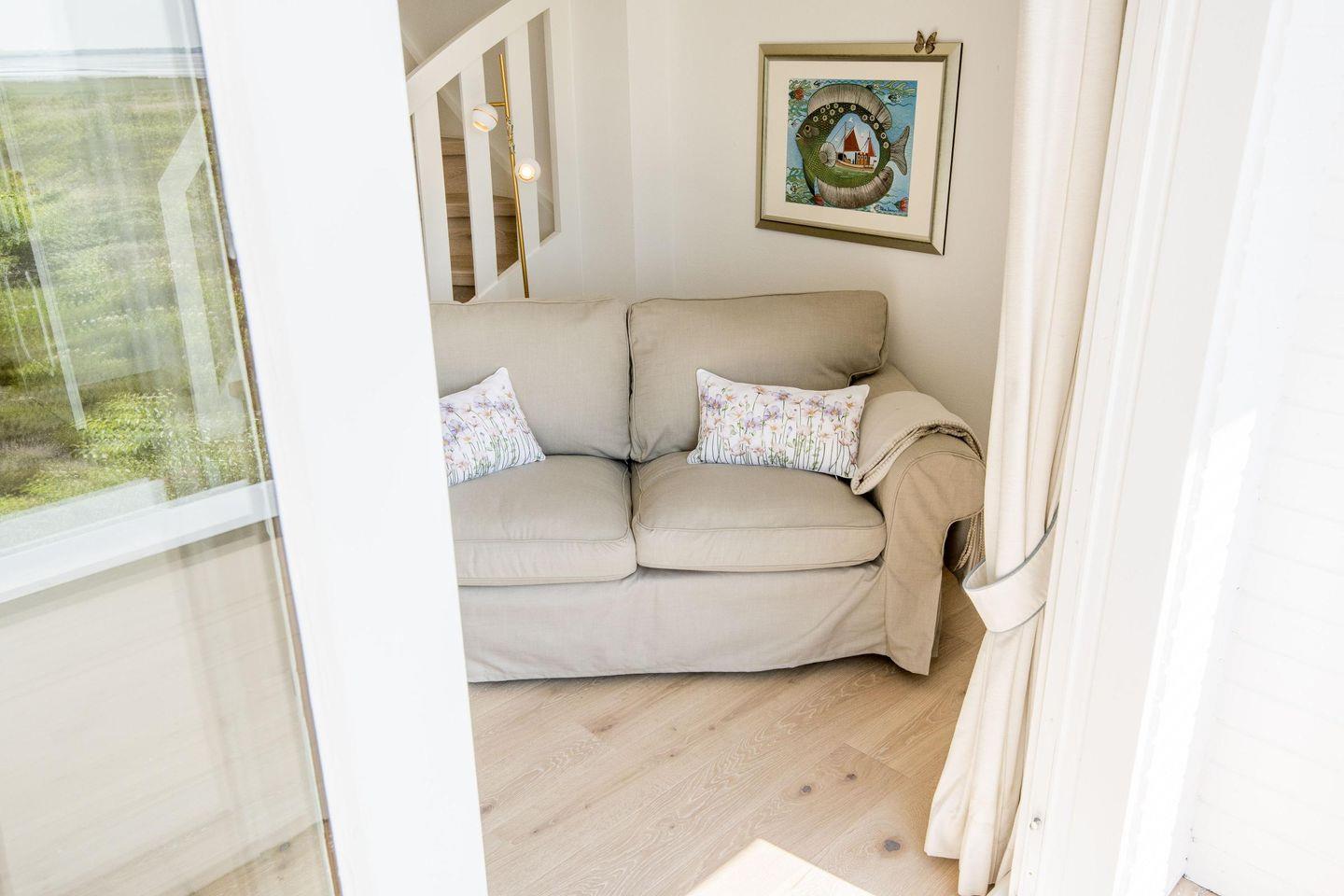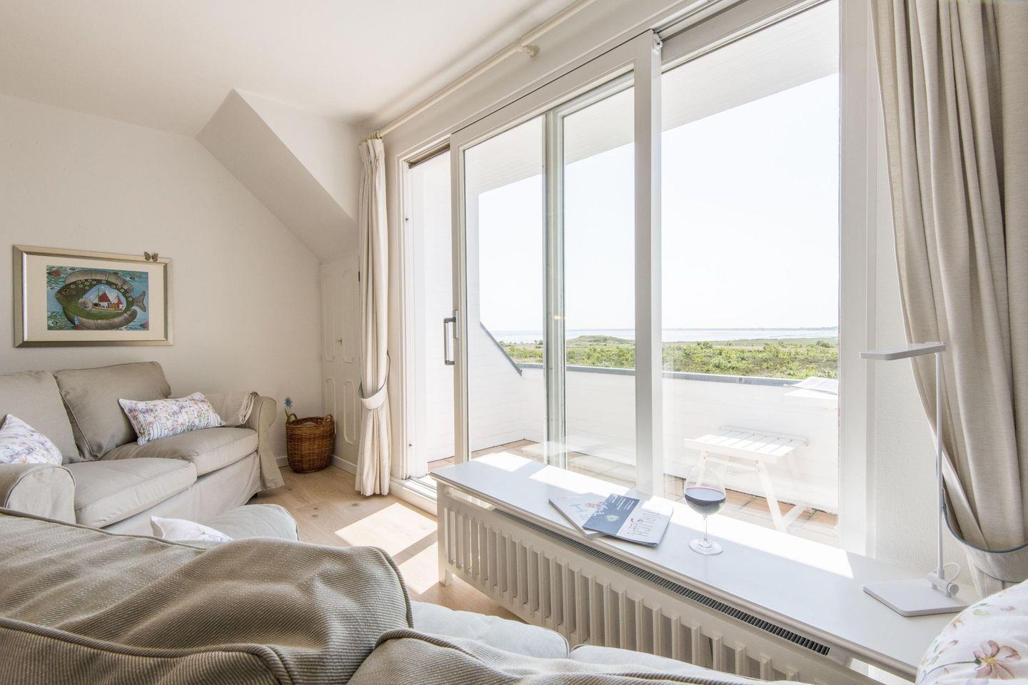 Das gemütliche Wohnzimmer ist der perfekte Ort zum Entspannen. Ob auf dem komfortablen Sofa mit einem guten Buch oder bei einem gemeinsamen Filmabend – hier lässt es sich wunderbar abschalten. Der angrenzende Essbereich mit Platz für 4 Personen lädt zu gemeinsamen Mahlzeiten ein, während die offene Gestaltung ein luftiges Raumgefühl schafft. Der direkte Zugang zum Balkon mit freiem Blick aufs Wattenmeer ermöglicht es, die Ruhe der Natur zu genießen und den Alltag hinter sich zu lassen.