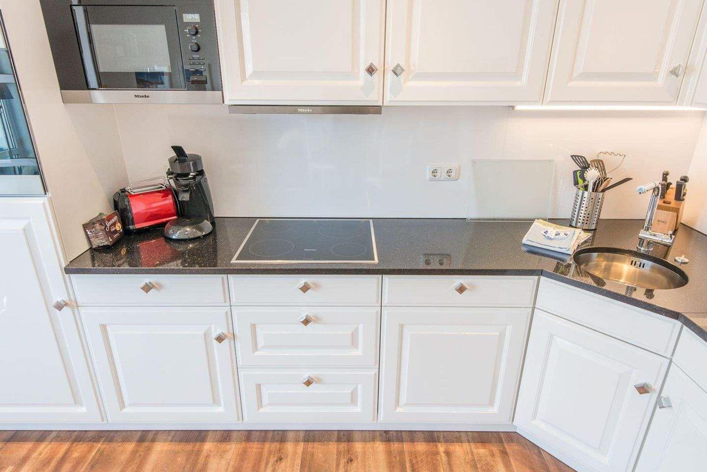 Offene Küche mit Cerankochfeld, Backofen, Mikrowelle, Geschirrspüler, Senseo-Kaffeemaschine und viel Komfort.