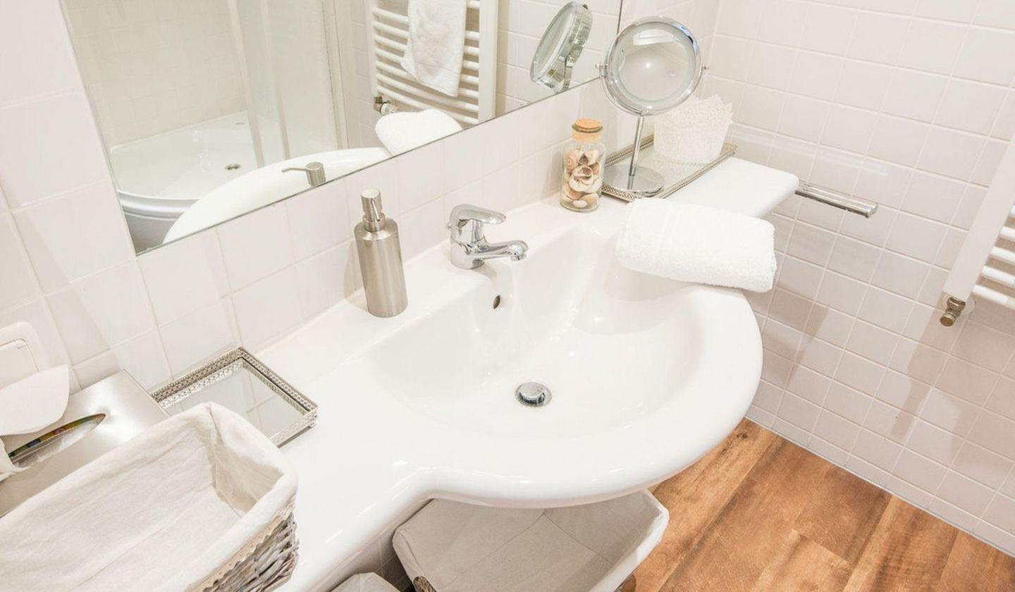 Badezimmer (Duschbad) mit Dusche, WC, Handtuchwärmer und Föhn.
