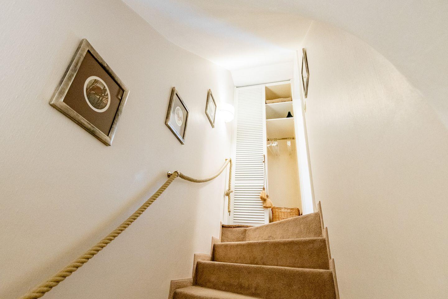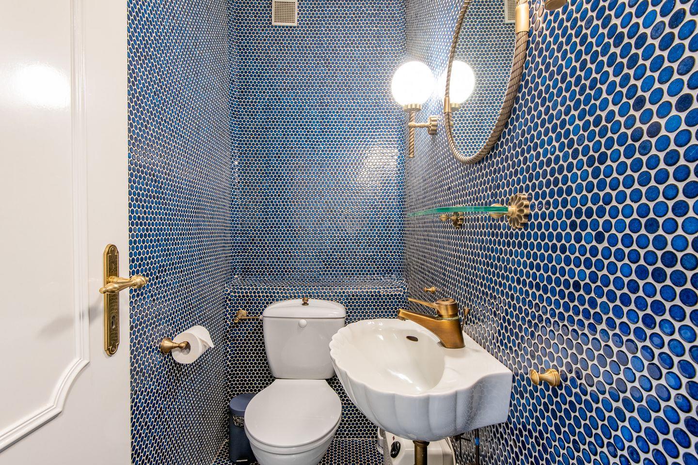 Das moderne Badezimmer im Erdgeschoss verfügt über eine Badewanne, WC und Waschbecken und ist mit einem Föhn ausgestattet. Ein zusätzliches Gäste-WC im Eingangsbereich bietet weiteren Komfort für die Gäste.