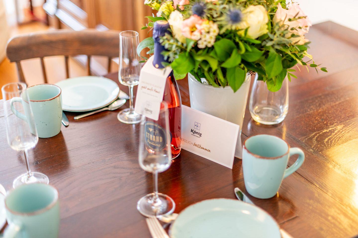 Das helle Wohn- und Esszimmer lädt zum Entspannen und Beisammensein ein. Durch den direkten Zugang zur Terrasse und dem kleinen Gartenanteil können Sie die frische Nordseeluft auch im Strandkorb genießen – ideal für ruhige Abende im Freien. Der gemütliche Essbereich bietet den perfekten Rahmen für gemeinsame Mahlzeiten.