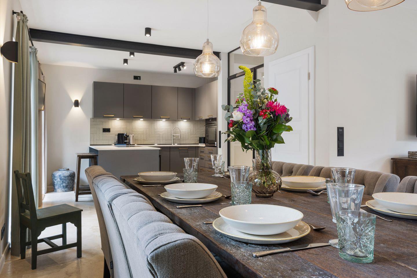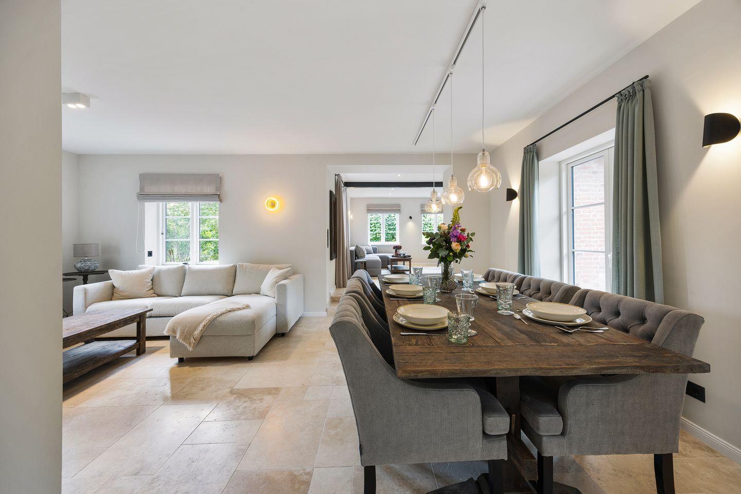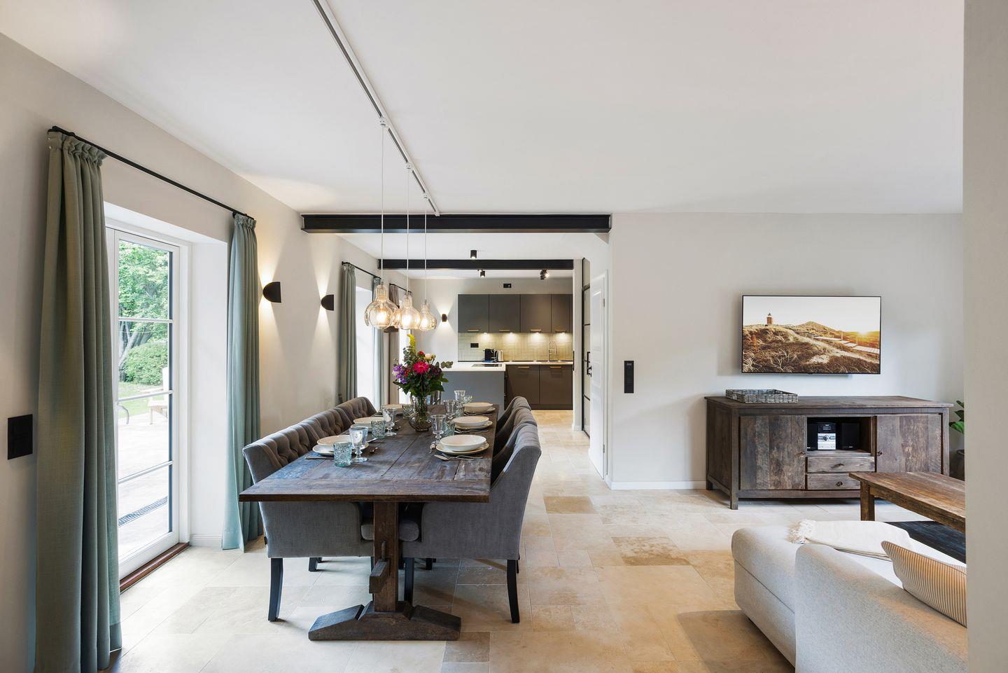 Im stilvoll eingerichteten Wohn- und Essbereich genießen Sie komfortable Stunden mit Ihrer Familie oder Freunden. Der große Esstisch bietet reichlich Platz für gemeinsame Mahlzeiten, während die gemütliche Sofaecke ideal zum Entspannen einlädt. Von hier aus gelangen Sie direkt auf die möblierte Terrasse mit hochwertigen Gartenmöbeln, die zu sonnigen Stunden im Freien einlädt.