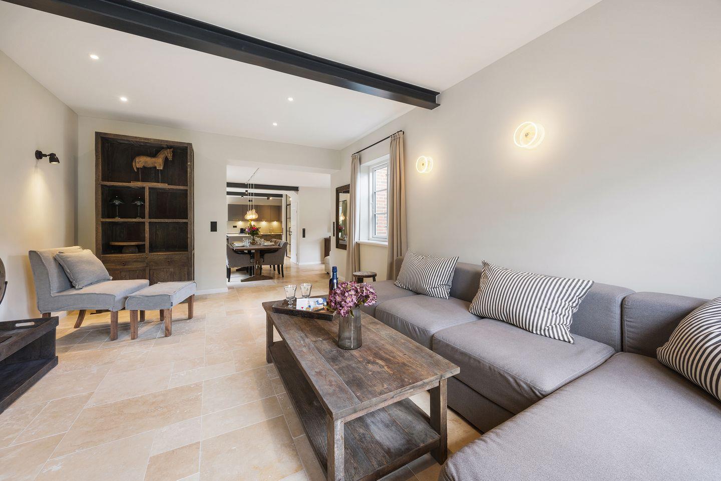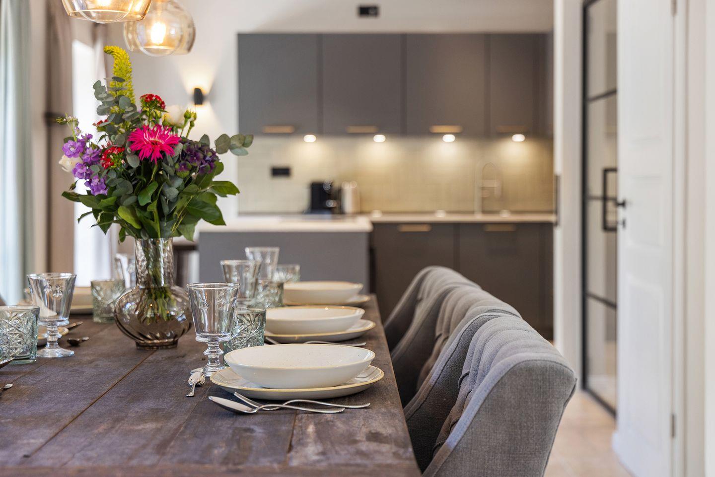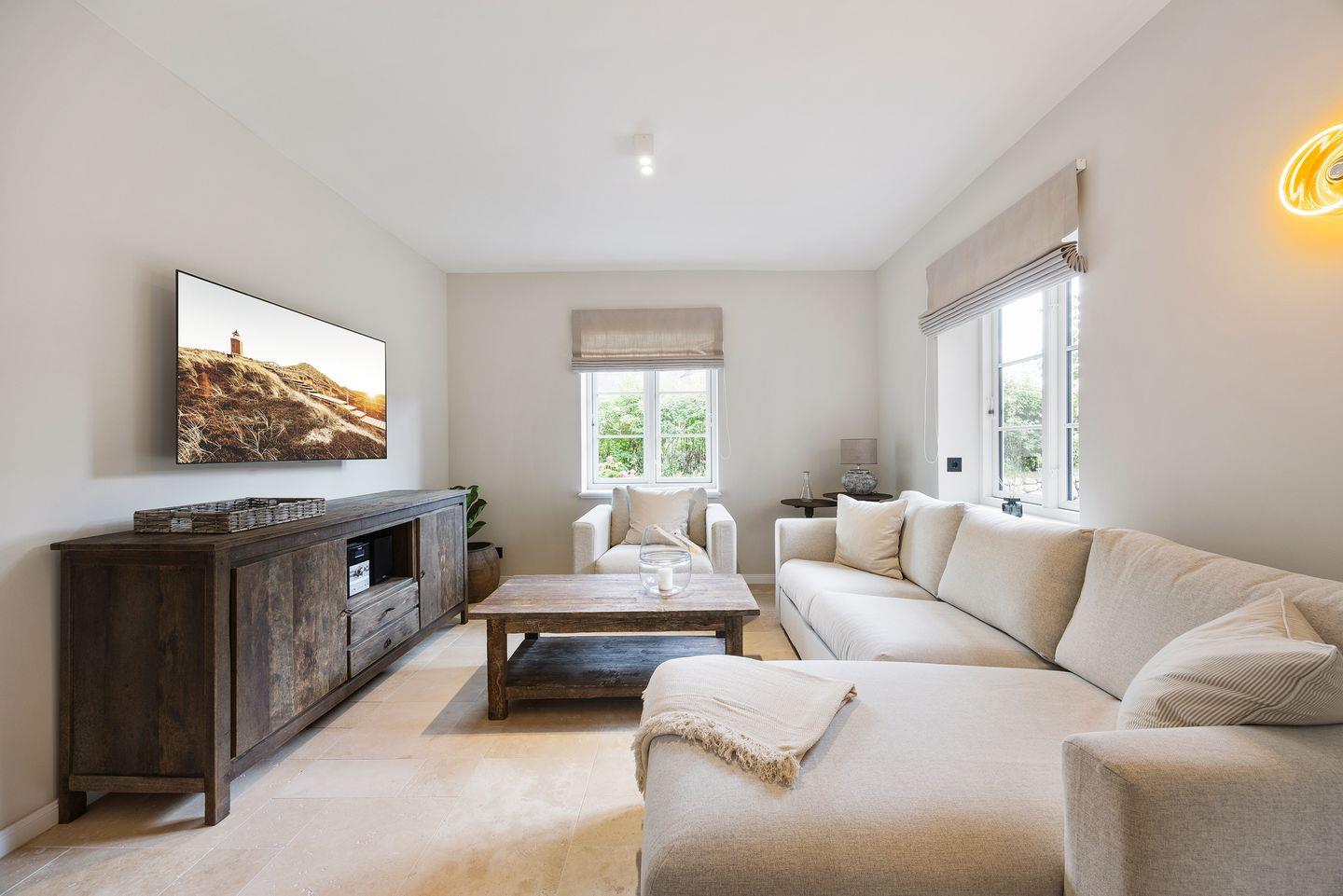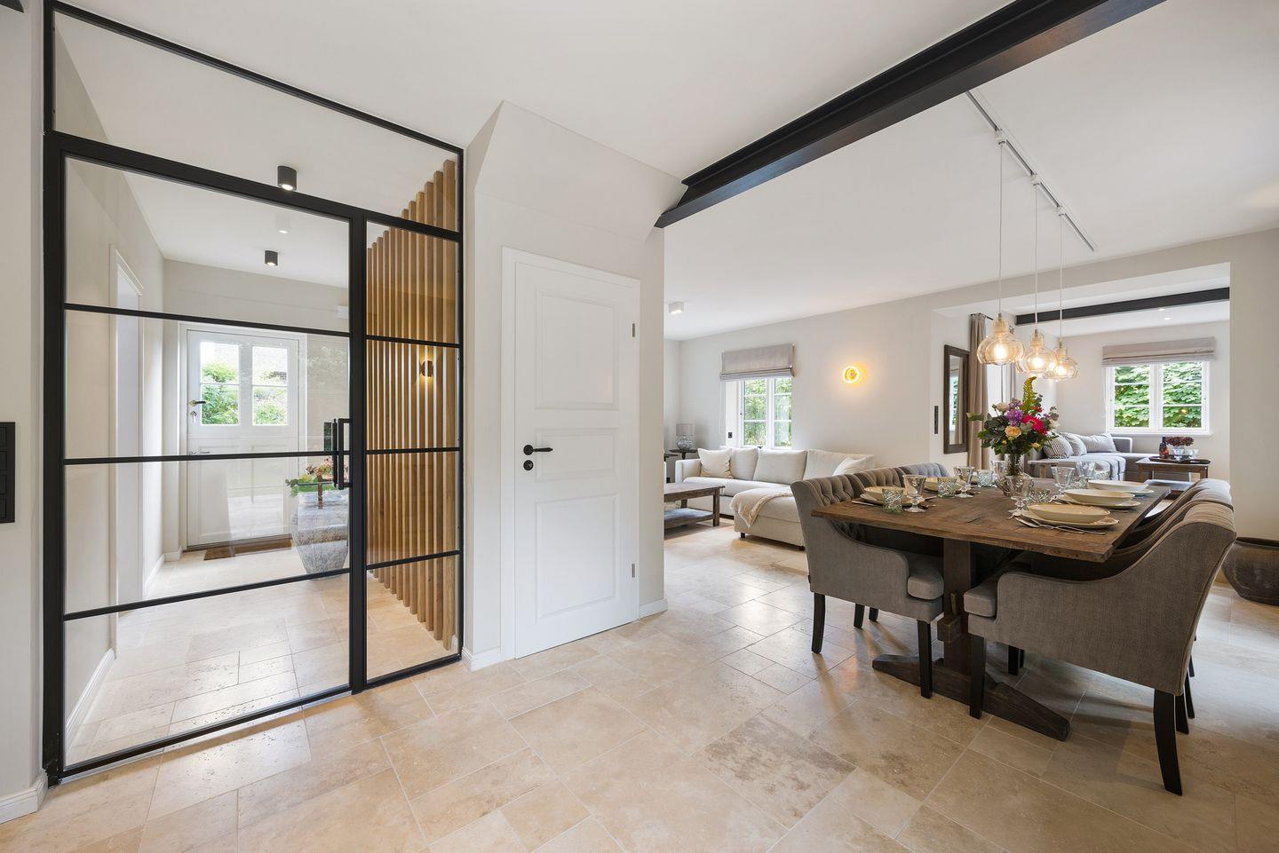 Im stilvoll eingerichteten Wohn- und Essbereich genießen Sie komfortable Stunden mit Ihrer Familie oder Freunden. Der große Esstisch bietet reichlich Platz für gemeinsame Mahlzeiten, während die gemütliche Sofaecke ideal zum Entspannen einlädt. Von hier aus gelangen Sie direkt auf die möblierte Terrasse mit hochwertigen Gartenmöbeln, die zu sonnigen Stunden im Freien einlädt.