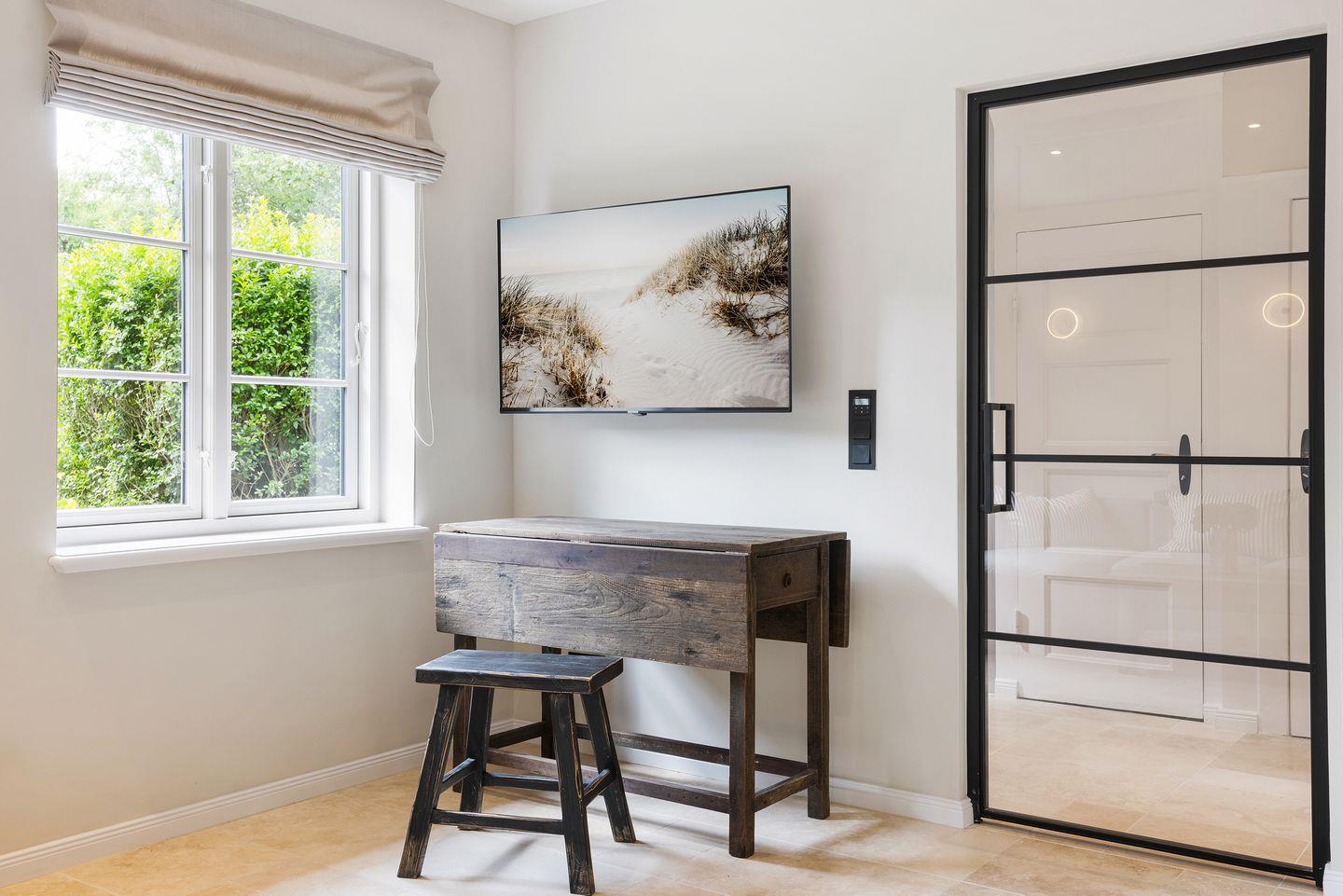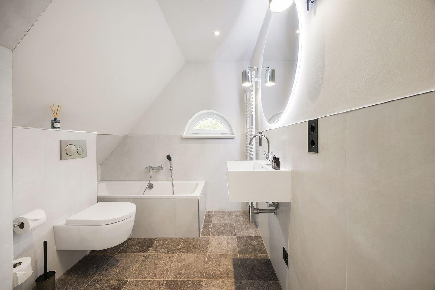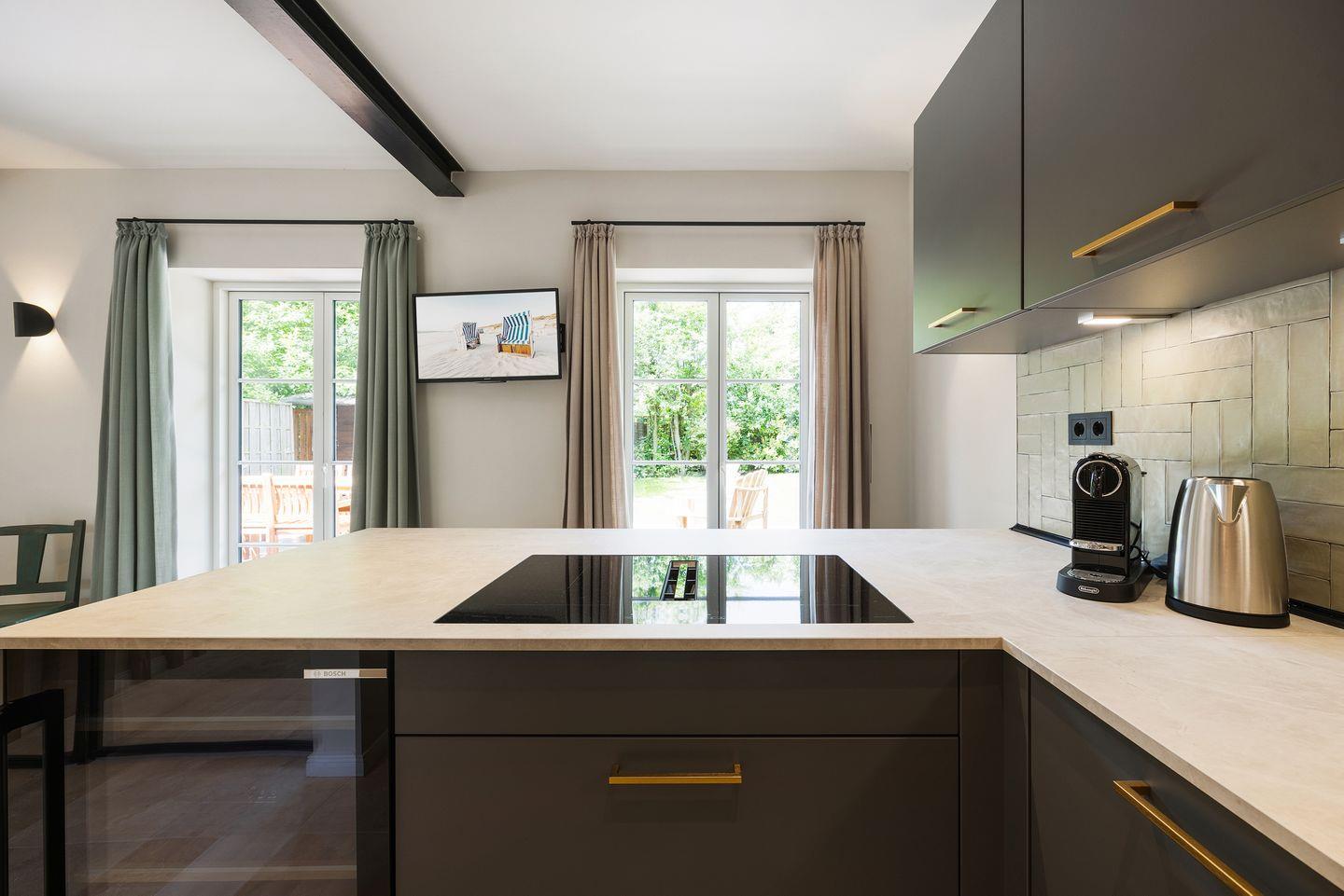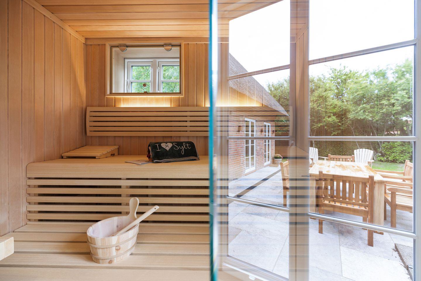 Ein besonderer Luxus dieses Hauses ist die eigene Sauna mit Regendusche, die nach einem erlebnisreichen Tag auf der Insel Erholung pur bietet. Die Unterkunft verfügt insgesamt über drei Badezimmer: Das Hauptbadezimmer im Obergeschoss ist mit einer großzügigen Badewanne und Dusche ausgestattet und bietet Tageslicht, einen Handtuchwärmer und einen Föhn. Ein weiteres Duschbad befindet sich im Erdgeschoss, und ein zusätzliches Vollbad mit Badewanne im Obergeschoss sorgt für hohen Komfort. Für Gäste steht im Erdgeschoss ein separates WC zur Verfügung.