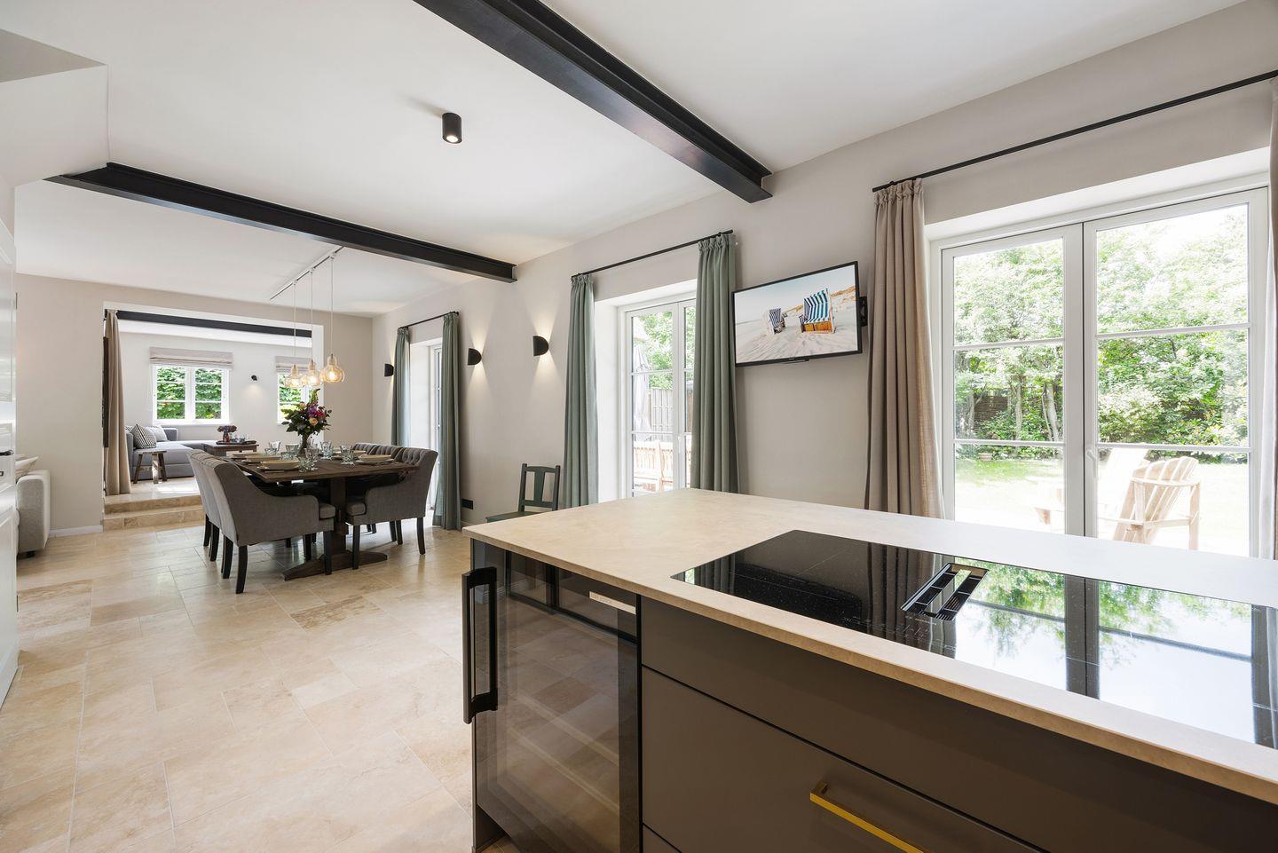 3 Schlafzimmer mit Doppelbett, offene Galerie mit Einzelbett (nur für Kinder) 3 Badezimmer mit Dusche und Wanne, Sauna mit Regendusche, Gäste-WC, Wohn-/Essbereich mit offener Küche sowie Zugang zur Terrasse und Garten mit hochwertigen Gartenmöbeln, Wohnzimmer, PKW-Stellplatz, WLAN (ohne Gewähr) vorhanden, Haustiere nicht gestattet.