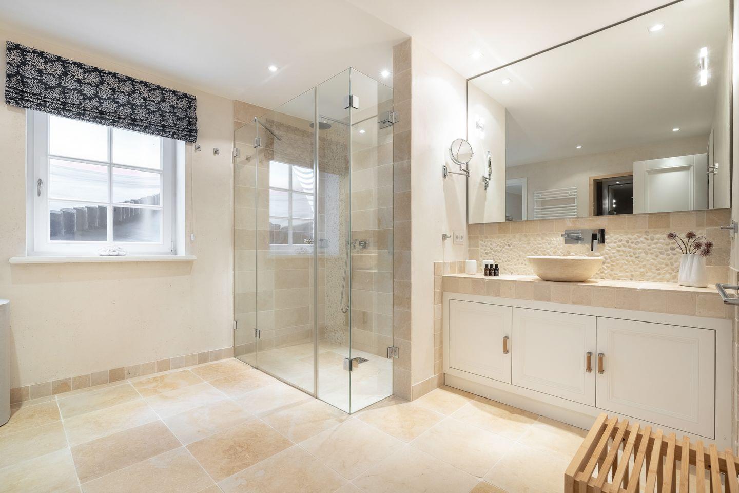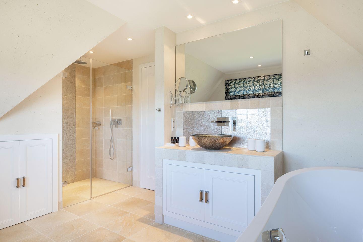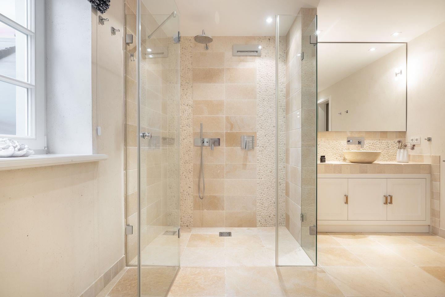 Die beiden luxuriösen Badezimmer vervollständigen das Wohlfühlambiente: Das Bad im OG verfügt über eine Badewanne und eine separate Regendusche, ideal für ein entspanntes Morgen- oder Abendritual. Das zweite Badezimmer im Wellnessbereich bietet eine ebenerdige Regendusche, ein separates WC und ist ebenfalls hochwertig eingerichtet. Ein zusätzliches Gäste-WC im Eingangsbereich sorgt für noch mehr Komfort.