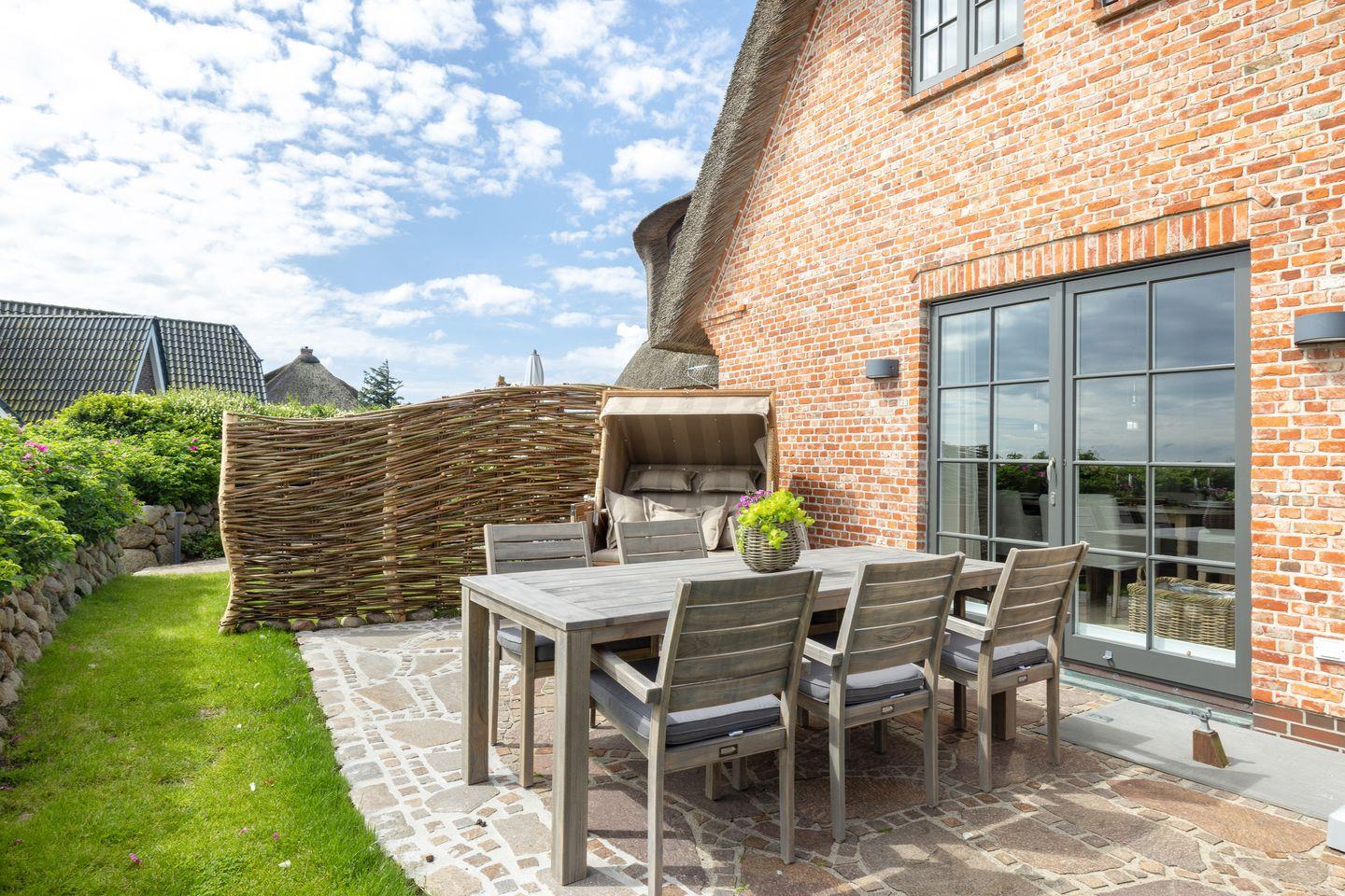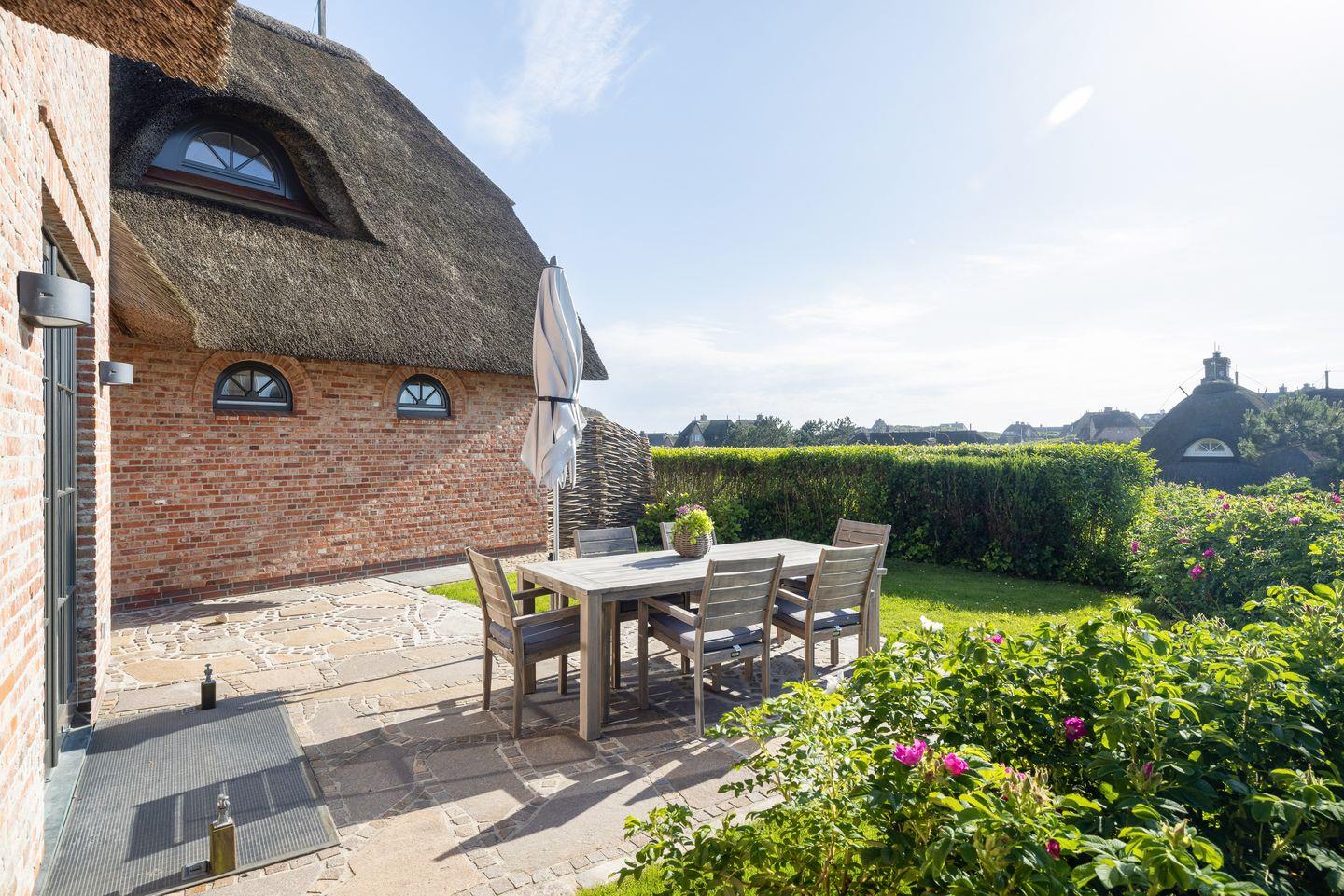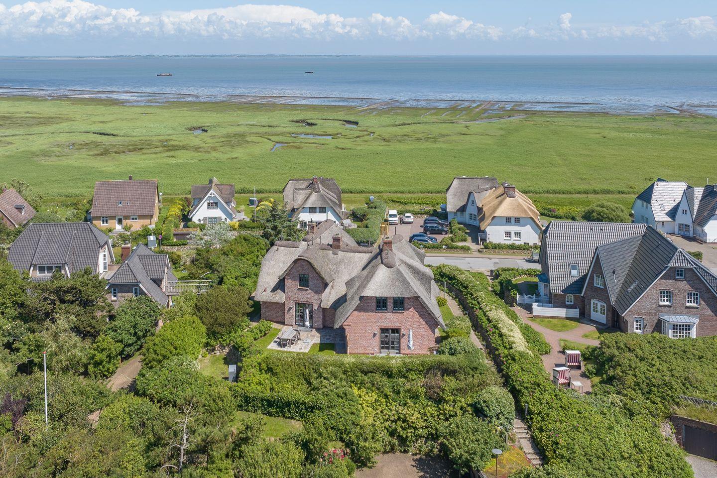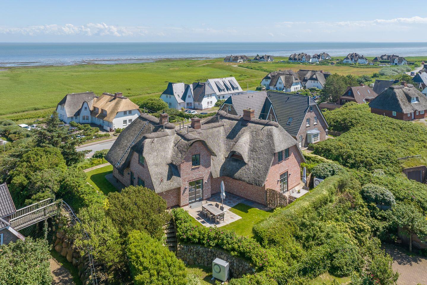 Dieses Reetdach-Hideaway in Rantum bietet auf rund 208 m² über drei Ebenen Platz für bis zu vier Personen. Es ist der ideale Ort für einen unvergesslichen Urlaub mit Familie oder Freunden. Die stilvolle Ausstattung und der beeindruckende Blick auf das Wattenmeer sorgen für eine außergewöhnliche Atmosphäre. Die hochwertige Küche, ausgestattet mit Weinkühlschrank, lädt zur Zubereitung kulinarischer Highlights ein. Vom großzügigen Essbereich aus gelangen Sie direkt auf die Ostterrasse, wo Sie bei beeindruckendem Panorama gemütliche Stunden verbringen können. Das Wohnzimmer mit Kamin und Terrasse nach Westen schafft den perfekten Rückzugsort für entspannte Abende.