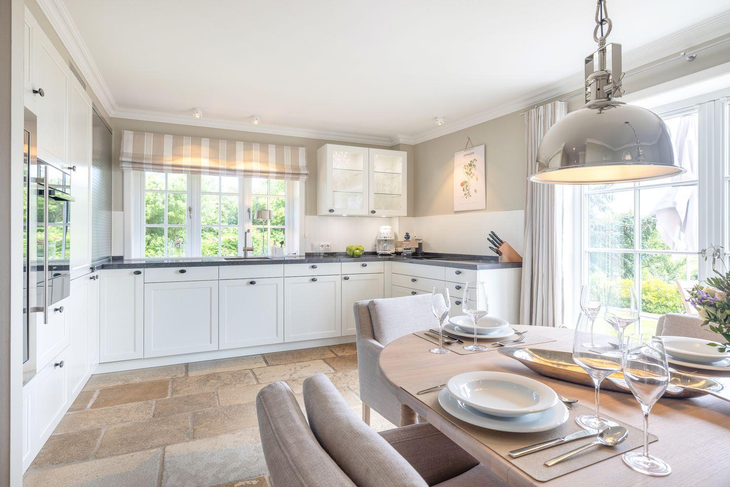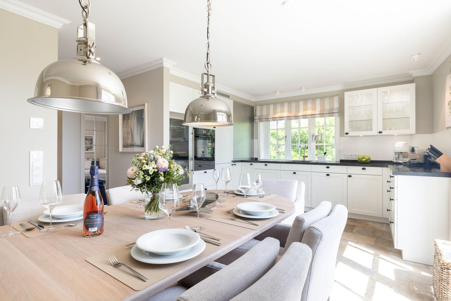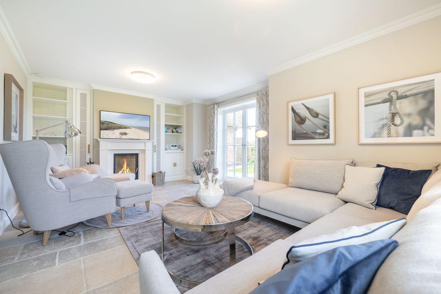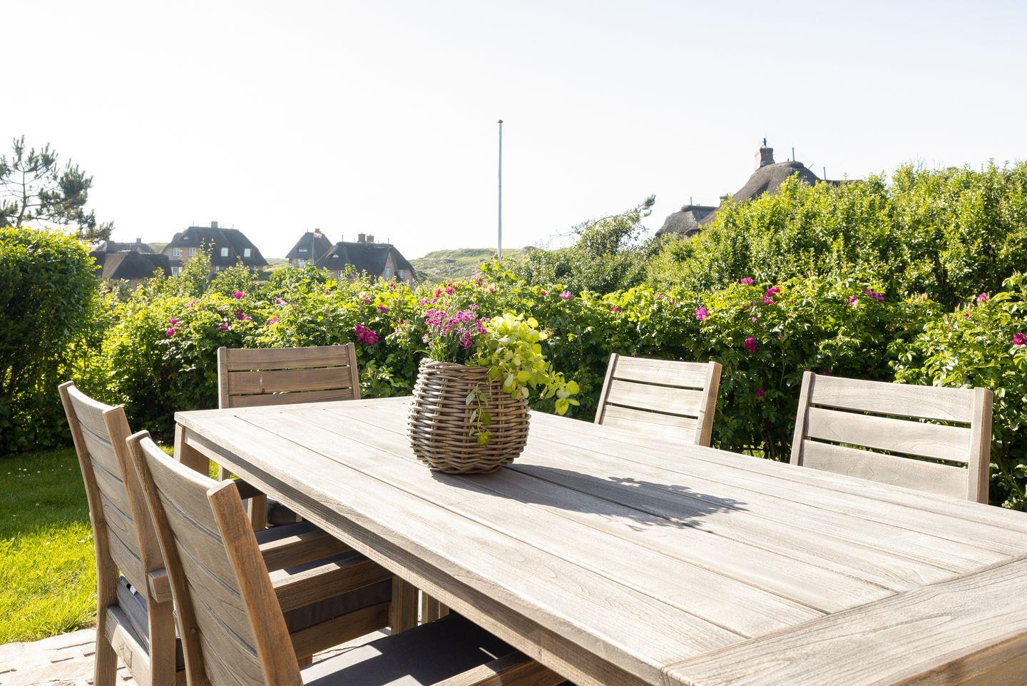 Dieses Reetdach-Hideaway in Rantum bietet auf rund 208 m² über drei Ebenen Platz für bis zu vier Personen. Es ist der ideale Ort für einen unvergesslichen Urlaub mit Familie oder Freunden. Die stilvolle Ausstattung und der beeindruckende Blick auf das Wattenmeer sorgen für eine außergewöhnliche Atmosphäre. Die hochwertige Küche, ausgestattet mit Weinkühlschrank, lädt zur Zubereitung kulinarischer Highlights ein. Vom großzügigen Essbereich aus gelangen Sie direkt auf die Ostterrasse, wo Sie bei beeindruckendem Panorama gemütliche Stunden verbringen können. Das Wohnzimmer mit Kamin und Terrasse nach Westen schafft den perfekten Rückzugsort für entspannte Abende.