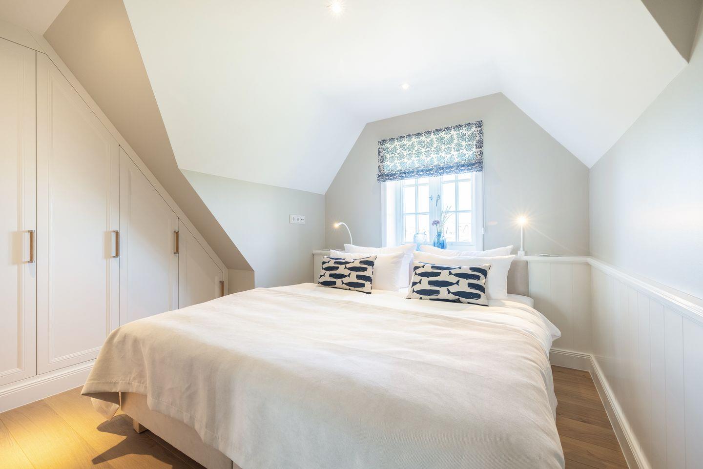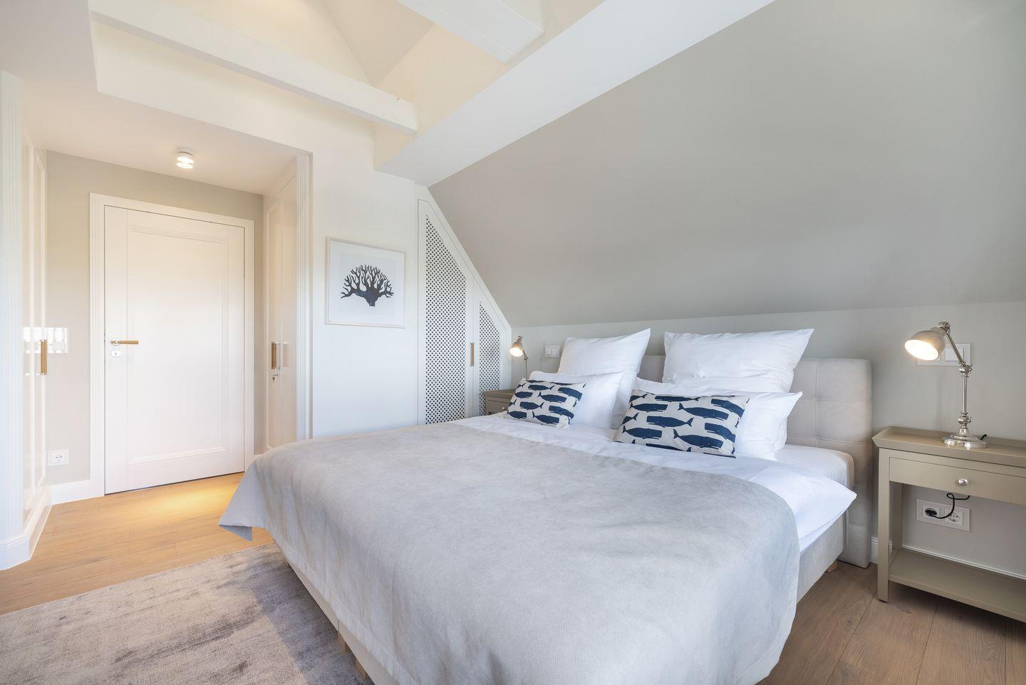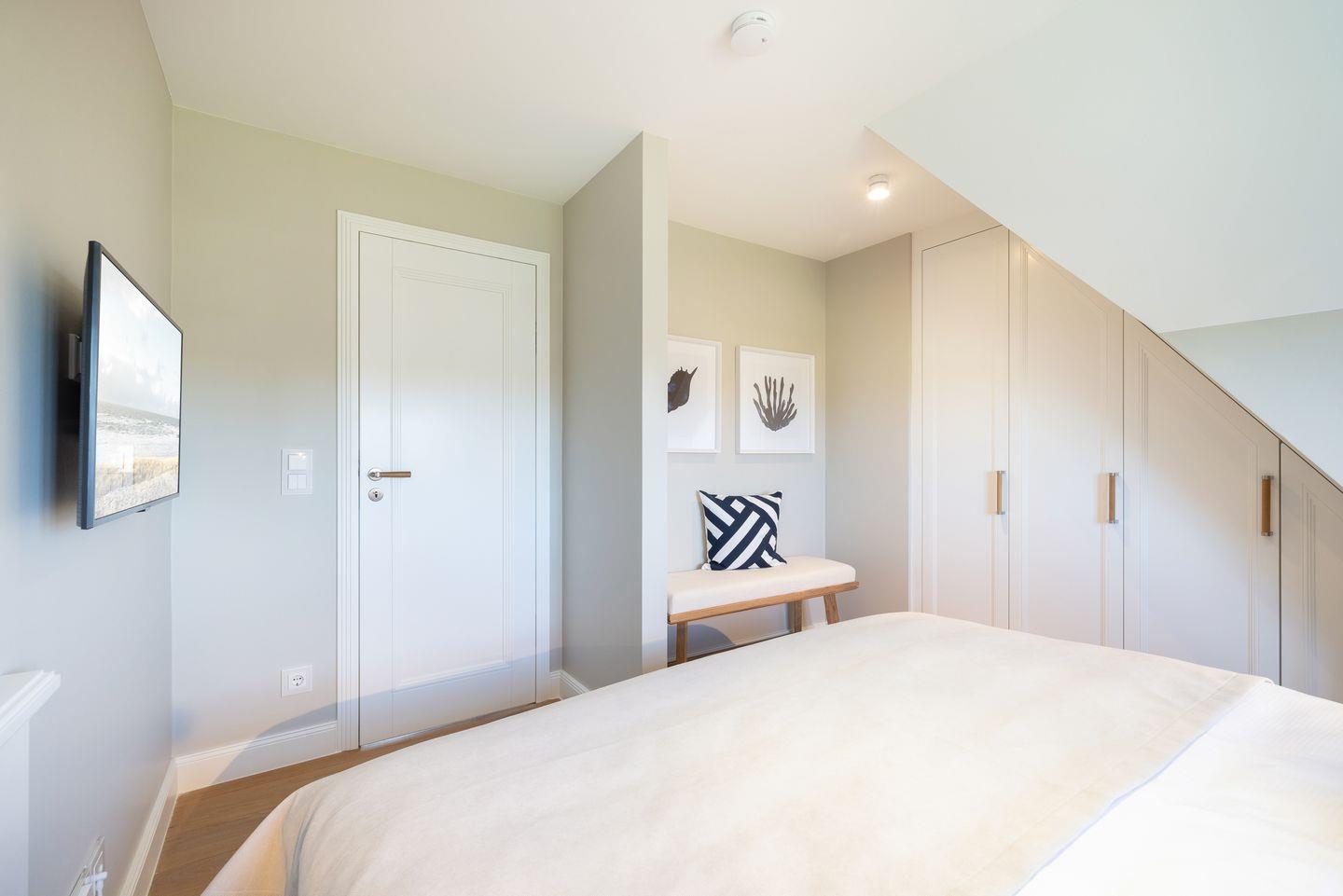 Die großzügigen Schlafzimmer sind mit hochwertigen Doppelbetten und TV ausgestattet und bieten maximalen Komfort. Das Hauptschlafzimmer mit Blick nach Osten lässt Sie den Morgen mit dem wunderschönen Wattenmeerblick begrüßen. Hochwertige Holzeinbauten unterstreichen den luxuriösen Charakter der geschmackvollen Einrichtung.