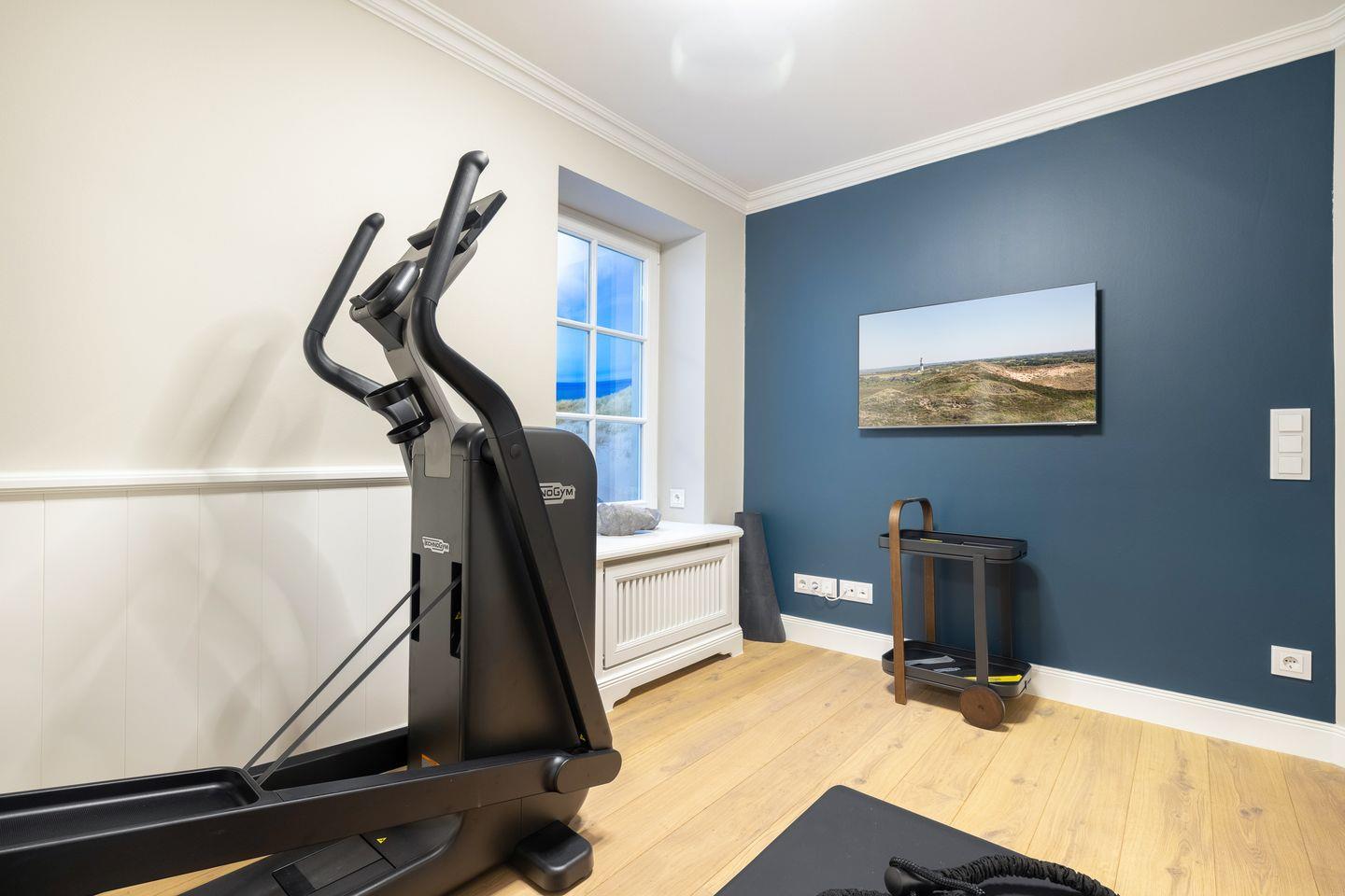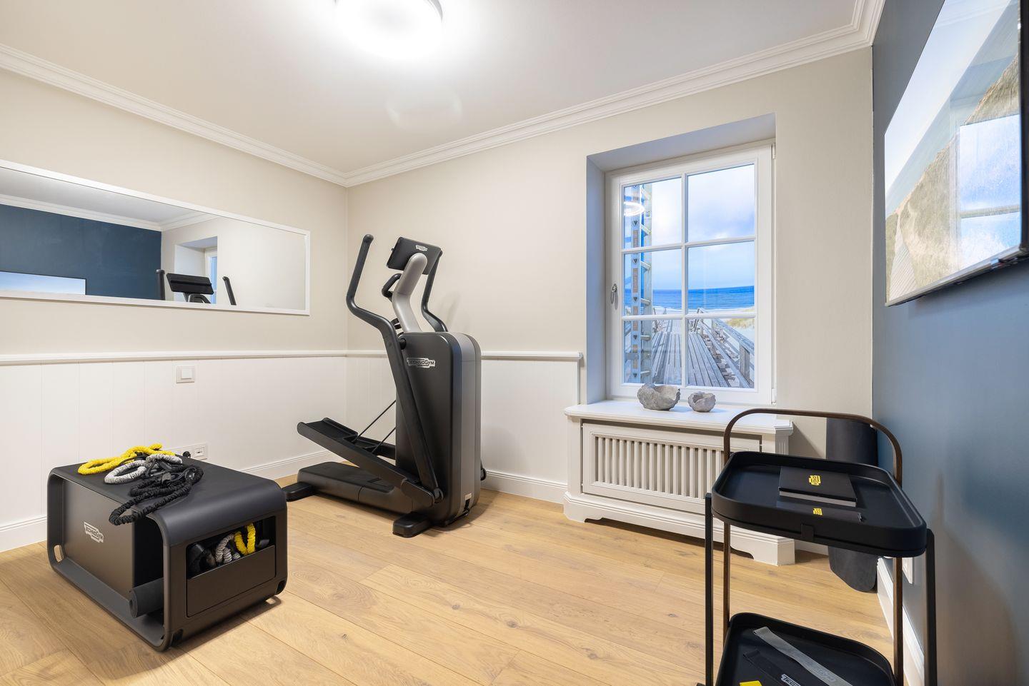 Nach einem erlebnisreichen Tag genießen Sie die Annehmlichkeiten der privaten Wellness-Oase mit Sauna und modernem Fitnessraum, ausgestattet mit Technogym-Geräten und TV. Hier finden Sie die ideale Balance zwischen Entspannung und Aktivität, ganz nach Ihren Bedürfnissen.