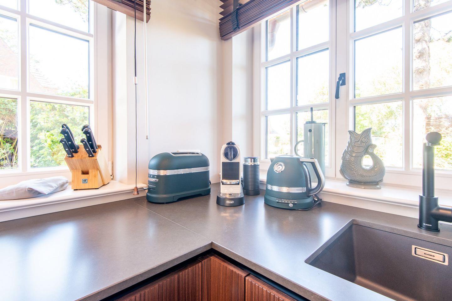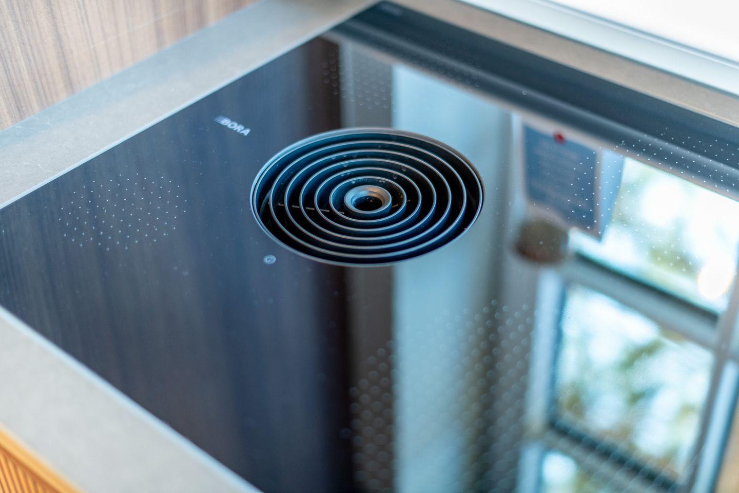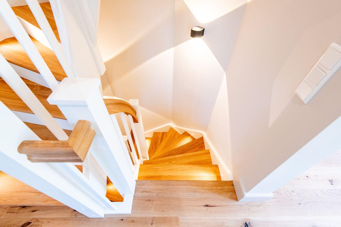 Die offene Küche ist ein echtes Highlight: Mit eleganten Nussbaumholzfronten, Natursteinarbeitsplatte und durchdachter Beleuchtung setzt sie stilvolle Akzente. Moderne Geräte wie das Miele-Induktionskochfeld mit integriertem Wrasenabzug, ein Einbaubackofen mit Dampffunktion und eine großzügige Kühl-/Gefrierkombination bieten jeden Komfort für genussvolles Kochen und gemeinsame Mahlzeiten.