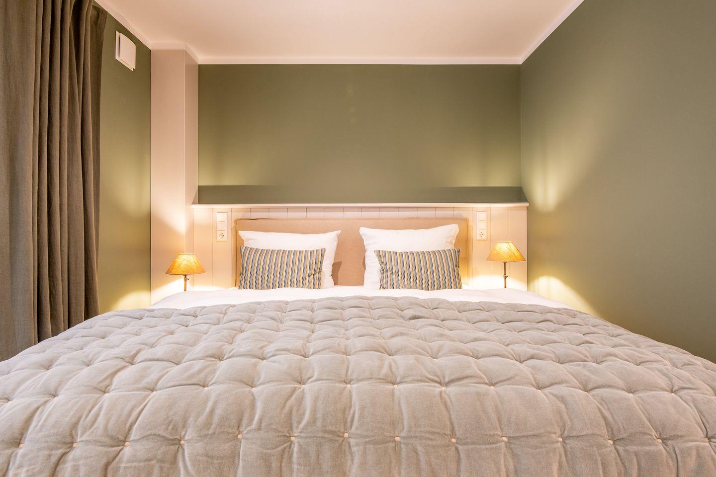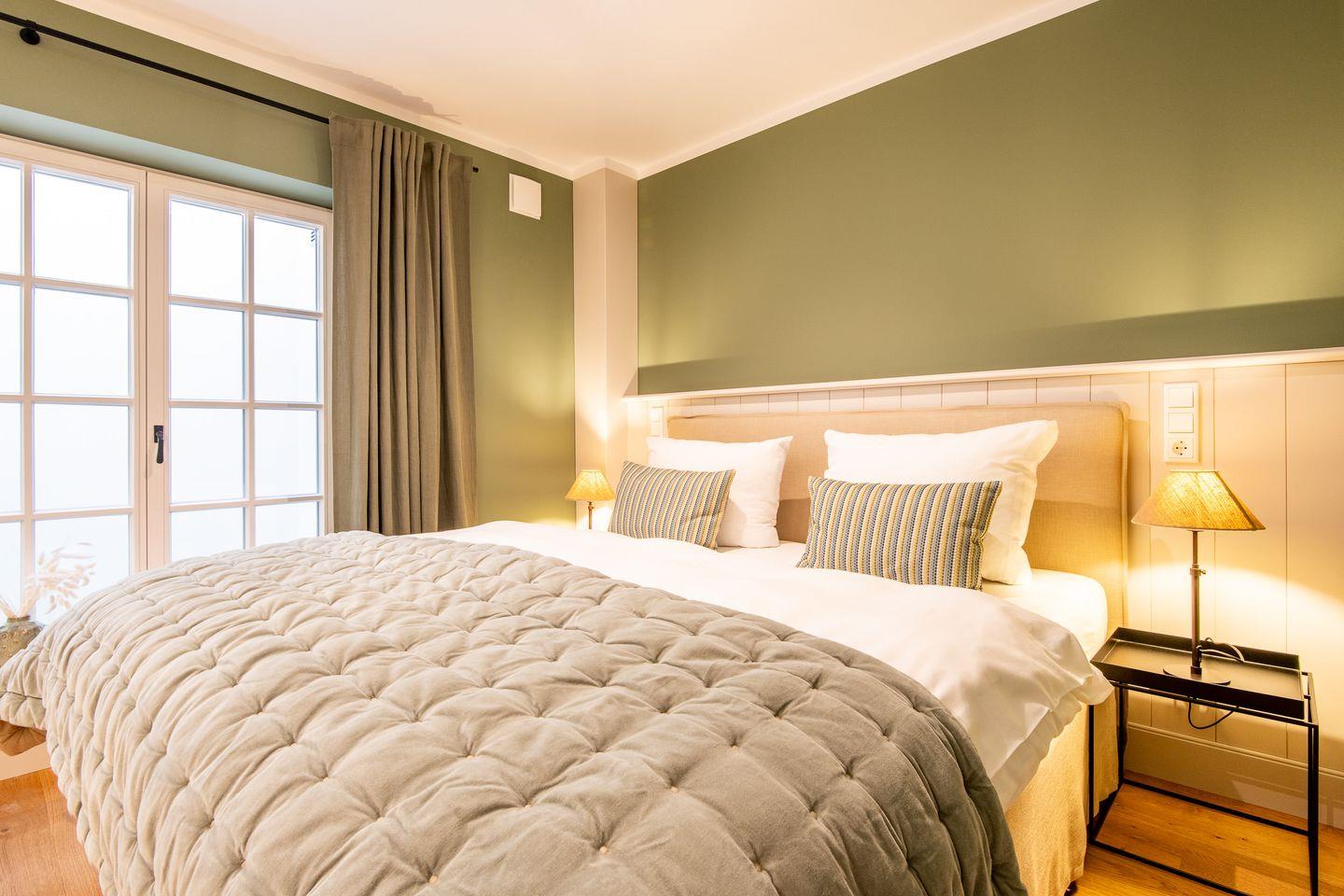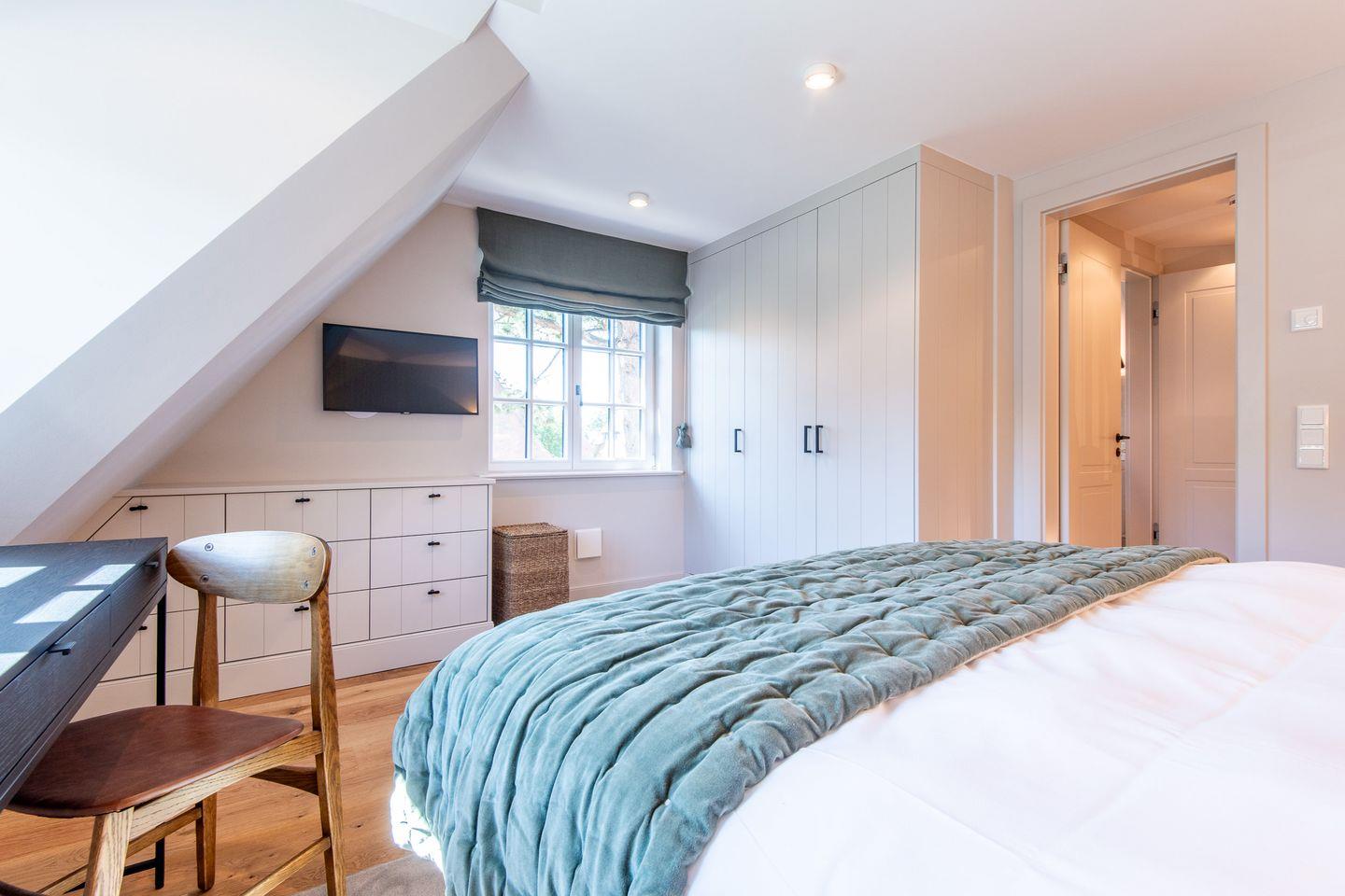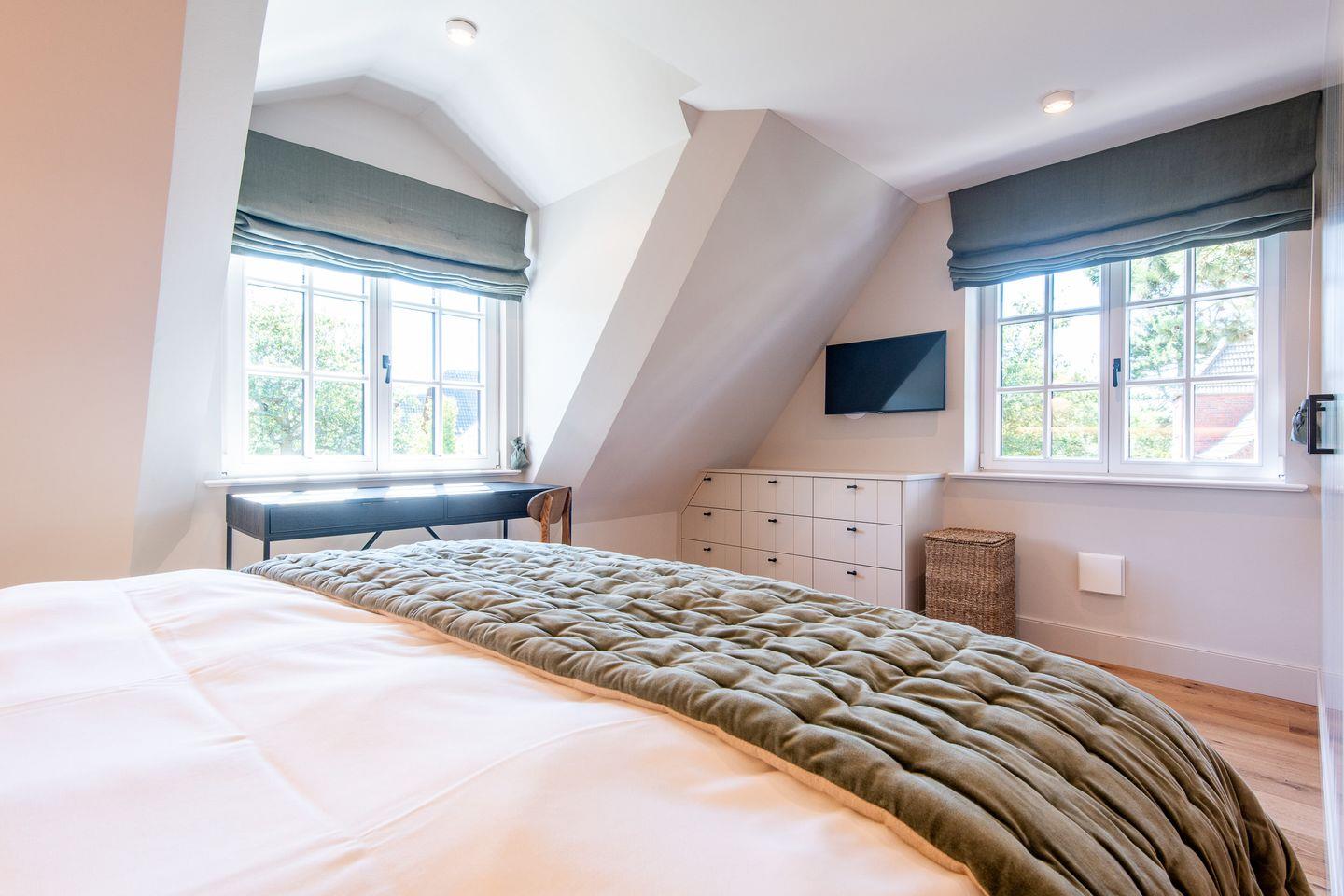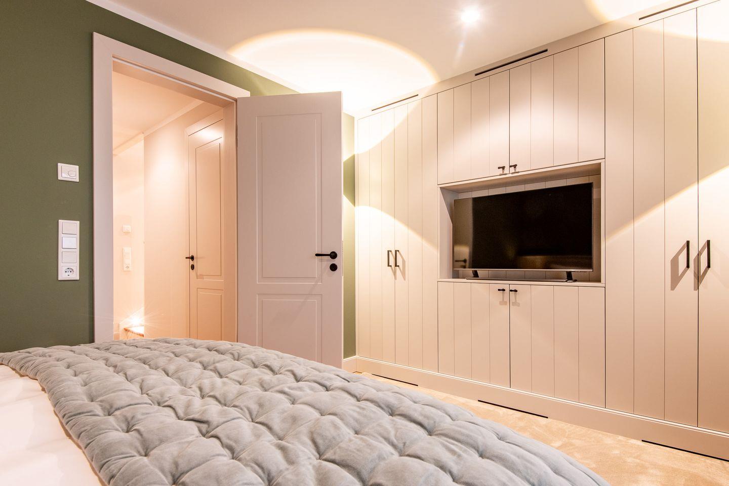 Die drei stilvoll gestalteten Schlafzimmer bieten erholsamen Schlaf und ein gemütliches Ambiente. Im ersten Schlafzimmer erwartet Sie ein großzügiges Doppelbett (180x200 cm), ein geräumiger Kleiderschrank und ein TV. Das Hauptschlafzimmer ist ebenfalls mit einem komfortablen Doppelbett (180x200 cm) ausgestattet und bietet zusätzlich einen Schreibtisch, ideal als kleine Arbeitsecke. Das dritte Schlafzimmer verfügt über zwei Einzelbetten (je 100x200 cm), die ausgezogen zu einem Doppelbett werden können, sowie einen Einbauschrank. Alle Zimmer sind harmonisch gestaltet und versprechen wohltuende Erholung.