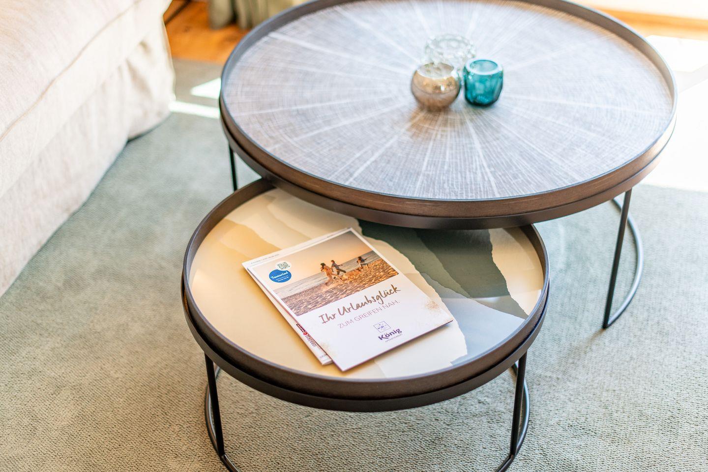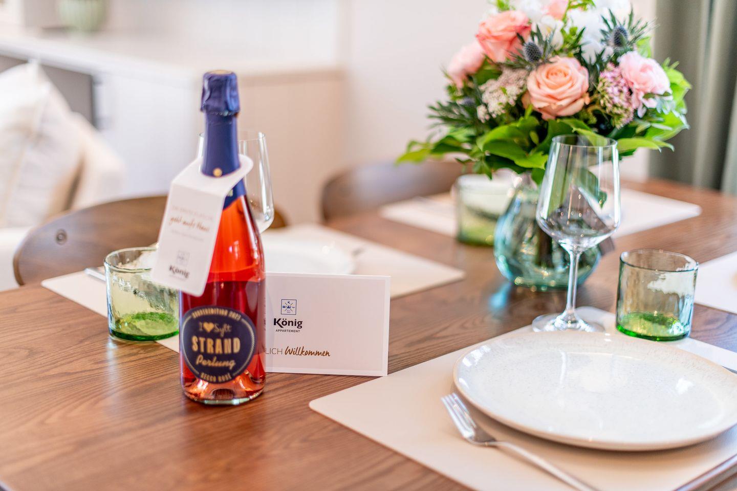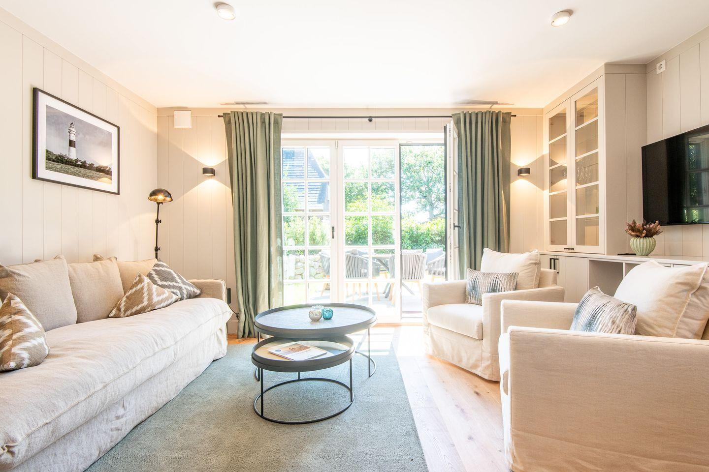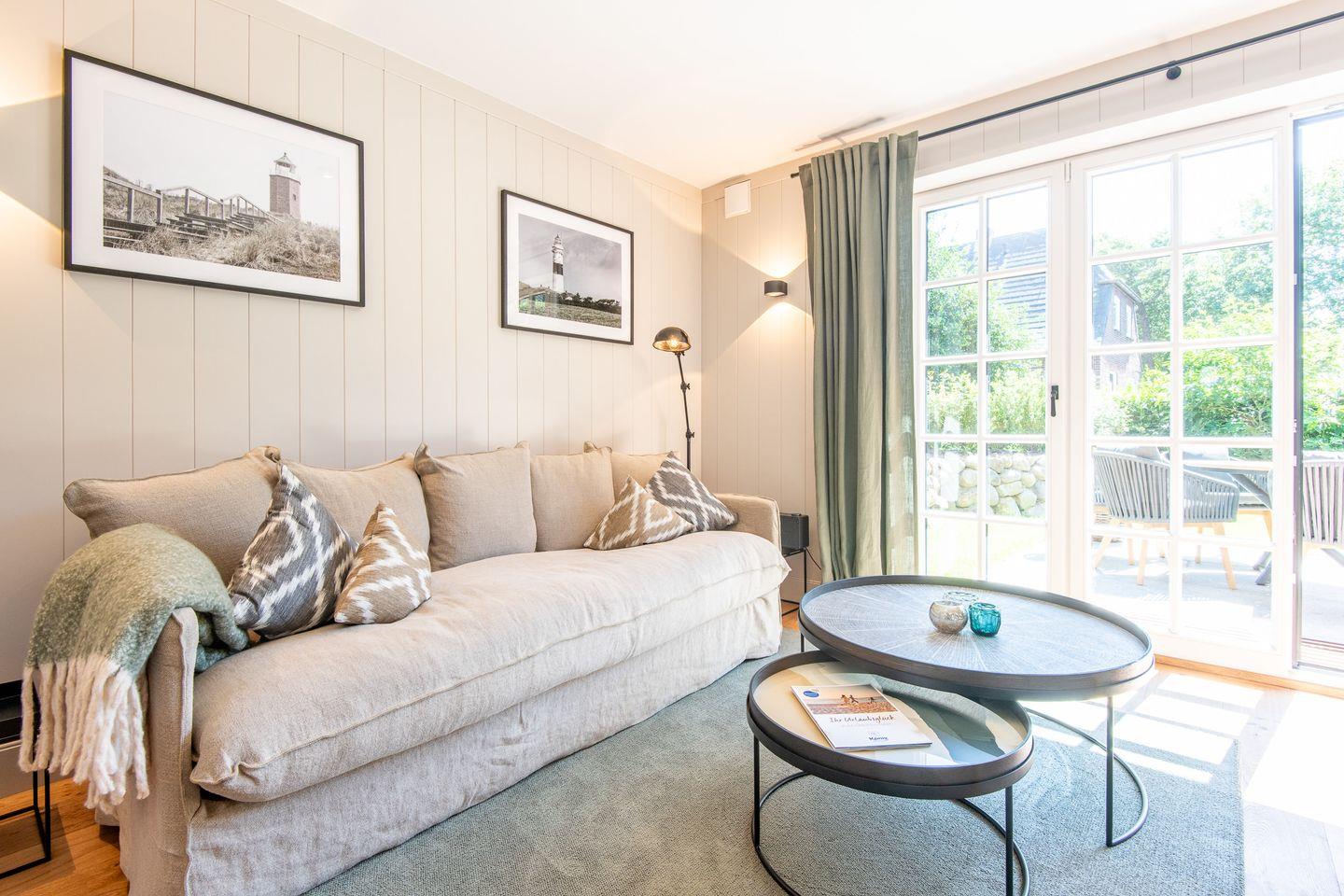 Im großzügigen Wohn- und Esszimmer laden ein gemütliches Sofa und ein Esstisch für bis zu 6 Personen zum Verweilen ein. Der Raum öffnet sich zur Süd- und Westterrasse mit Blick in den eigenen Garten – ein Ort, um die Sonne und die frische Nordseeluft in privater Atmosphäre zu genießen. Stilvolle Details und eine moderne Ausstattung machen den Wohnbereich zu einem Rückzugsort der Erholung.