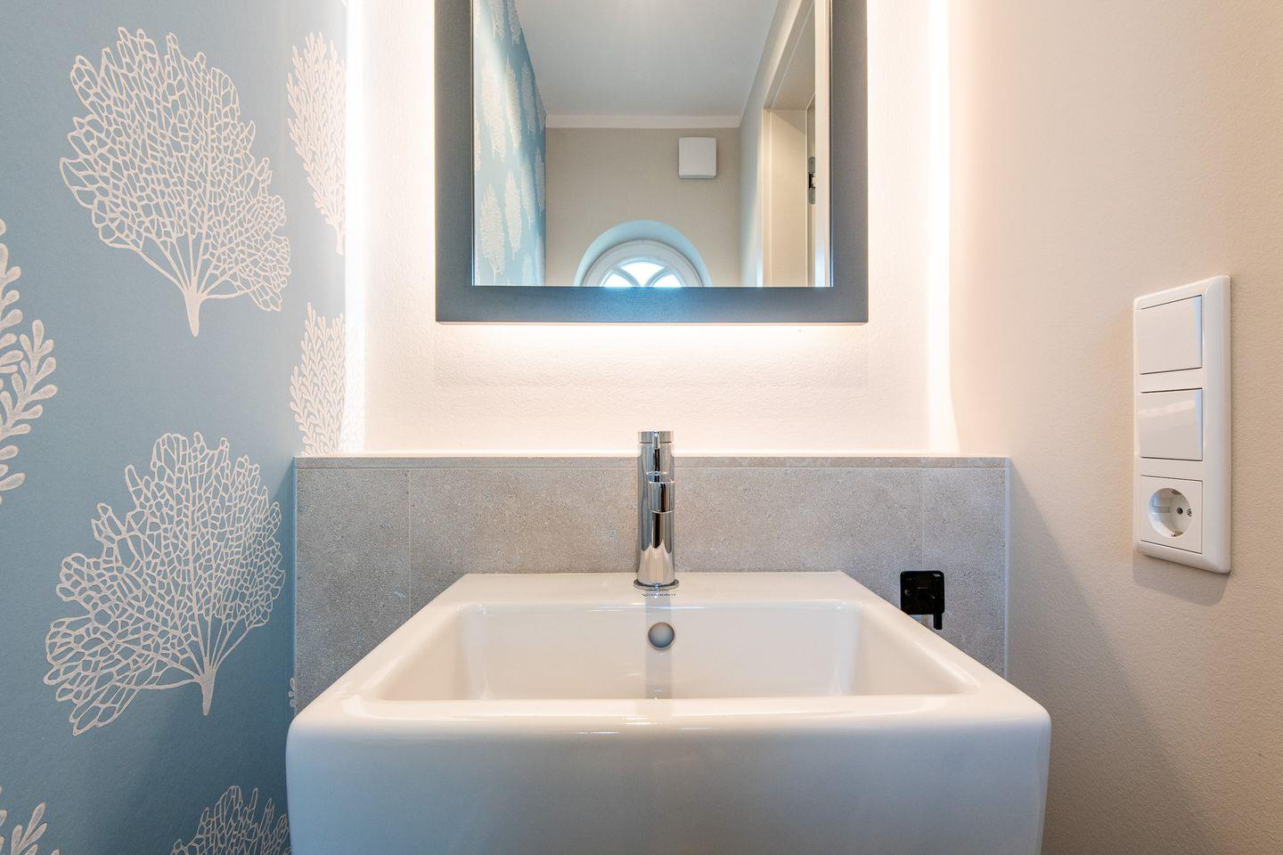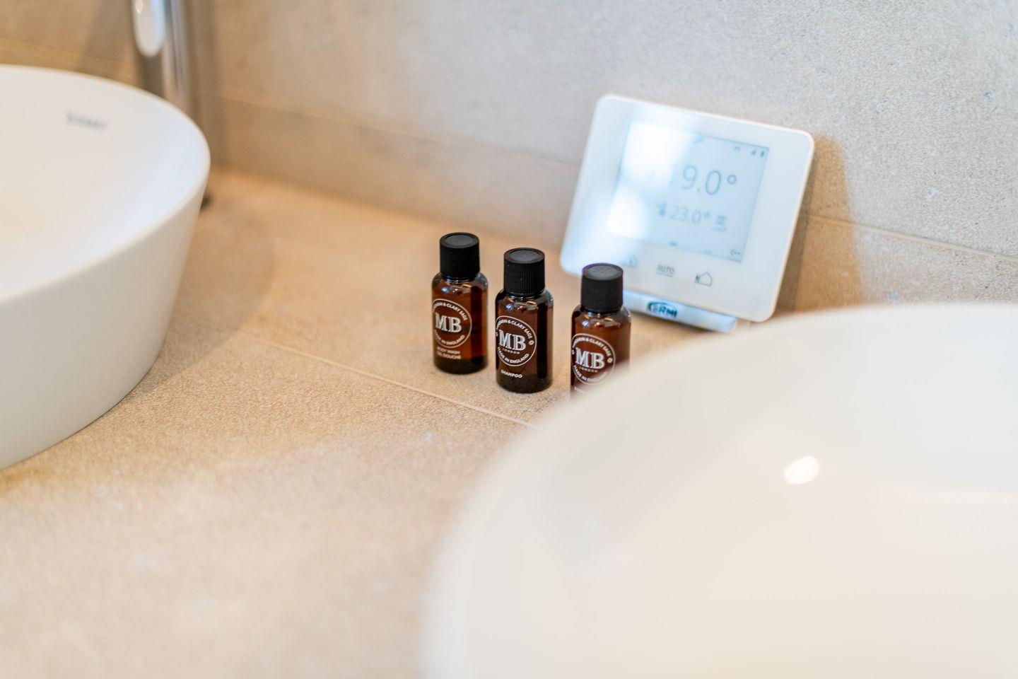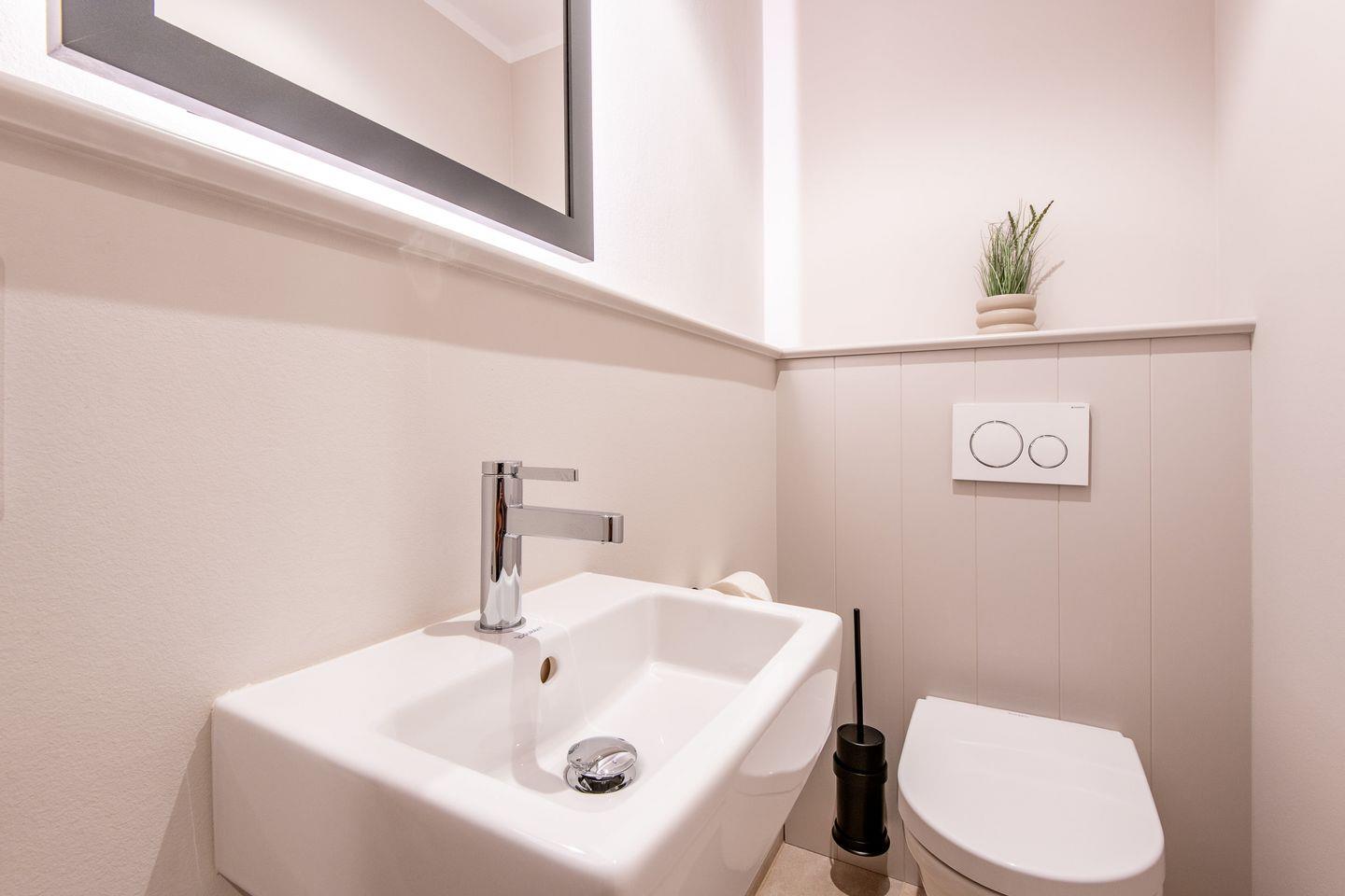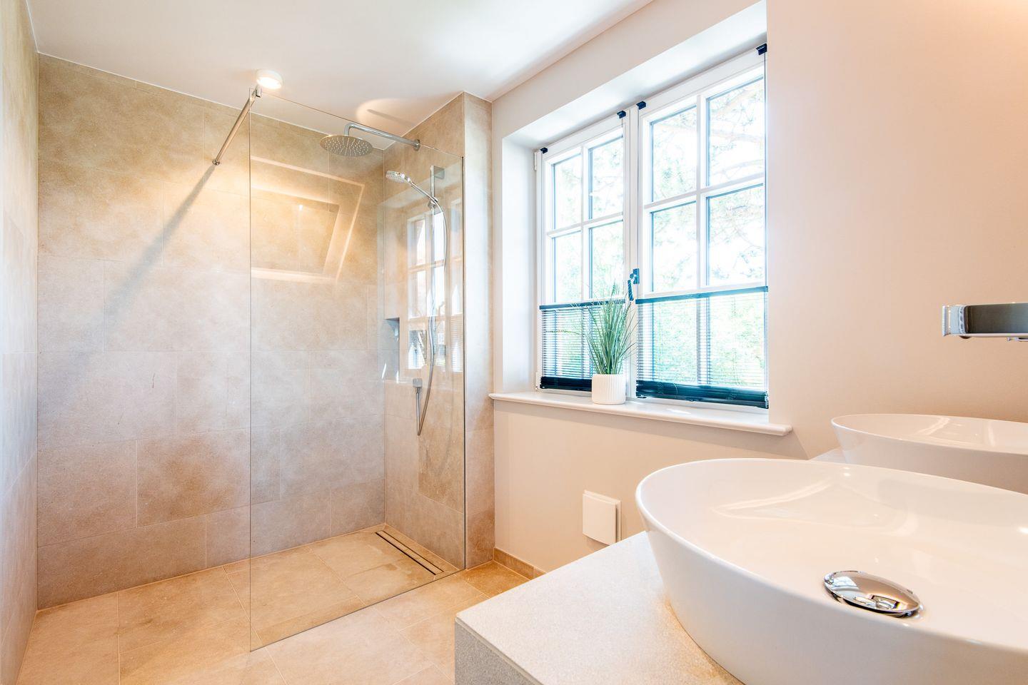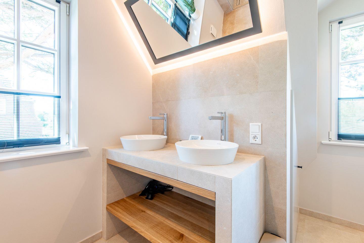 Die beiden modernen Badezimmer sowie ein zusätzliches Gäste-WC bieten höchsten Komfort. Das luxuriöse Wellnessbad mit privater Sauna und bodengleicher Dusche lädt zur puren Entspannung ein, während das zweite Badezimmer mit Doppelwaschtisch, Tageslicht, bodengleicher Dusche, separatem WC und Handtuchwärmer ebenfalls eine ideale Wohlfühl-Oase darstellt.