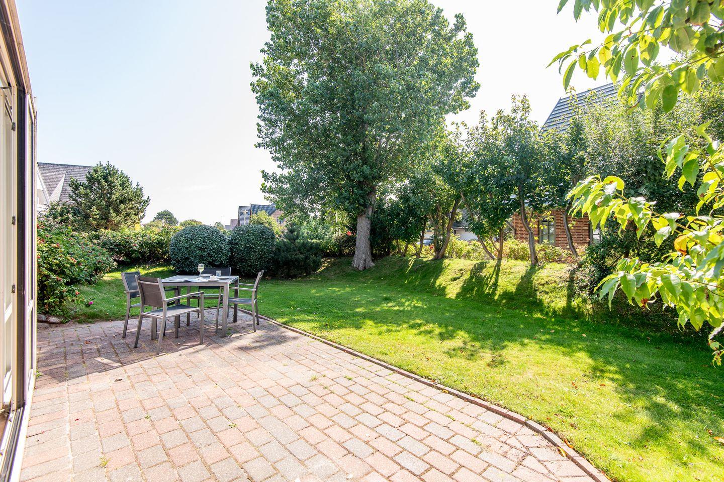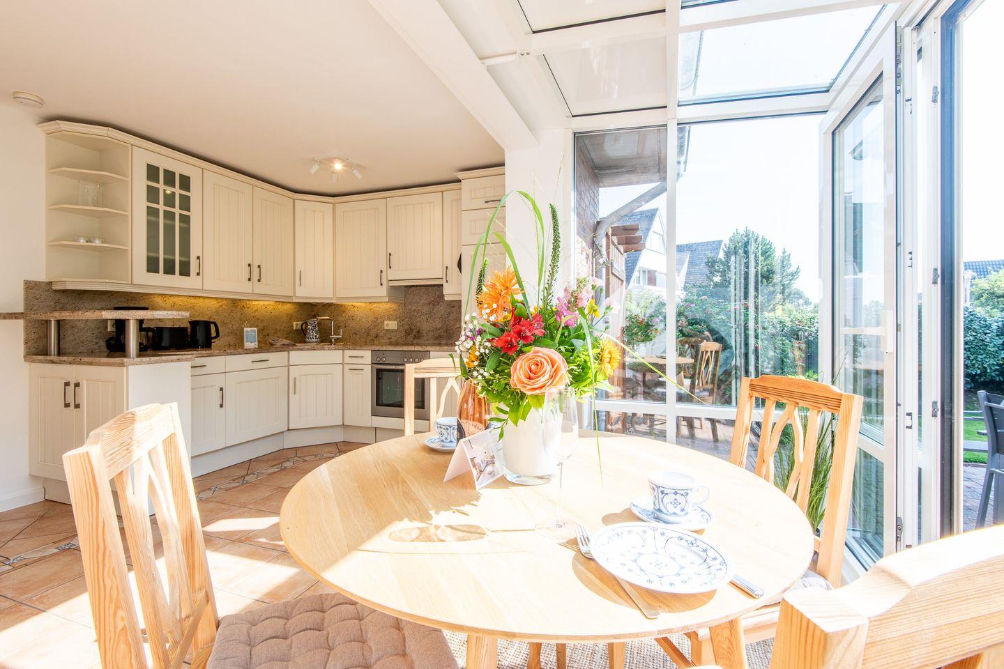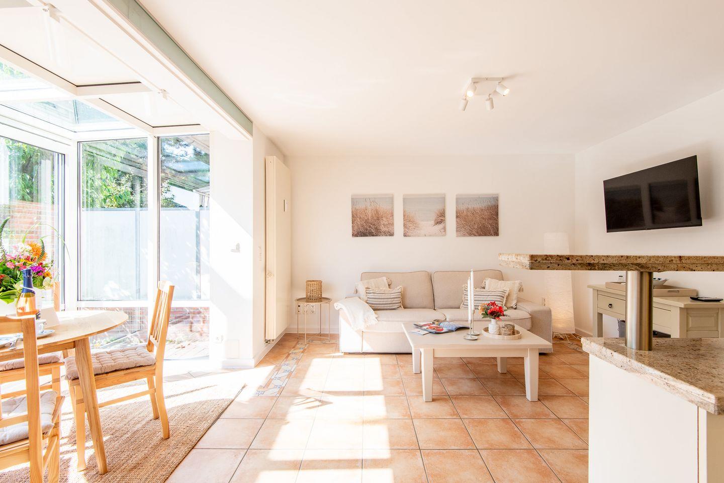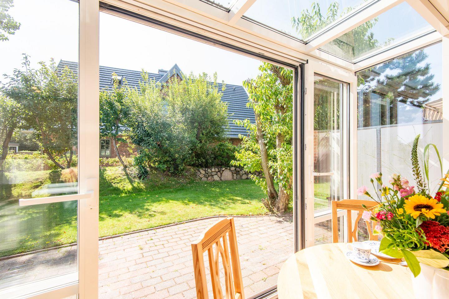 Ein echtes Highlight ist der helle, komplett verglaste Wintergarten mit Zugang zur möblierten Südterrasse. Hier genießen Sie die Sylter Sonne vom Frühstück bis zum Sonnenuntergang – ob beim Lesen, Essen oder einfach beim Entspannen im Freien.