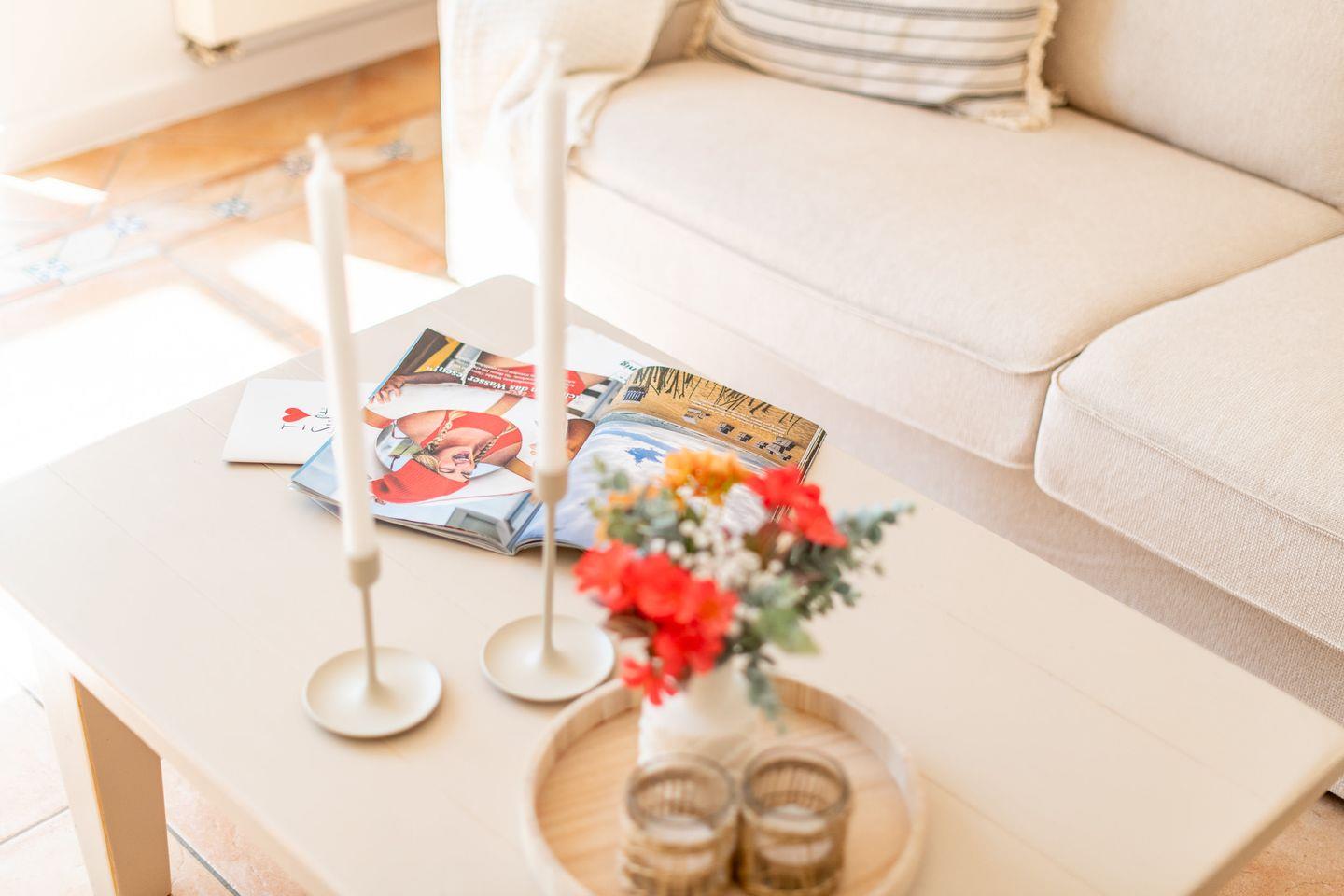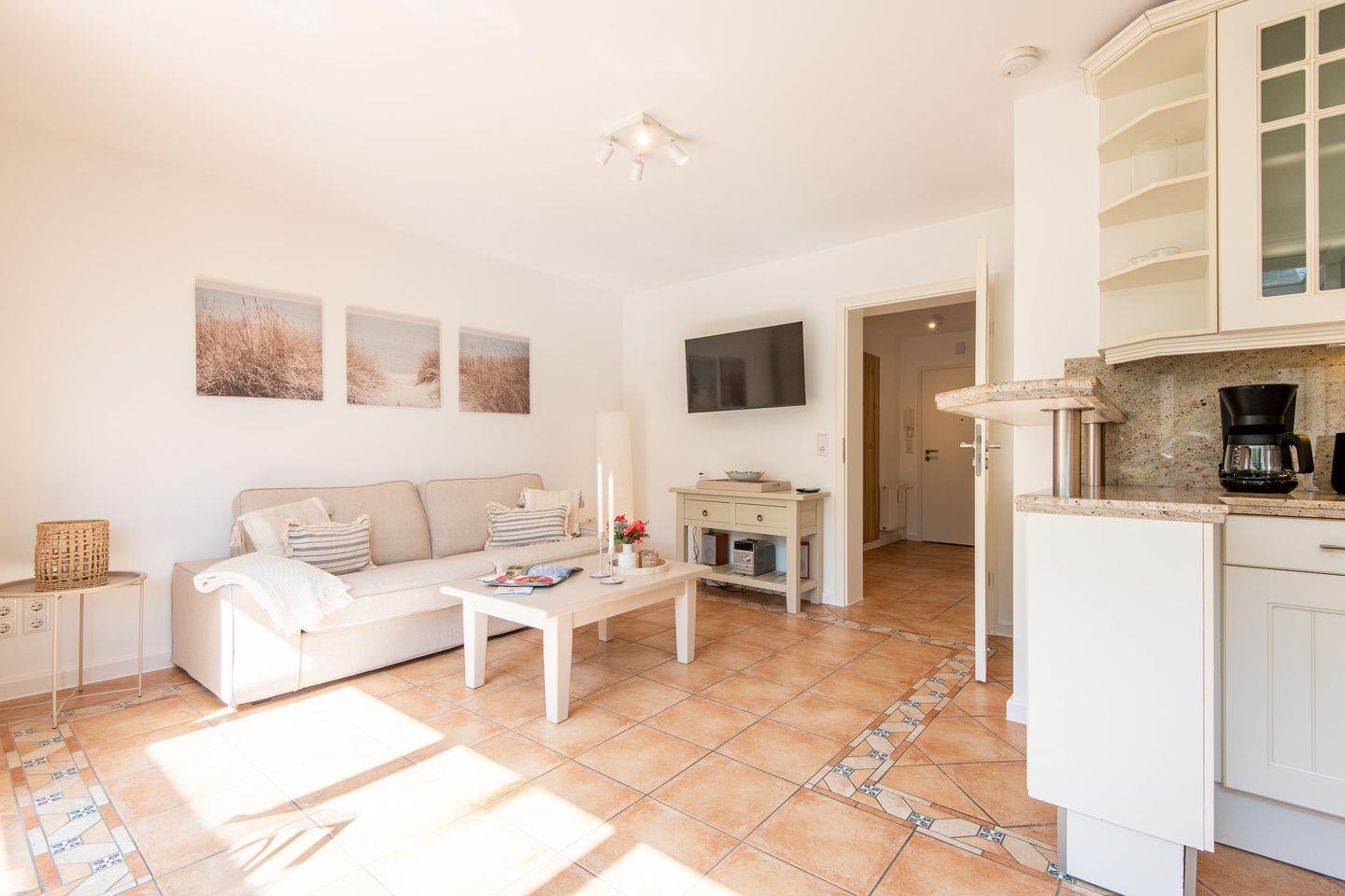 Die Wohnung befindet sich ebenerdig und bietet einen durchdachten Grundriss mit offener Raumgestaltung. Der gemütliche Wohn- und Essbereich lädt zum Verweilen ein – ideal für entspannte Stunden nach einem ausgiebigen Strandspaziergang oder einem Tagesausflug über die Insel.