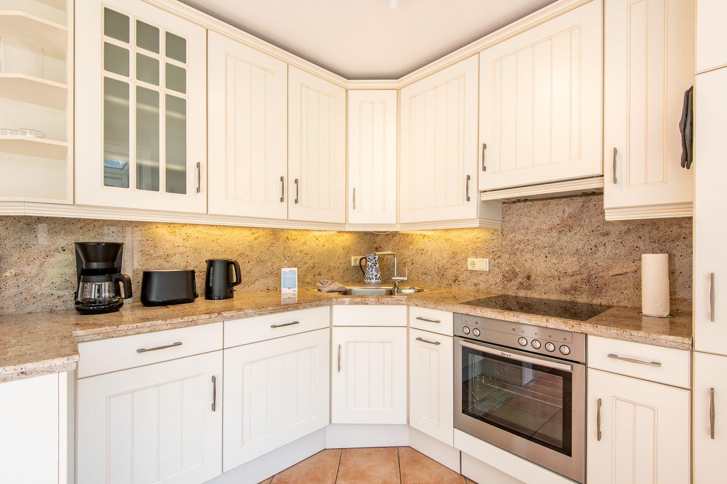 Die geräumige, offene Küche ist voll ausgestattet und lässt keine Wünsche offen – ob ein vollwertiges Frühstück für einen guten Start in den Tag, einen köstlichen Kaffee oder eine genussvolle Mahlzeit am Abend. Hier haben Sie alles, was Sie zum Kochen und Genießen brauchen, direkt zur Hand und viel Stauraum für Ihre Vorräte.