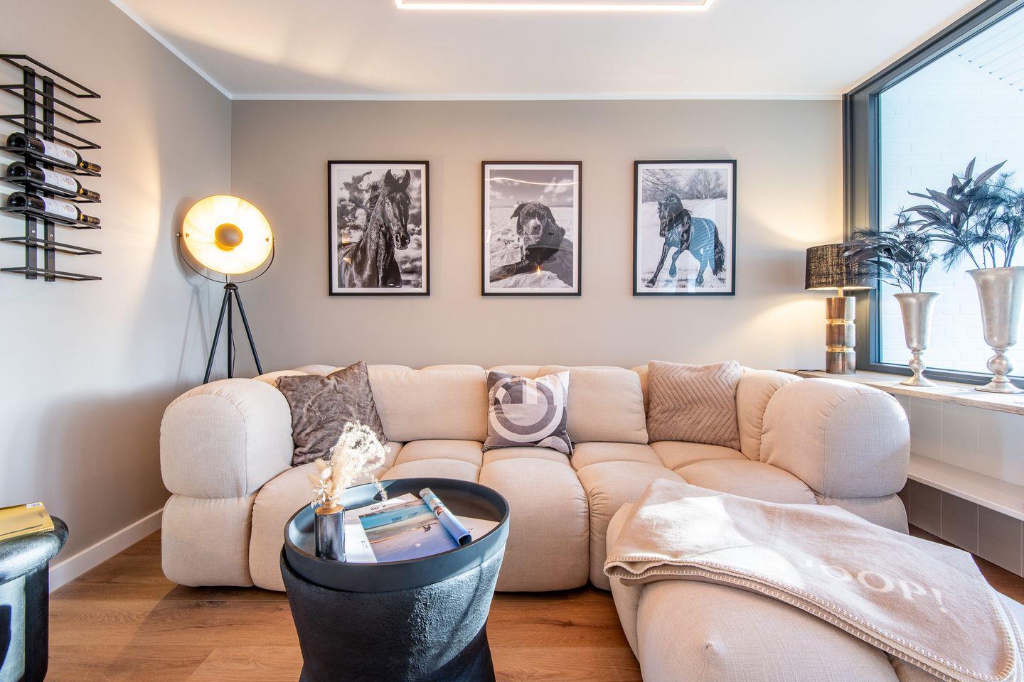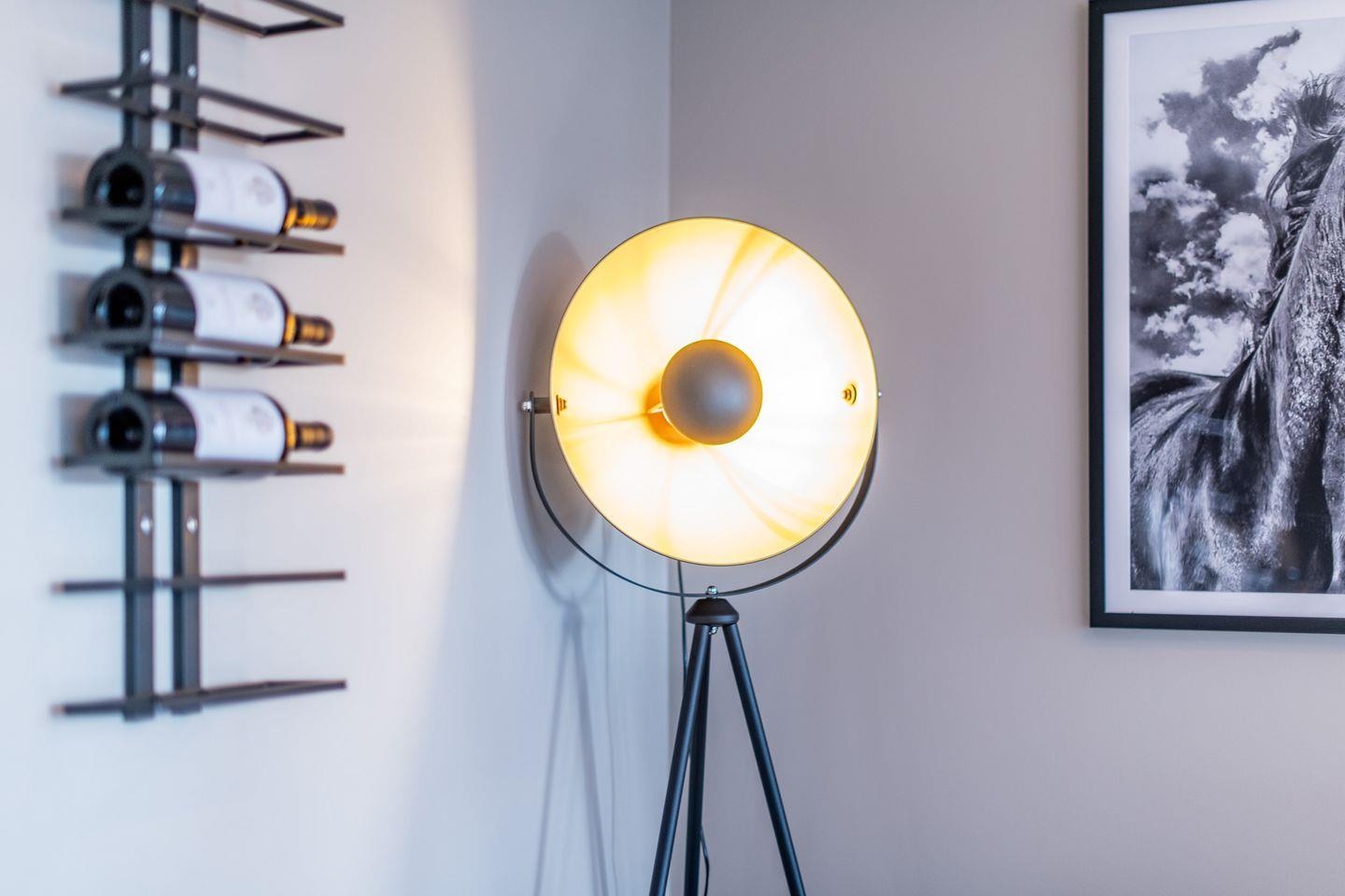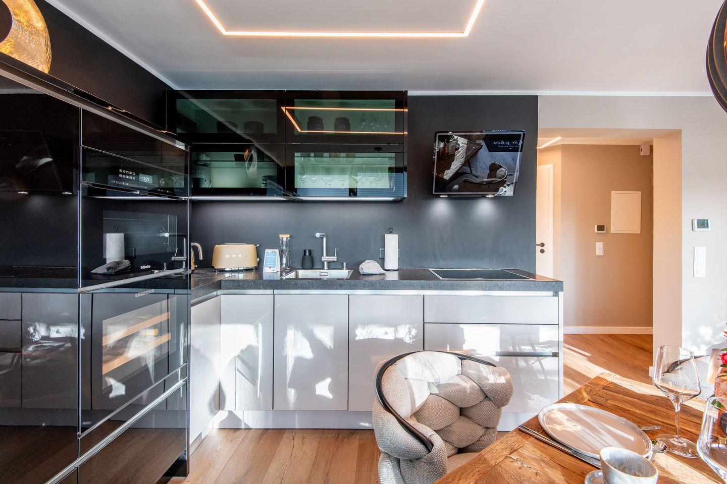 Die offen gestaltete Küche fügt sich stilvoll in den Wohnraum ein und begeistert mit einer luxuriösen Ausstattung: Induktionskochfeld, Backofen mit Dampfgarfunktion, ein Kühlschrank mit Gefrierfach sowie Küchengeräte von SMEG lassen keine Wünsche offen. Eine Nespresso-Kapselmaschine sorgt für den perfekten Start in den Tag. Der in die Küchenfront integrierte Weinkühlschrank rundet das exklusive Angebot ab.