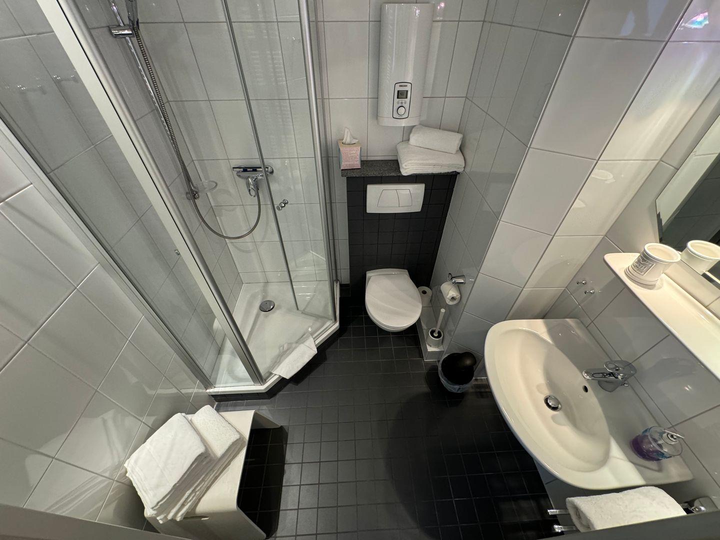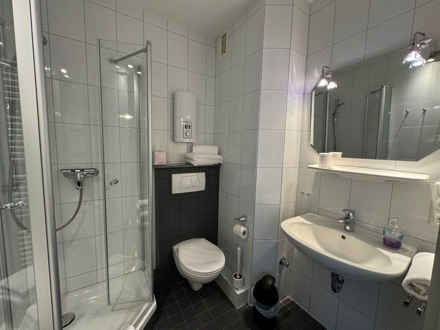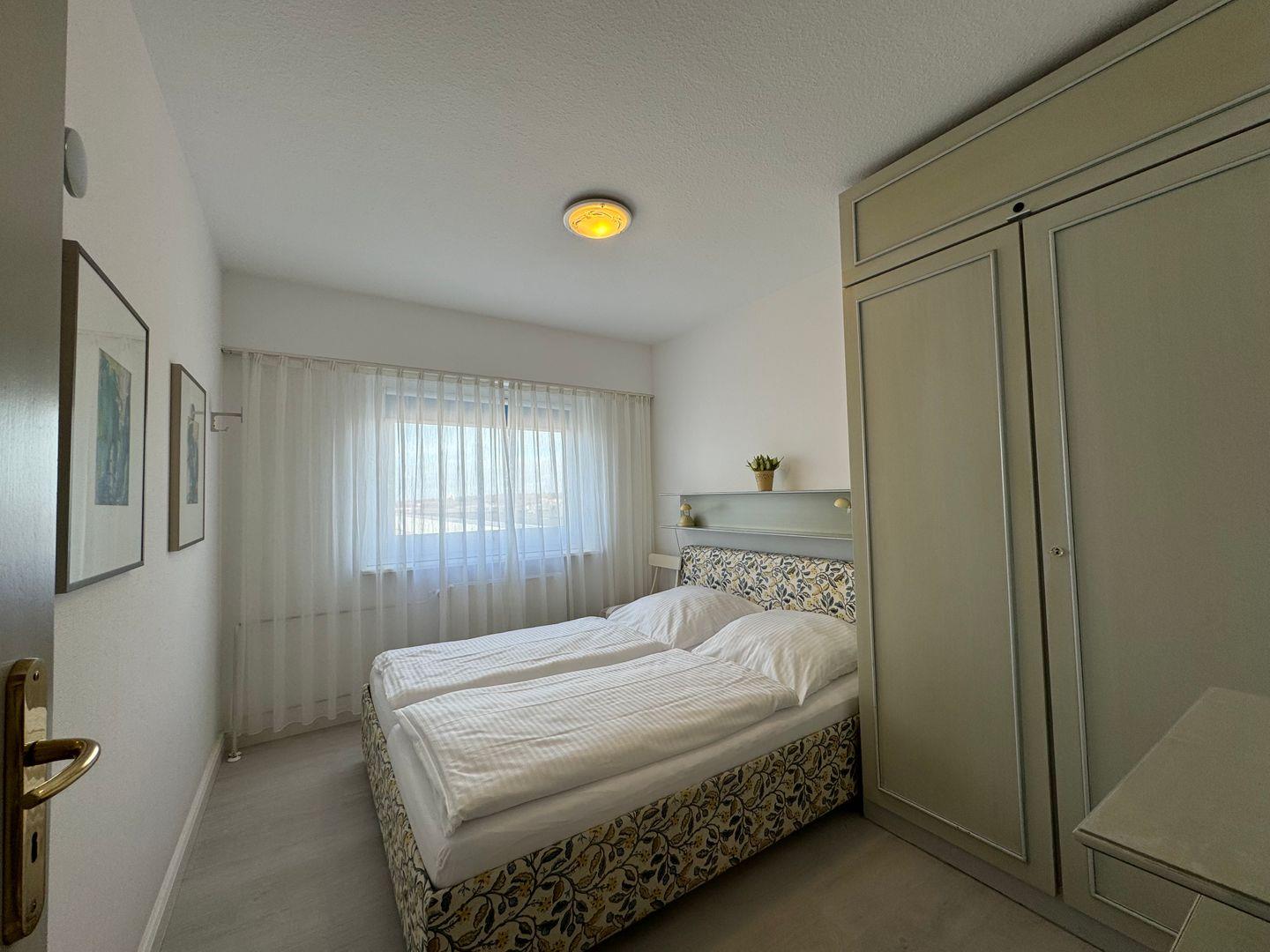 Das Schlafzimmer bietet mit einem gemütlichen Bett und reichlich Stauraum eine wohlige Rückzugsmöglichkeit. Auch hier ist der Boden in stilvollem Vinyl gehalten. Die Badezimmerausstattung lässt keine Wünsche offen: Hier finden Sie eine moderne Dusche, ein Waschbecken und eine Toilette sowie einen Haartrockner und Kosmetikspiegel, die Ihren Aufenthalt komfortabel gestalten. Frische Handtücher und Bettwäsche sind selbstverständlich im Preis enthalten.