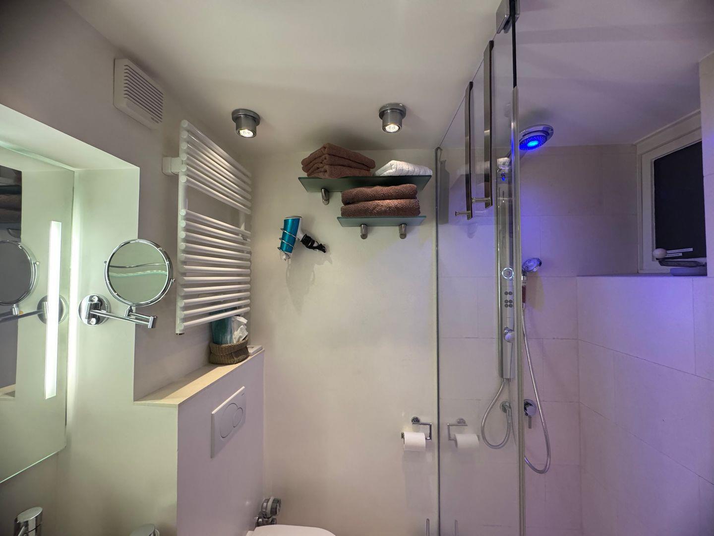 Hier können Sie nach einem erlebnisreichen Tag am Strand oder dem Erkunden der Insel bei geöffnetem Fenster mit Meeresrauschen entspannen. Das moderne Badezimmer ist mit große Dusche (mit Farbenspiel), Waschbecken und WC sowie einem Haartrockner, Radio und Kosmetikspiegel ausgestattet und bietet den perfekten Rückzugsort als Ihre persönliche, kleine Wellness-Oase.