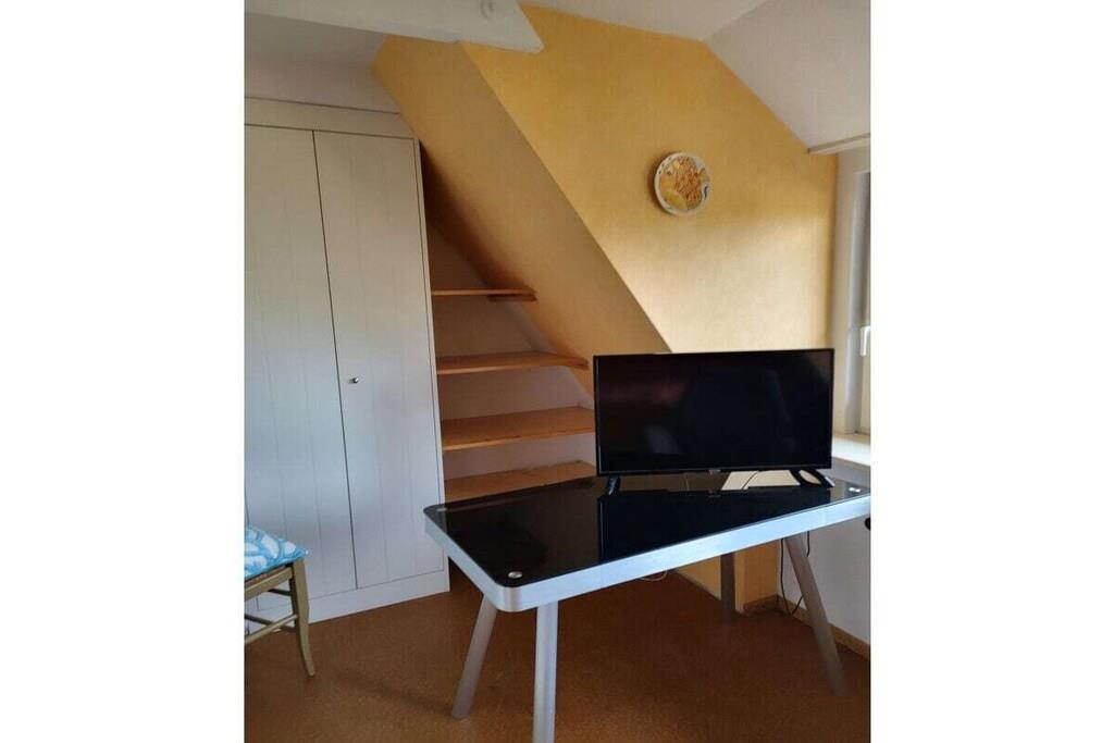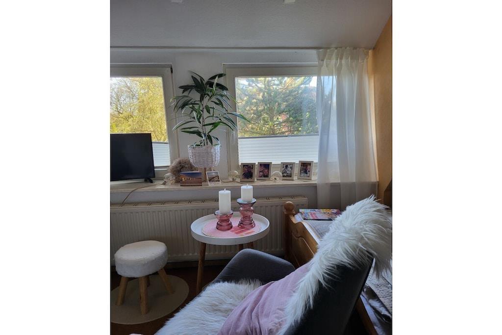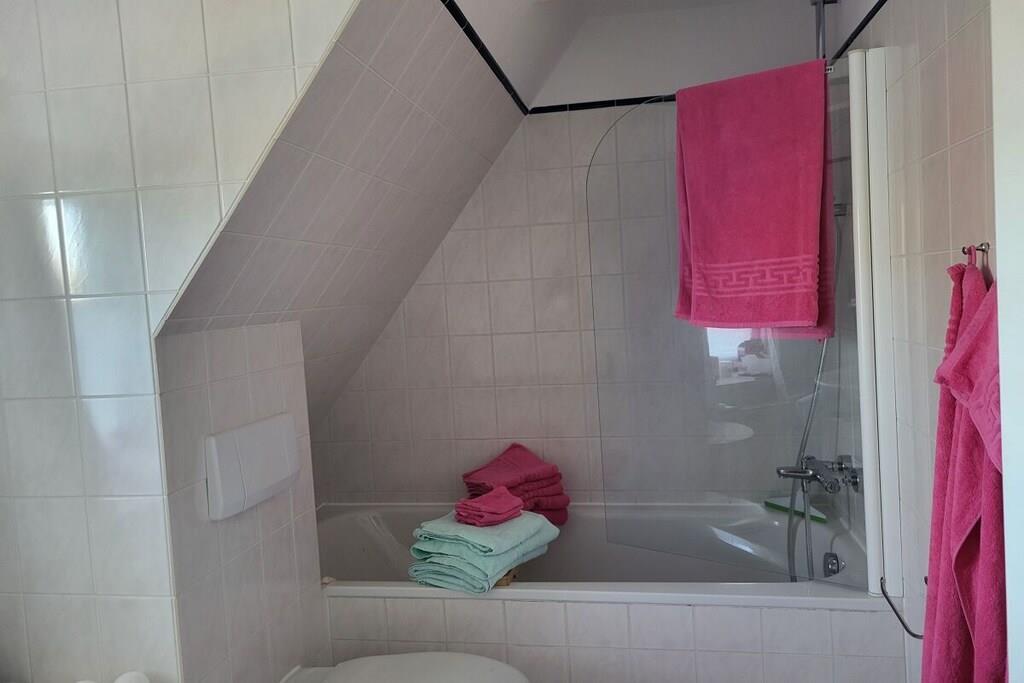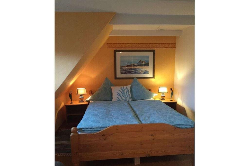 Dobbeltrommet ligger i øverste etasje i ferieleiligheten Tina med stråtak. Det store, lyse rommet er innredet med garderobeskap, dobbeltseng, lite bord, kjøkkenkrok og TV. Et stort, lyst bad ligger rett ved siden av rommet. Du kommer til øverste etasje med egen adkomst via en stor... En parkeringsplass er plassert rett utenfor inngangsdøren. Ideell beliggenhet, rolig, men likevel veldig sentral, med alle supermarkeder innen gangavstand. Store enger er i umiddelbar nærhet. Flere hundevennlige strender ligger kun 5 minutter unna med bil.