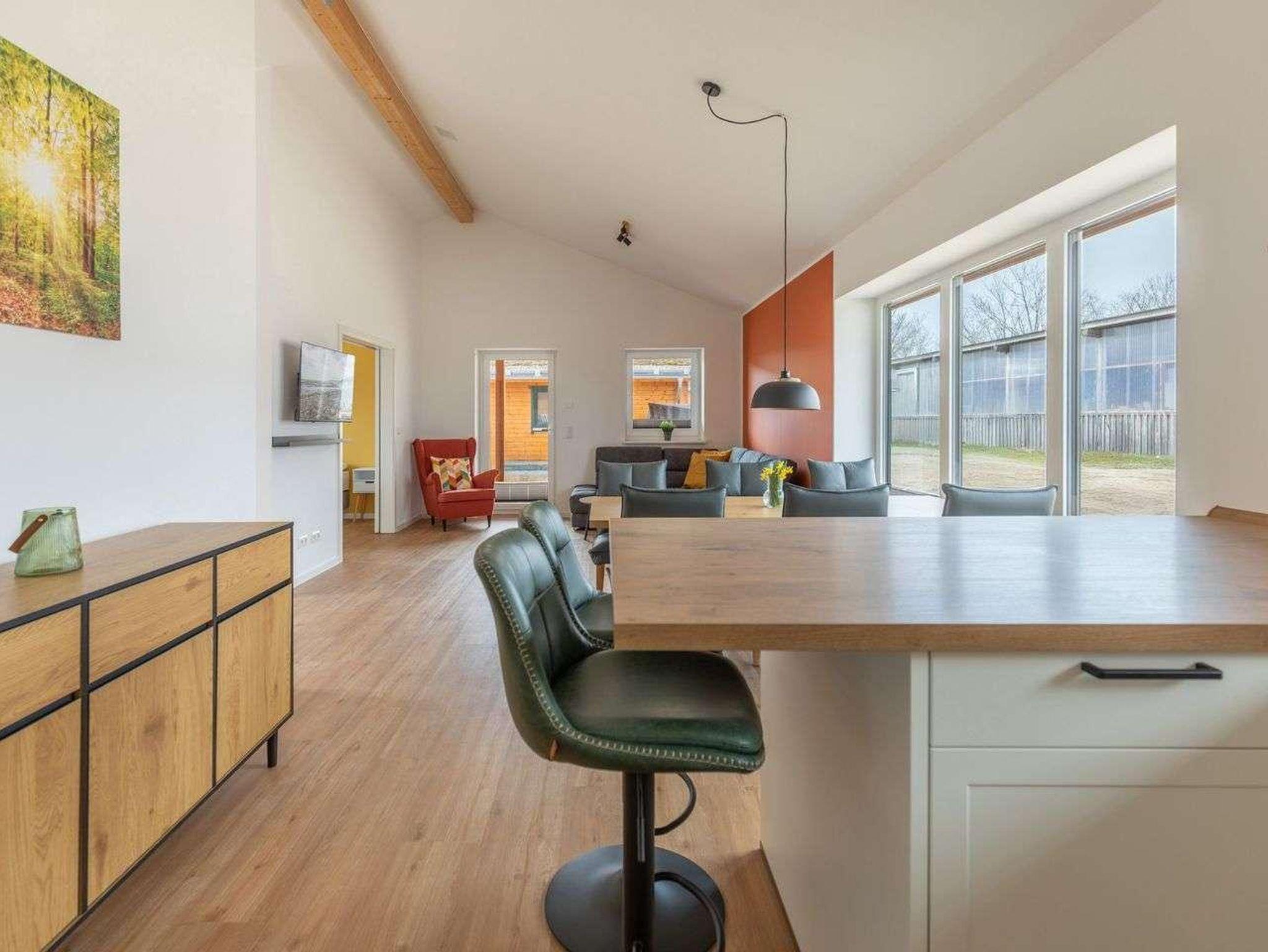 Die offene Küche ist voll ausgestattet mit Induktionskochfeld, Backofen, Mikrowelle, Spülmaschine, Senseo-Kaffeemaschine und Kühlschrank mit Gefrierfach – perfekt für gemeinsame Kochabende. Im gemütlichen Wohnbereich laden eine Sofaecke und ein SMART-Fernseher zum Verweilen ein. Kostenloses, schnelles WLAN hält Sie jederzeit online. Der angrenzende Essbereich bietet ausreichend Platz für alle Gäste.