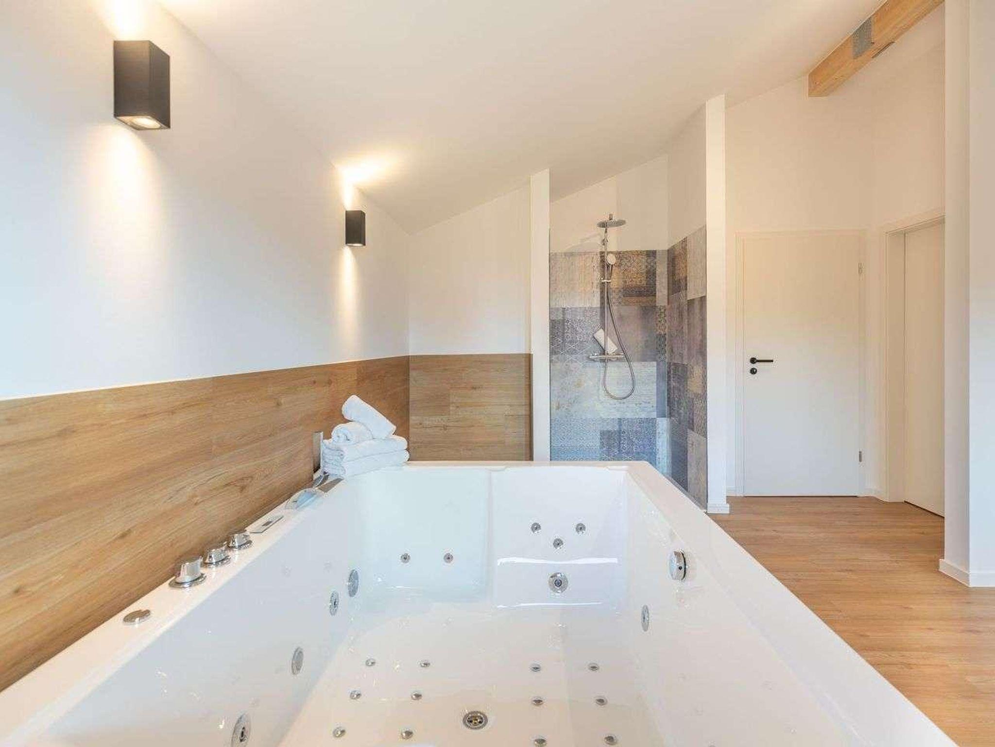 Ein modernes Badezimmer mit bodengleicher Dusche, WC sowie Sauna und einem Whirlpool sorgen für besonderen Komfort. Ein echtes Highlight ist der angrenzende Balkon mit wunderbarer Aussicht über das Katinger Watt!
