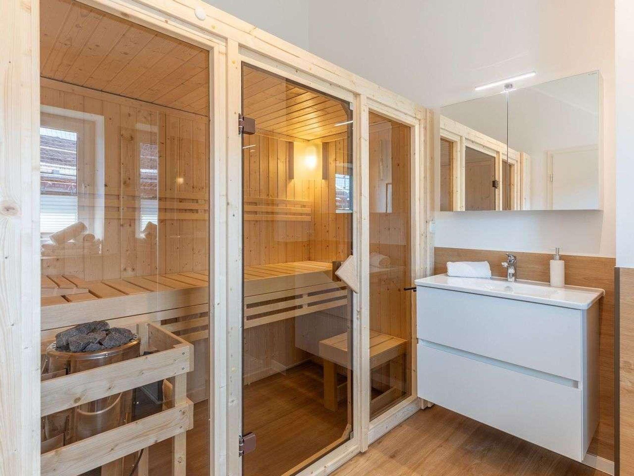 Ein modernes Badezimmer mit bodengleicher Dusche, WC und Sauna sorgen für besonderen Komfort.
