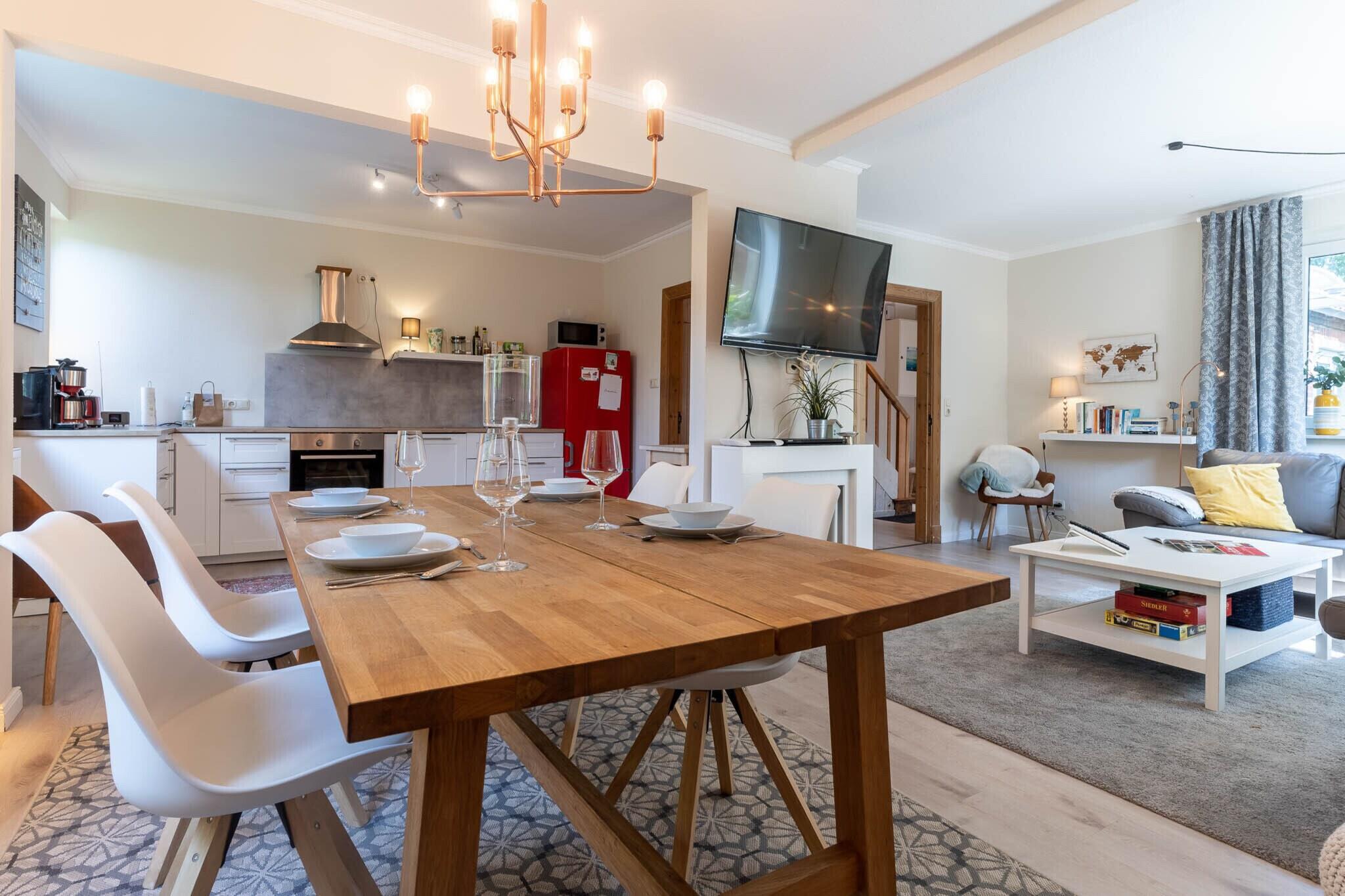 Vakkert, koselig feriehus som kan huse opptil fire personer. Et absolutt høydepunkt er WiFi, som gir deg en rask og pålitelig internettforbindelse. En vaskemaskin er også tilgjengelig. I første etasje finner du en koselig stue-spisestue som inviterer deg til å slappe av. For underholdningen din har du tilgang til en TV med magenta-TV og Netflix via din egen konto. Du finner også et stort utvalg brettspill som skal sørge for moro og godt humør. Feriehusets kjøkken er fullt utstyrt med moderne kjøleskap med fryser, stekeovn, oppvaskmaskin og mikrobølgeovn. I øverste etasje av feriehuset finner du to komfortable soverom. Det første soverommet har en stor dobbeltseng (180 x 200 cm) og i det andre soverommet finner du to enkeltsenger (90 x 200 cm), perfekt for barn eller ekstra gjester. Hagen til feriehuset er fullstendig inngjerdet. Her kan du tilbringe avslappende stunder på terrassen mens du nyter den friske luften og naturen rundt. Fritidsboligen har også en carport-oppstillingsplass og en annen parkeringsplass på eiendommen. Høydepunkter: WiFi, forbruksbaserte energikostnader inkludert, vaskepakke, sluttrengjøring