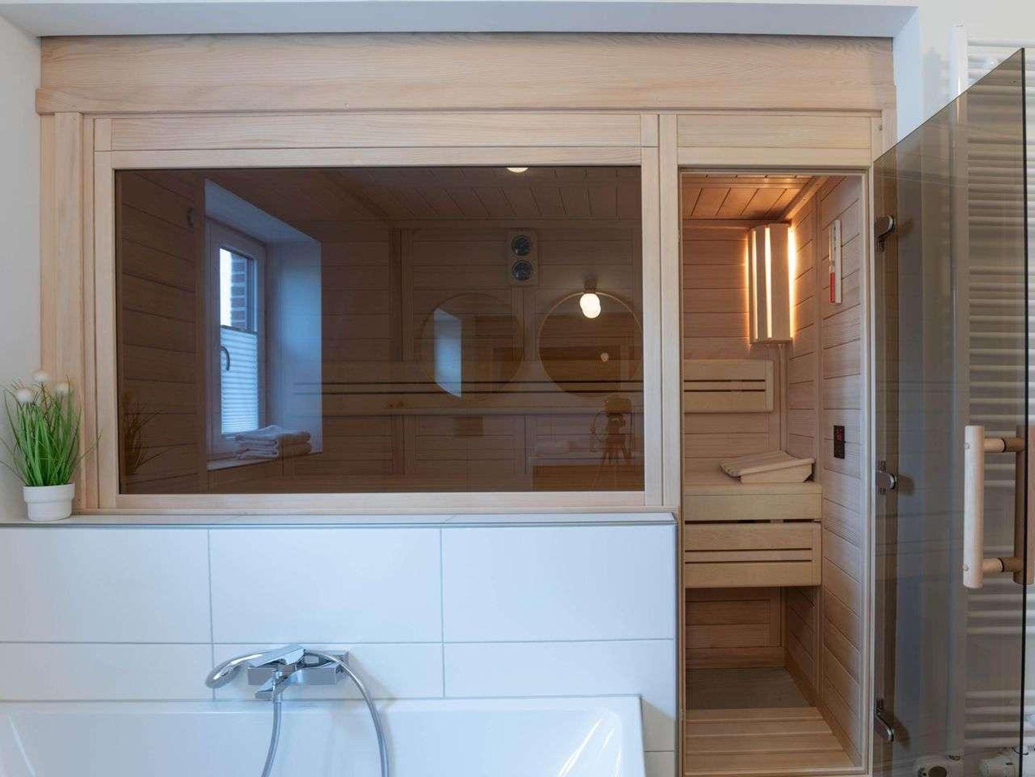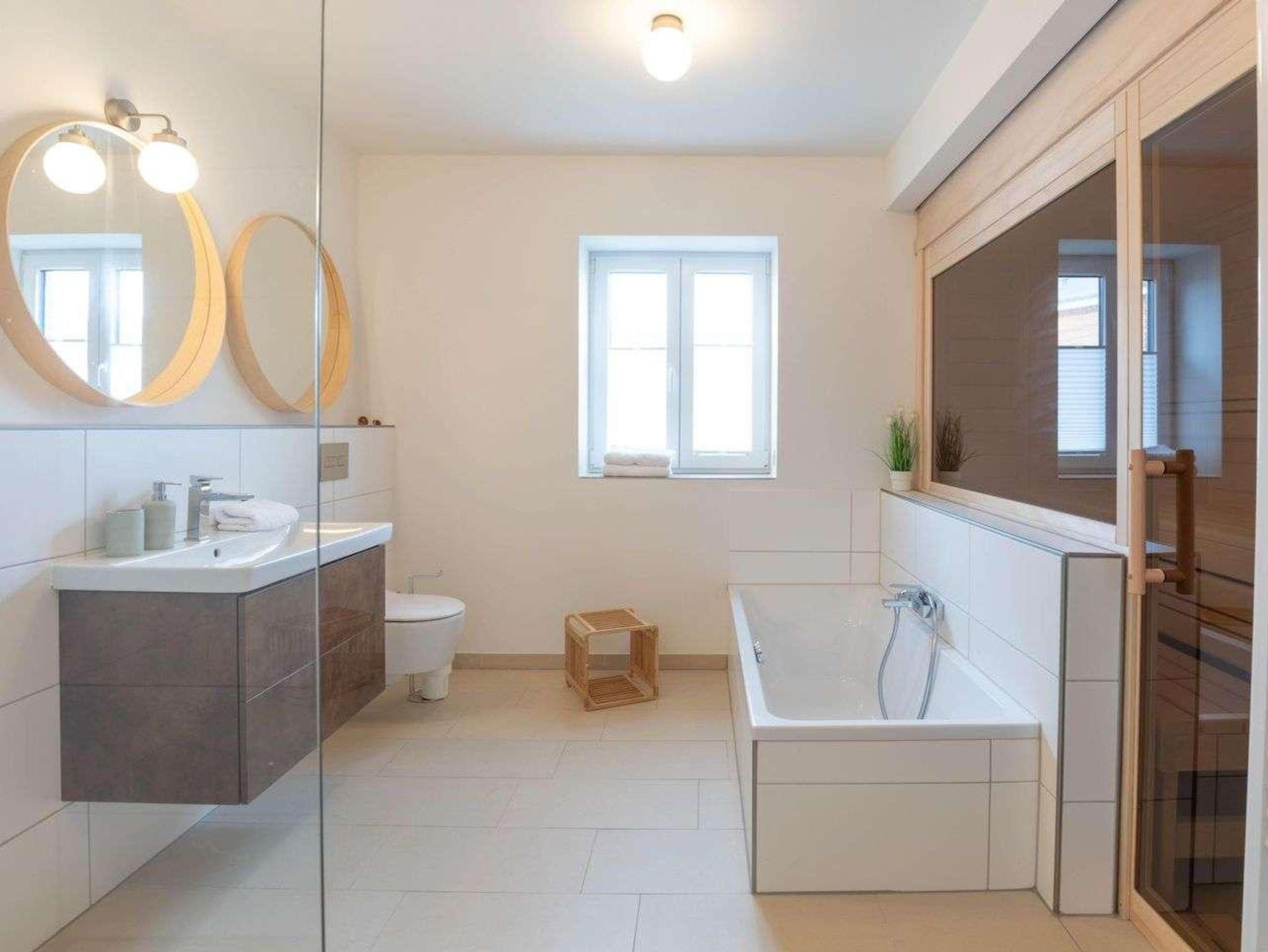 Ein Highlight ist das großzügige Badezimmer mit ebenerdiger Dusche, Badewanne, WC und großer Sauna.