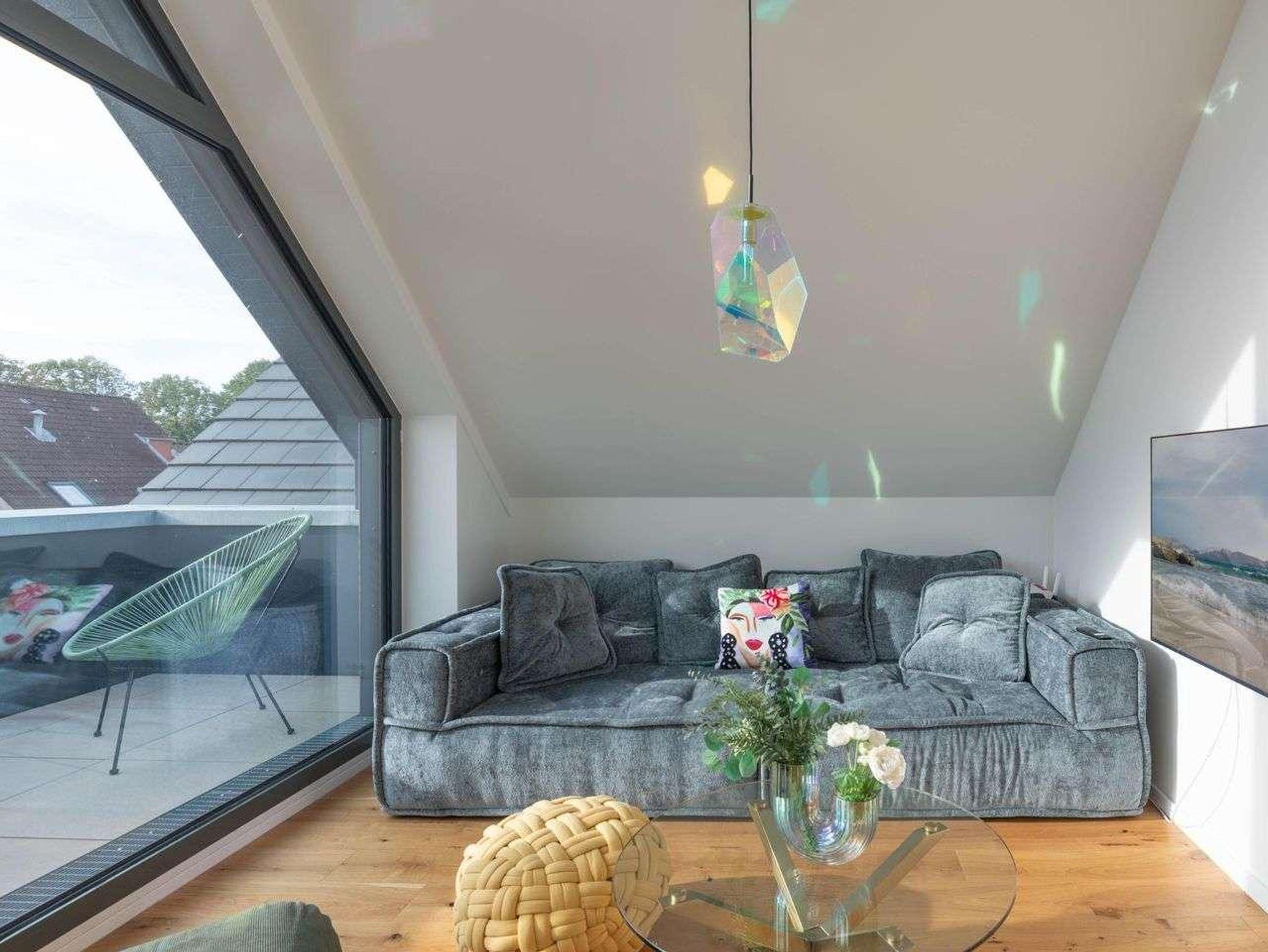 Über eine weitere Treppe erreichen Sie den großzügigen, hellen Wohnbereich mit TV, einer gemütlichen Sofaecke und einem Balkon. Das Masterschlafzimmer verfügt über ein weiteres Doppelbett (180 x 200), einen Balkon und ein Duschbad.