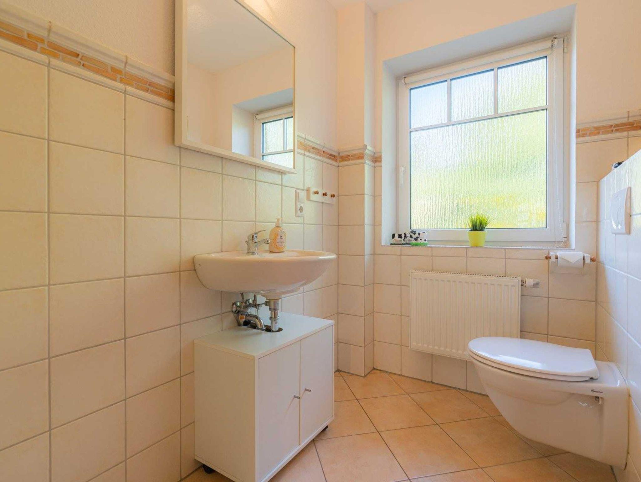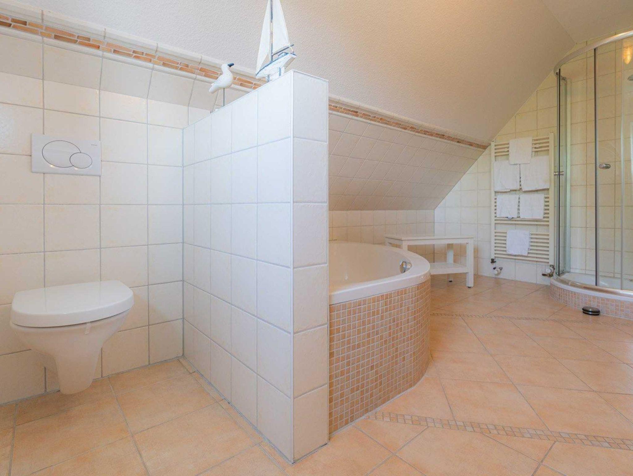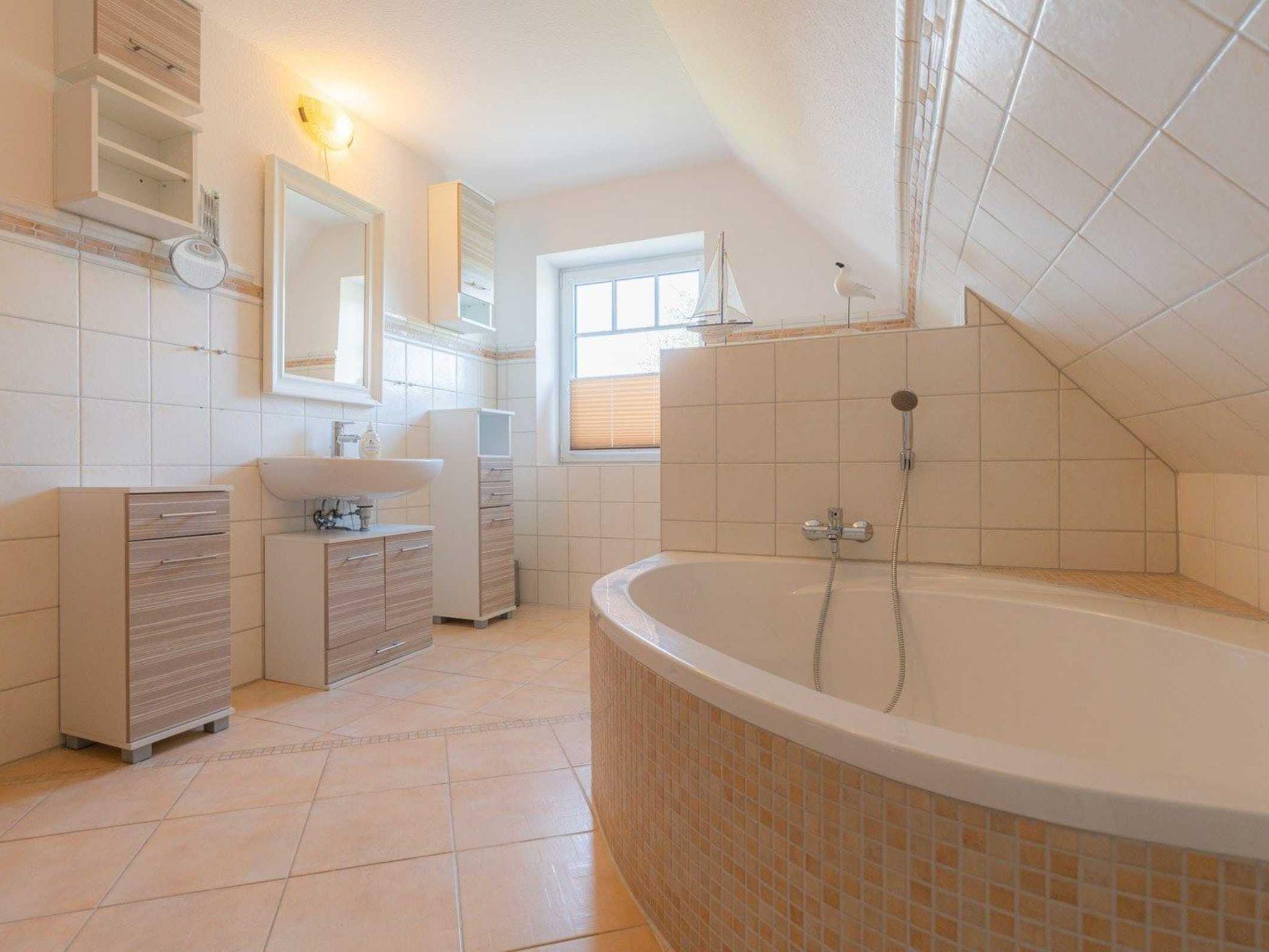 Badezimmer (Vollbad) mit Badewanne, sep. Dusche, WC, Handtuchwärmer, Tageslicht und Föhn.