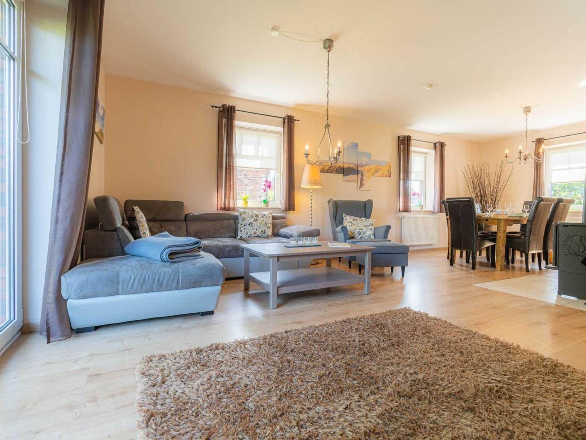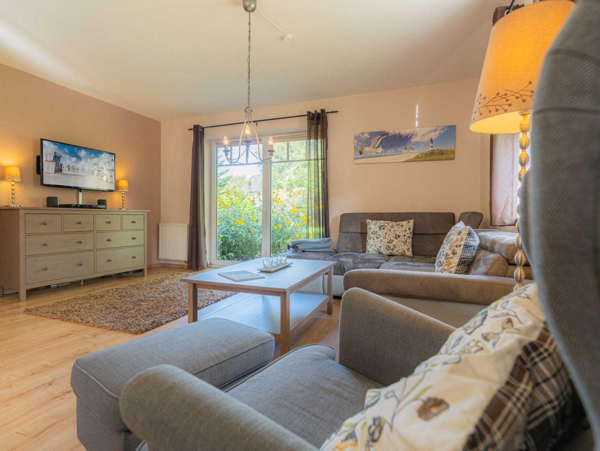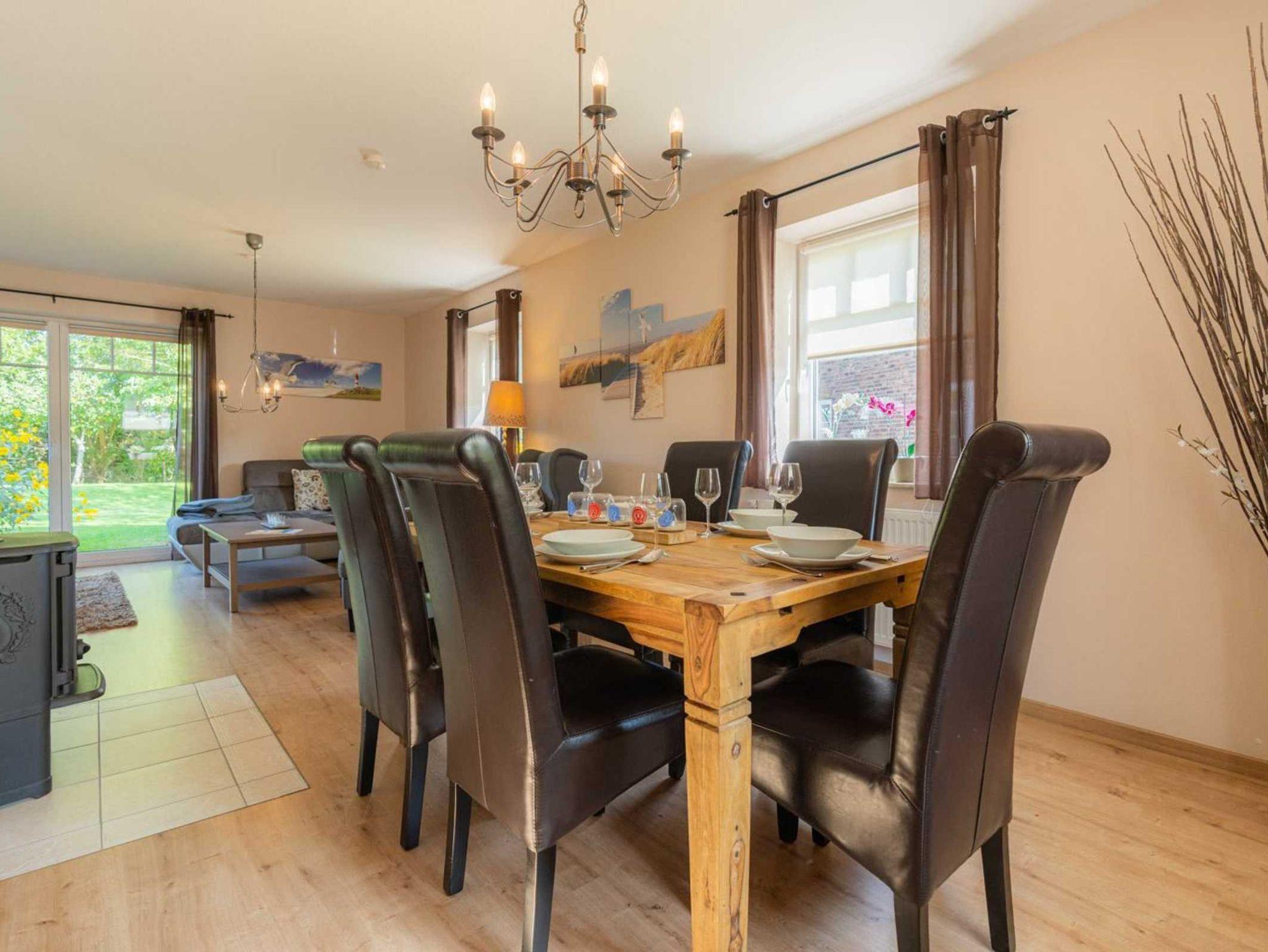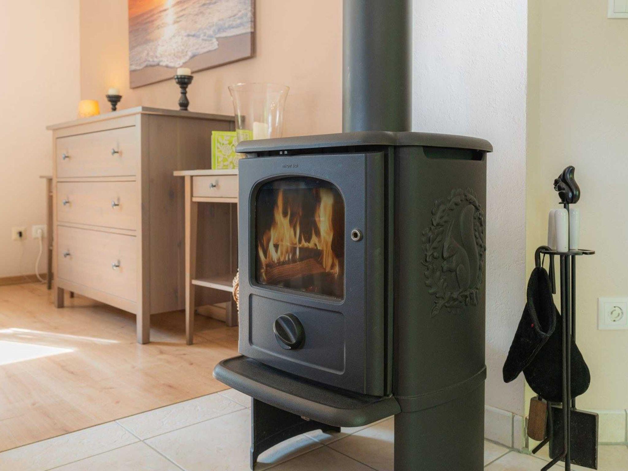 Gemütliches Wohn- und Esszimmer mit großem Ecksofa, einem bequemen Sessel, TV (SAT), BluRay-Player, Bluetooth-Soundanlage und direktem Zugang zur möblierten Gartenterrasse nach Osten. Separater Essbereich mit großem Tisch mit 6 Stühlen und gemütlichem Kaminofen.