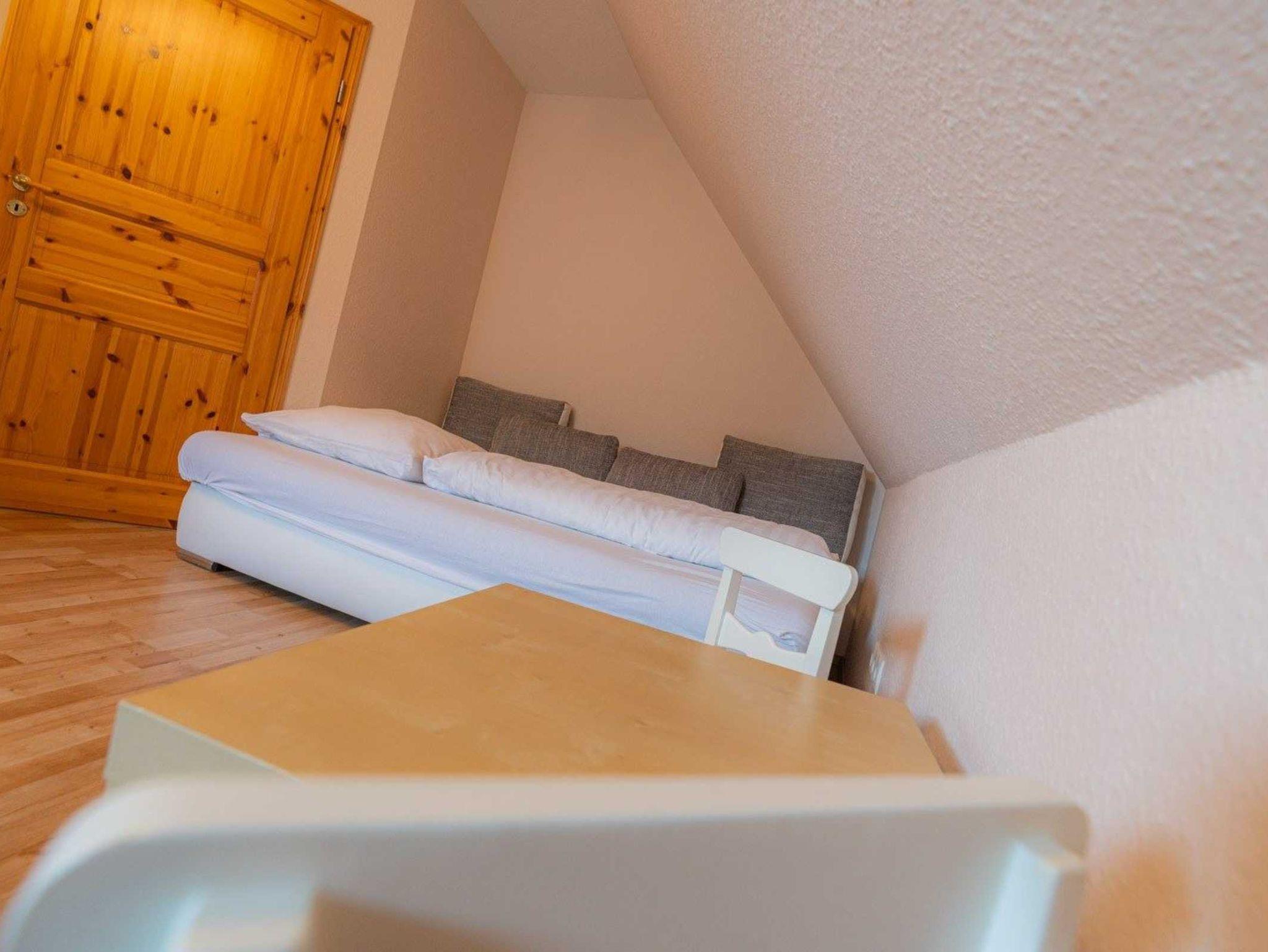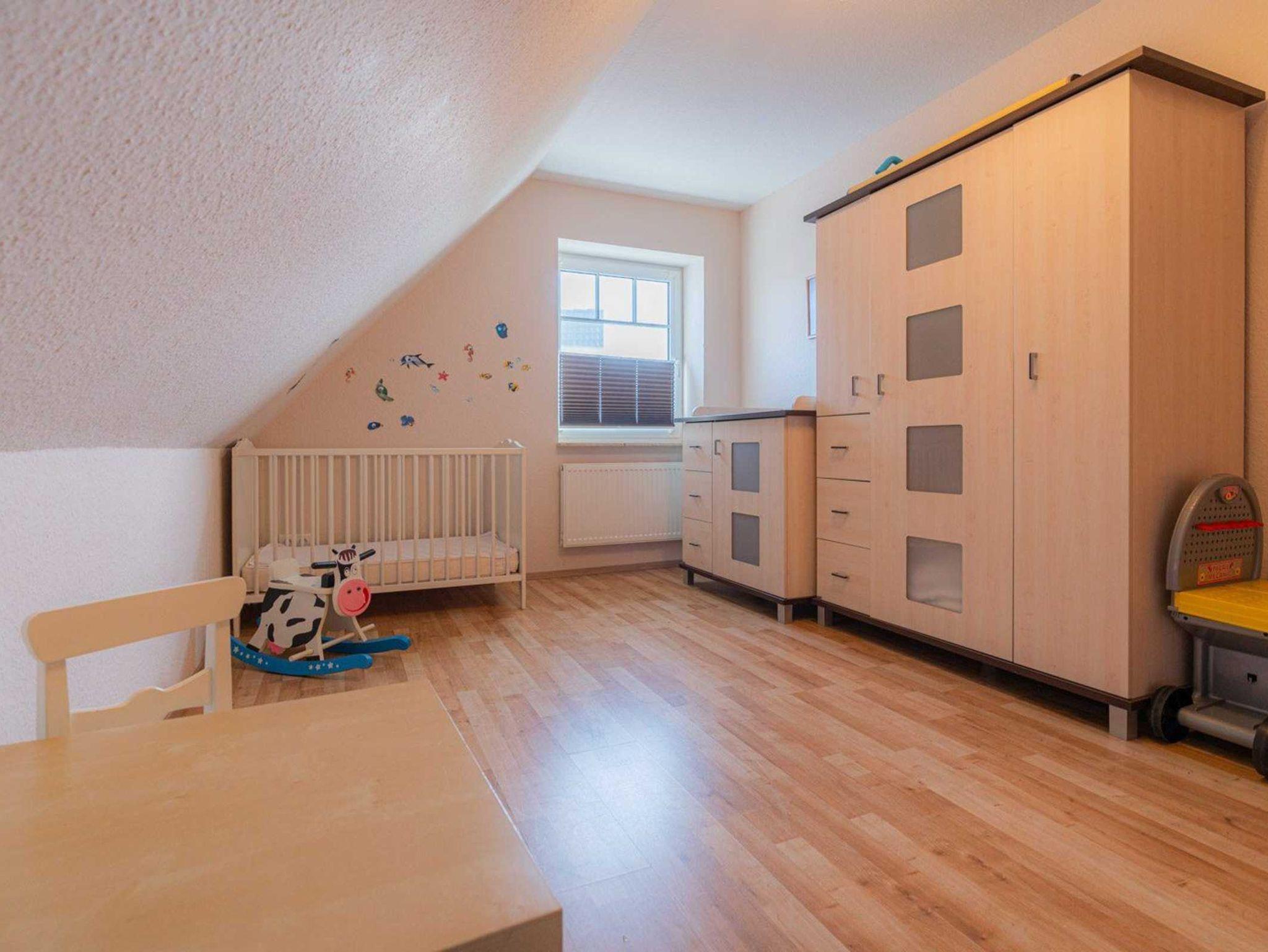 3. Schlafzimmer mit ausklappbarem Schlafsofa (140x190 cm), Kleiderschrank, Kinderbett (60x120), Wickeltisch (ohne Auflage) und Spielzeug. Kinderbettzeug wird nicht gestellt.